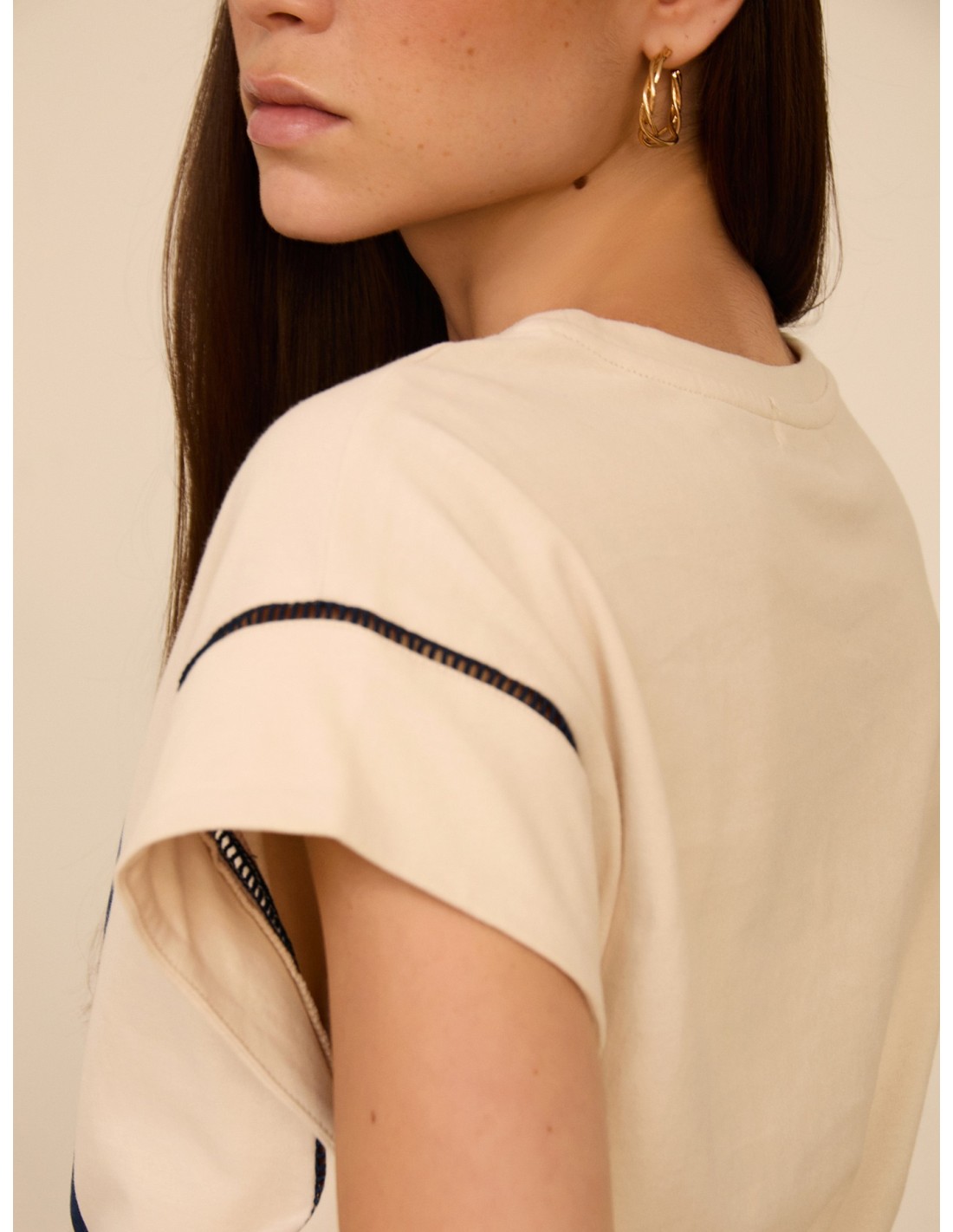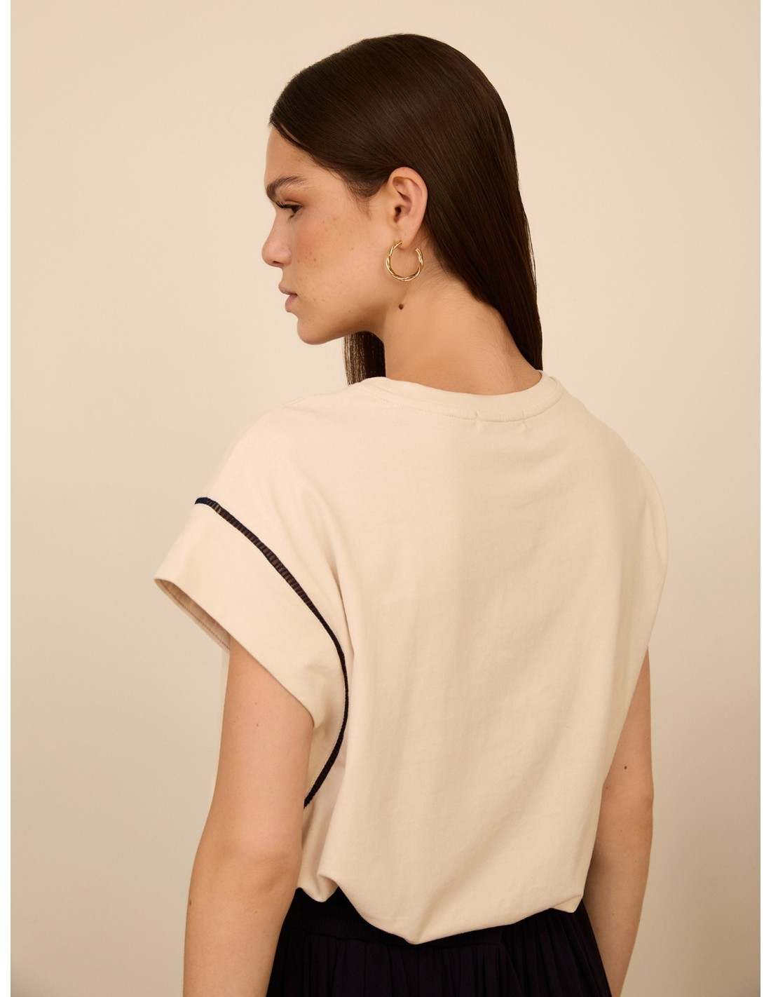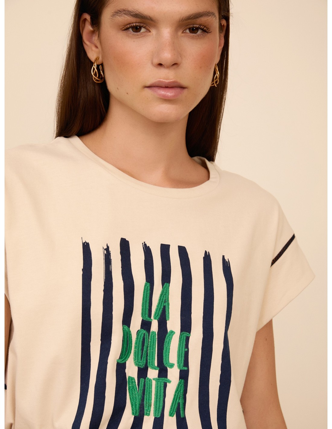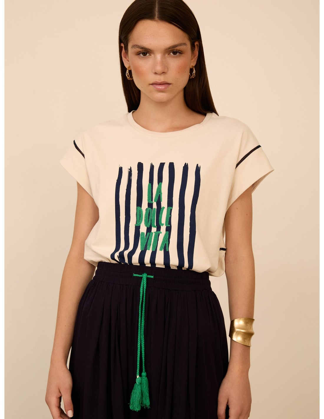 CAMISETA M/C CRUDA MANGA CON VIVO Y DIBUJO MARINO/VERDE LA DOLCE VITA