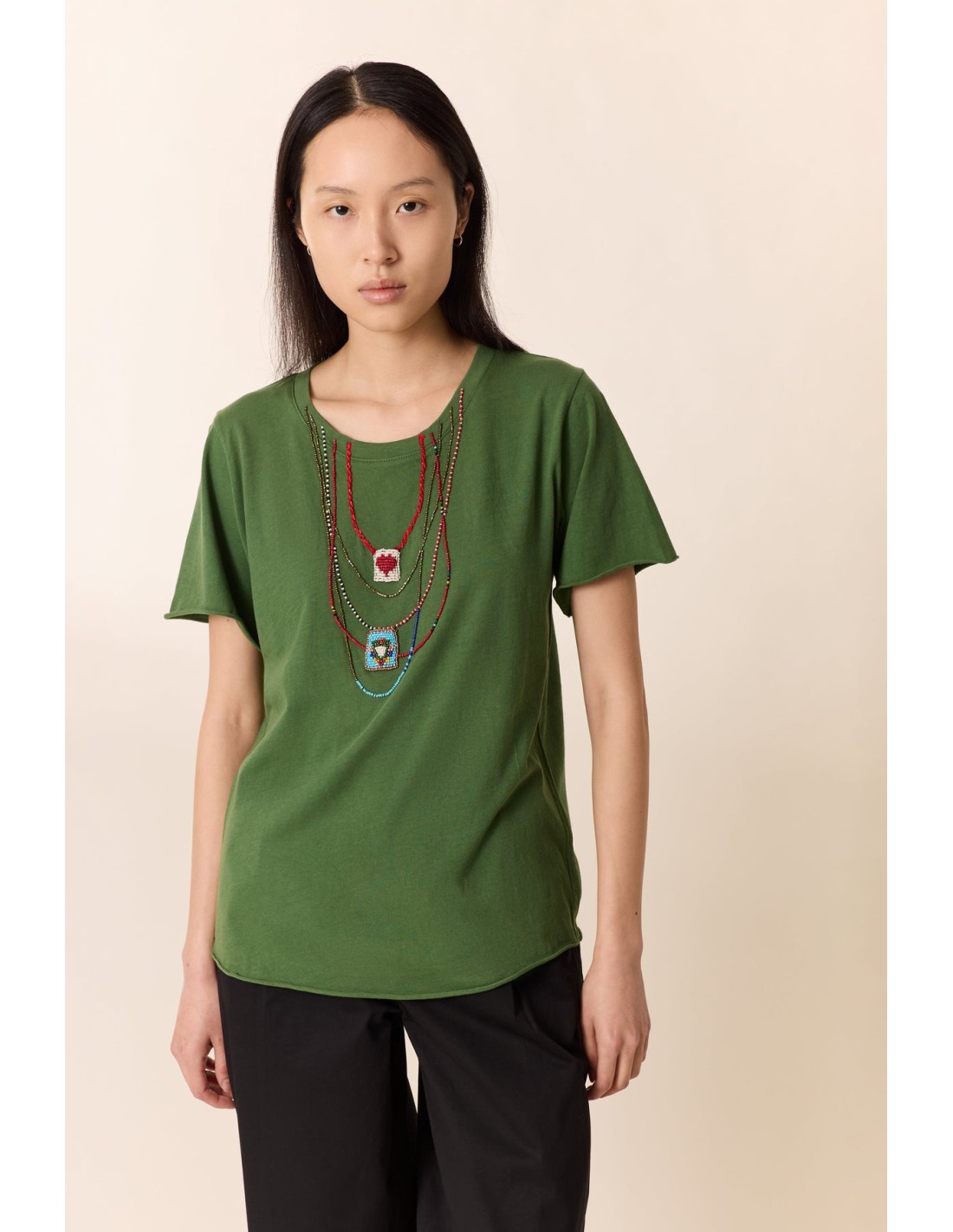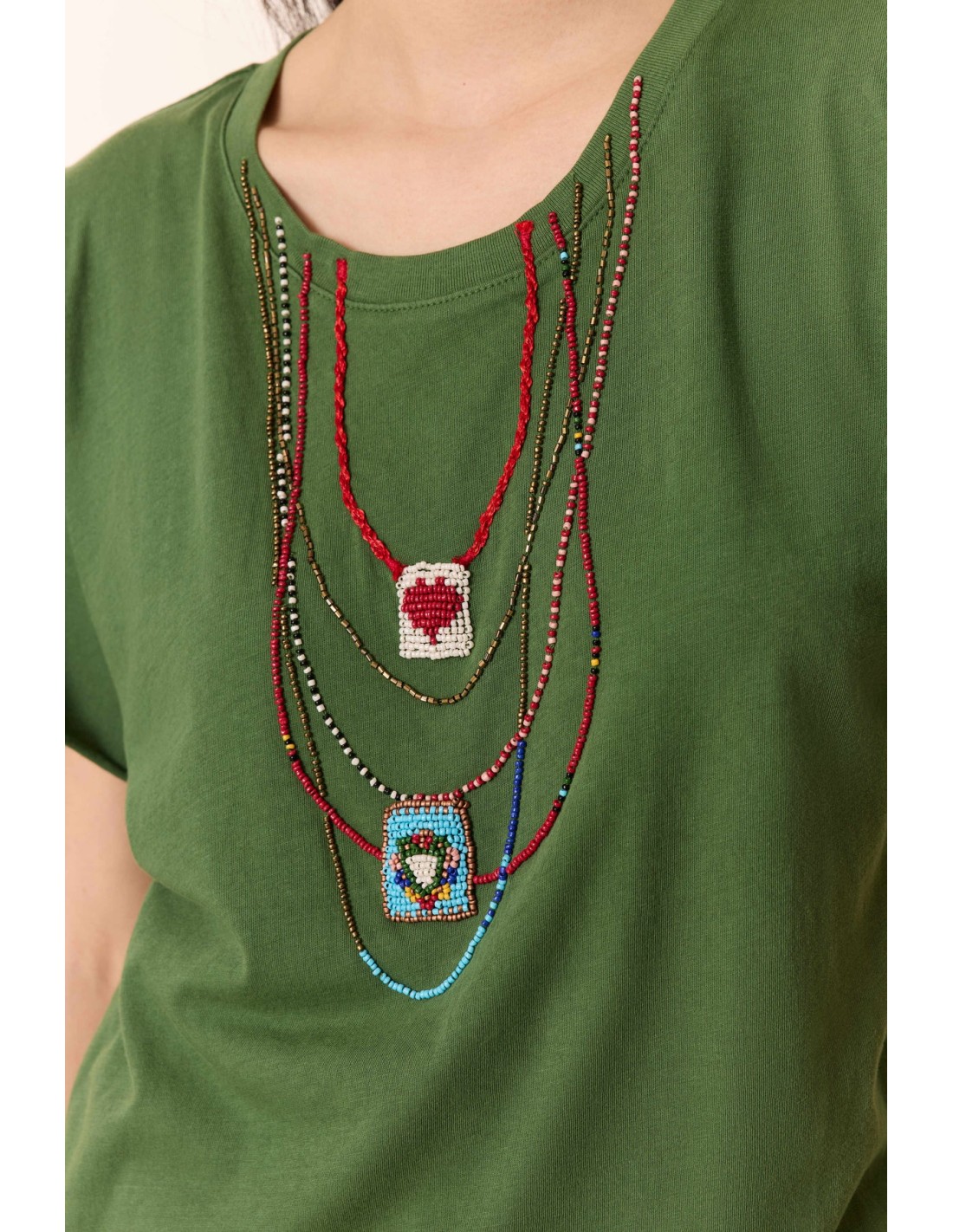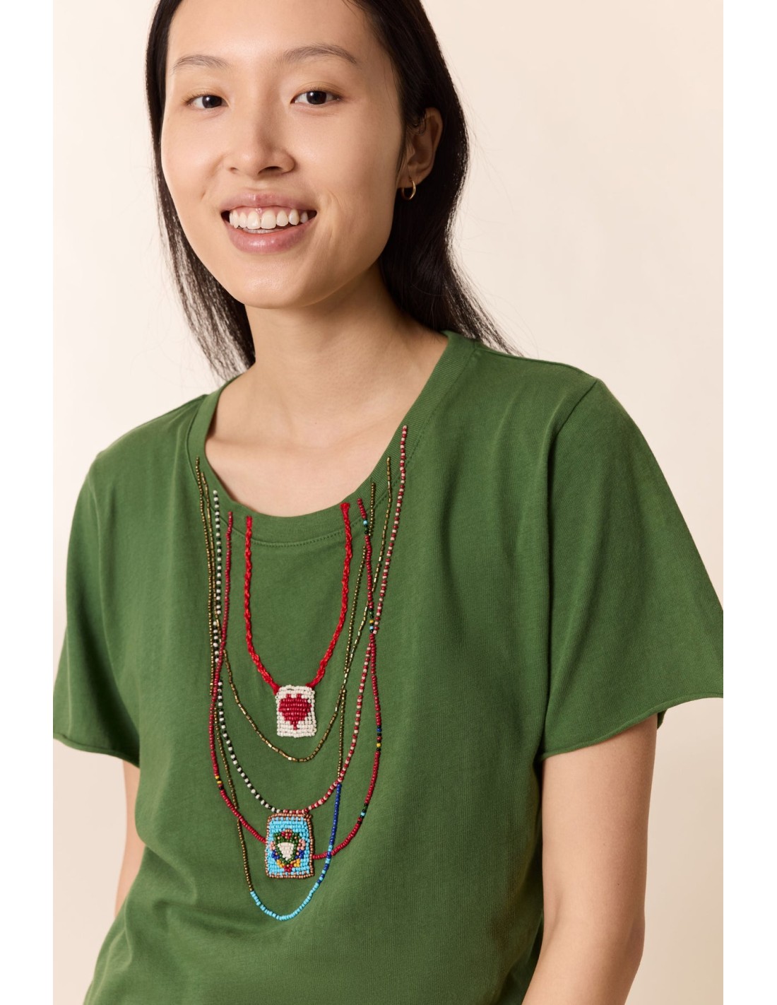 la camiseta Toro Summer de a León & Harper Capta el espíritu ligero y veraniego. Los collares de pedrería bordados, decorados con un corazón rojo y un medallón, aportan un toque atrevido a la pieza. Cada detalle gráfico evoca una joya acumulada en la piel. Úselo para alegrar la mezclilla o short e inculcar un espíritu bohemio.