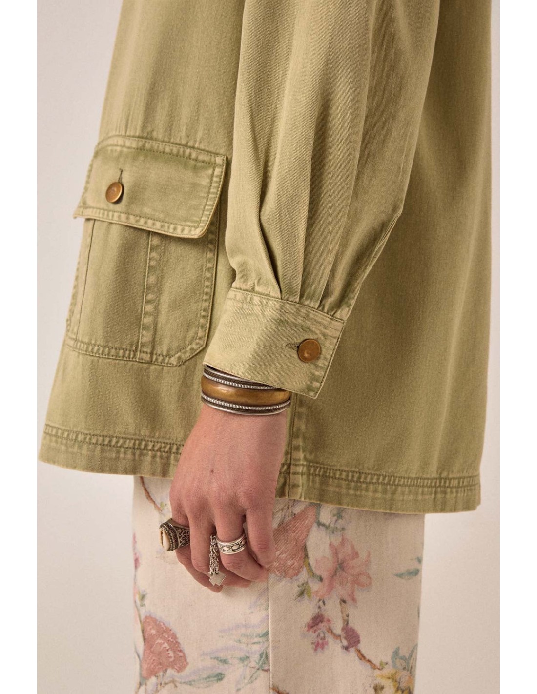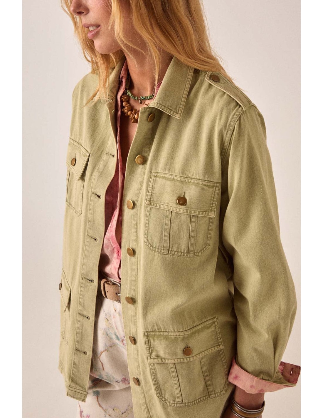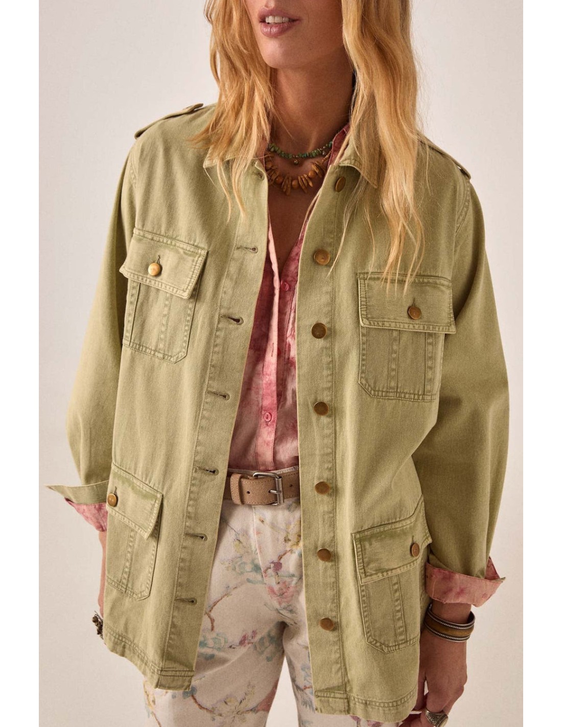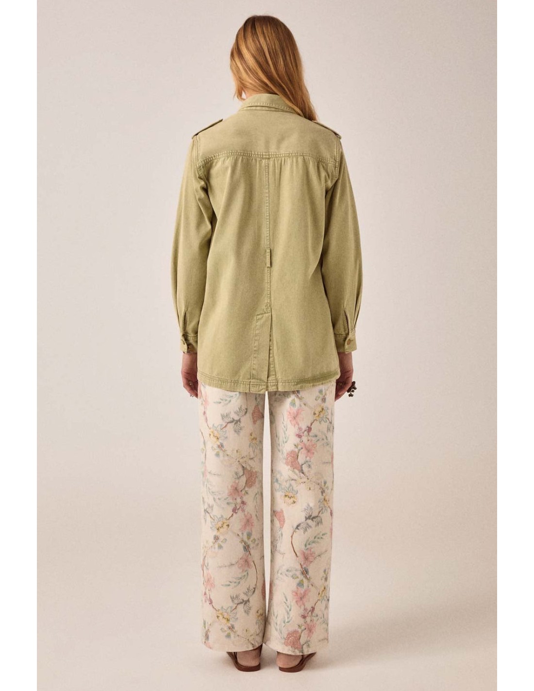 Chaqueta de cuatro bolsillos en sarga de algodón color caqui desteñido. Cuello clásico, charreteras en los hombros y botones en tono madera en la parte delantera. Dos bolsillos en el pecho con solapas y dos bolsillos de parche inferiores. Mangas largas con puños abotonados. Longitud hasta la mitad del muslo.