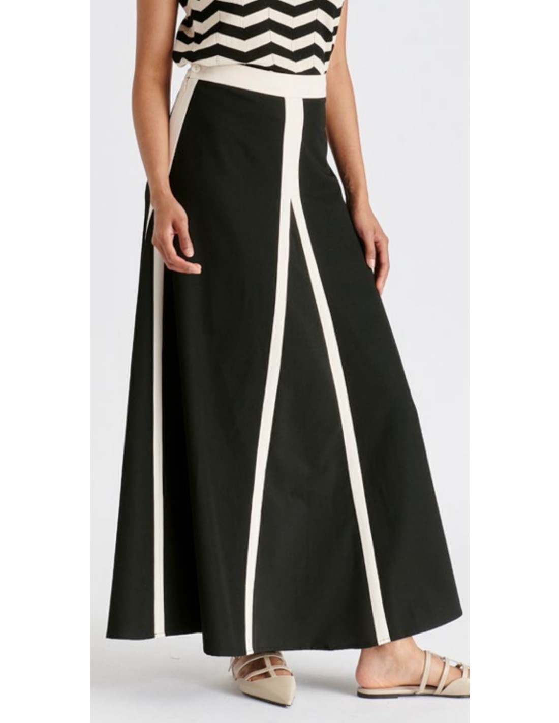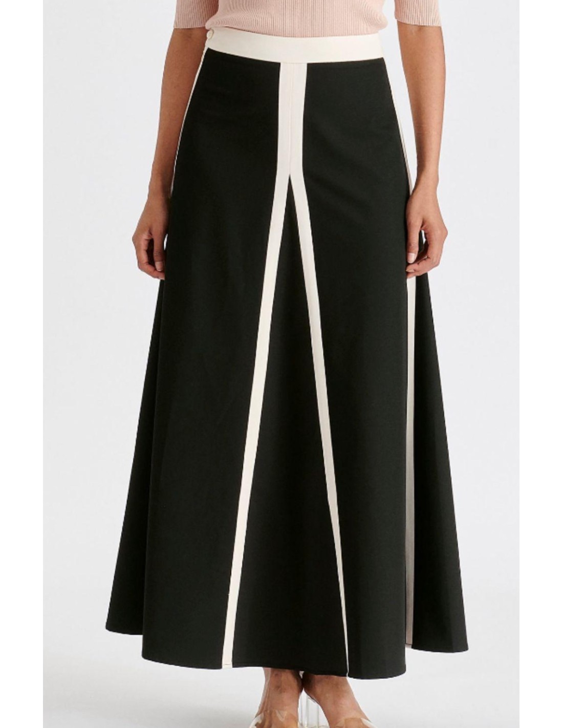 Esta falda mixta de corte A está confeccionada en una mezcla de viscosa y poliéster resistente a las arrugas, realzada con ribetes monocromáticos que realzan su diseño distintivo. Cuenta con un cierre de cremallera lateral para un acabado impecable.