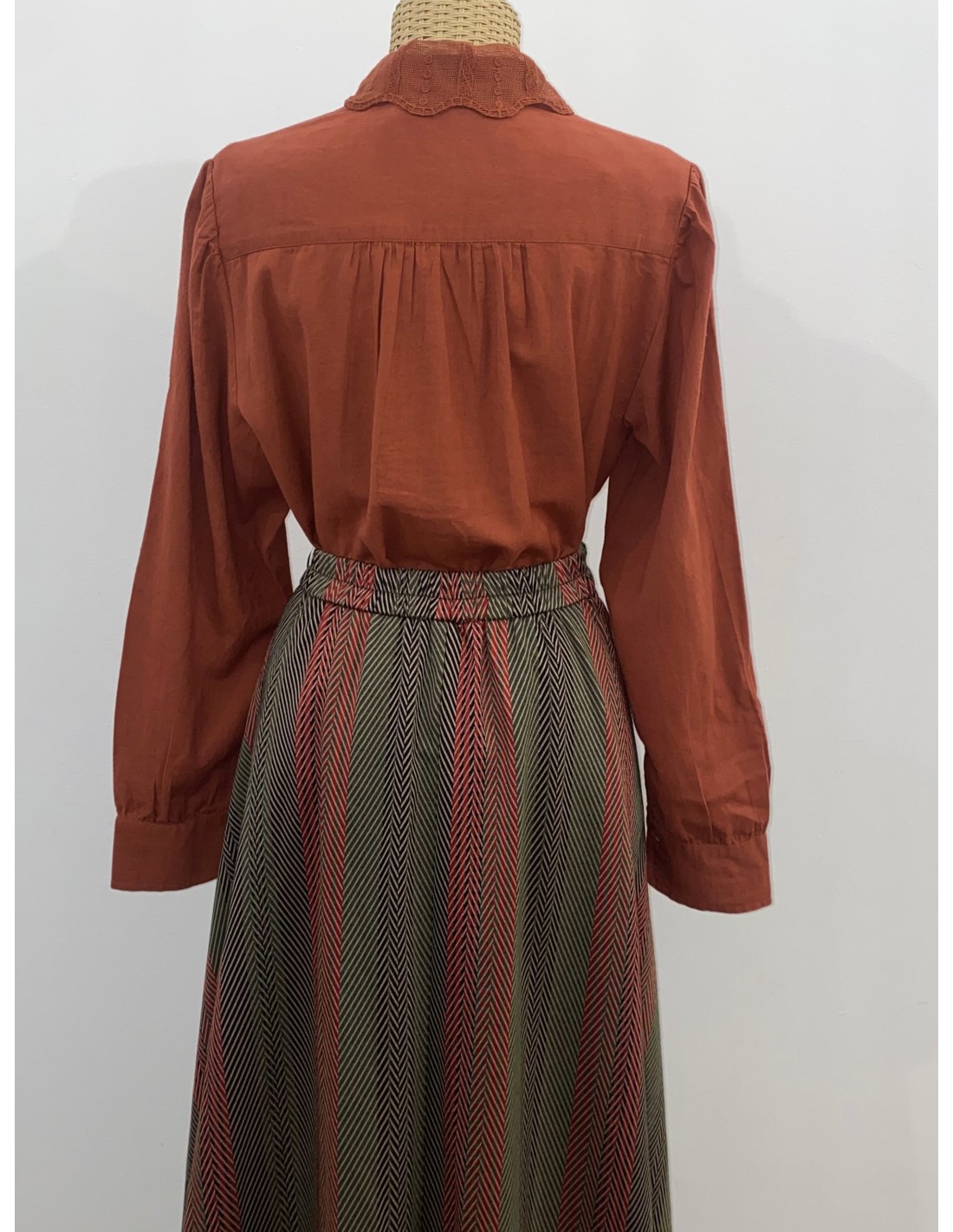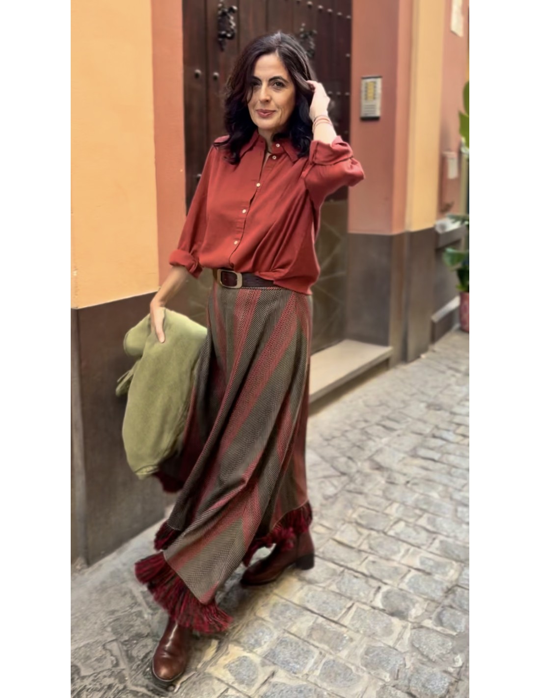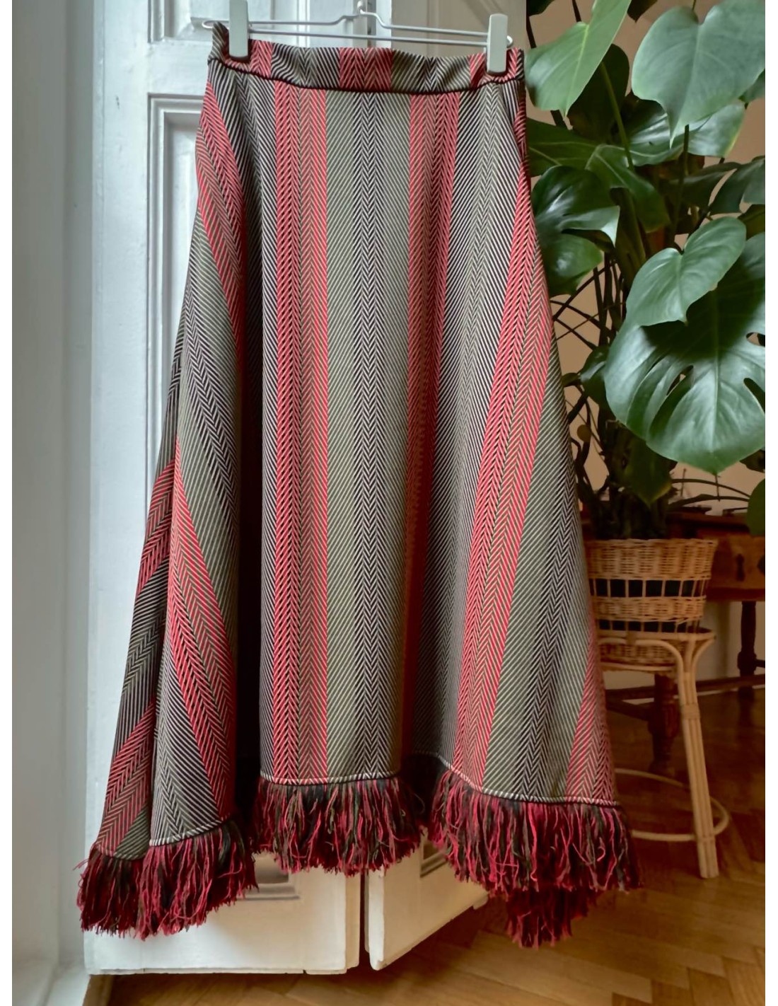 FALDA EN JACQUARD DE ESPIGAS MULTITONO CON CINTURILLA ELÁSTICA EN LA PARTE TEASERA. ES ASIMÉTRICA QUEDANDO MÁS LARGA A LOS DADOS Y VA ACABADA EN FLECO.