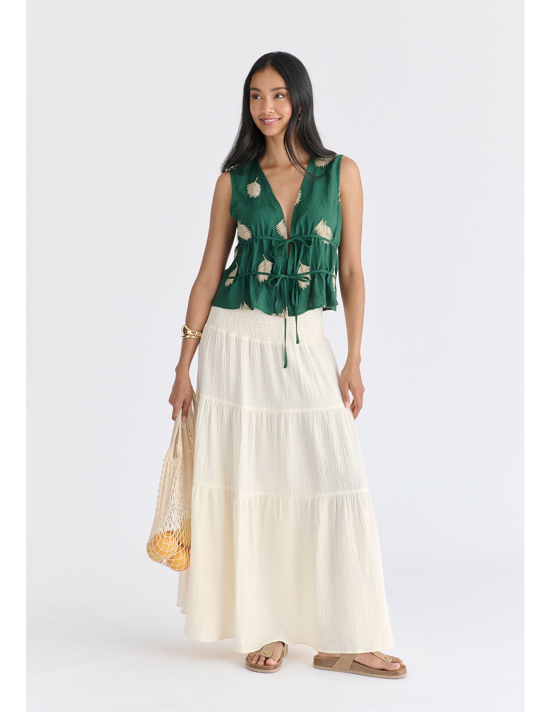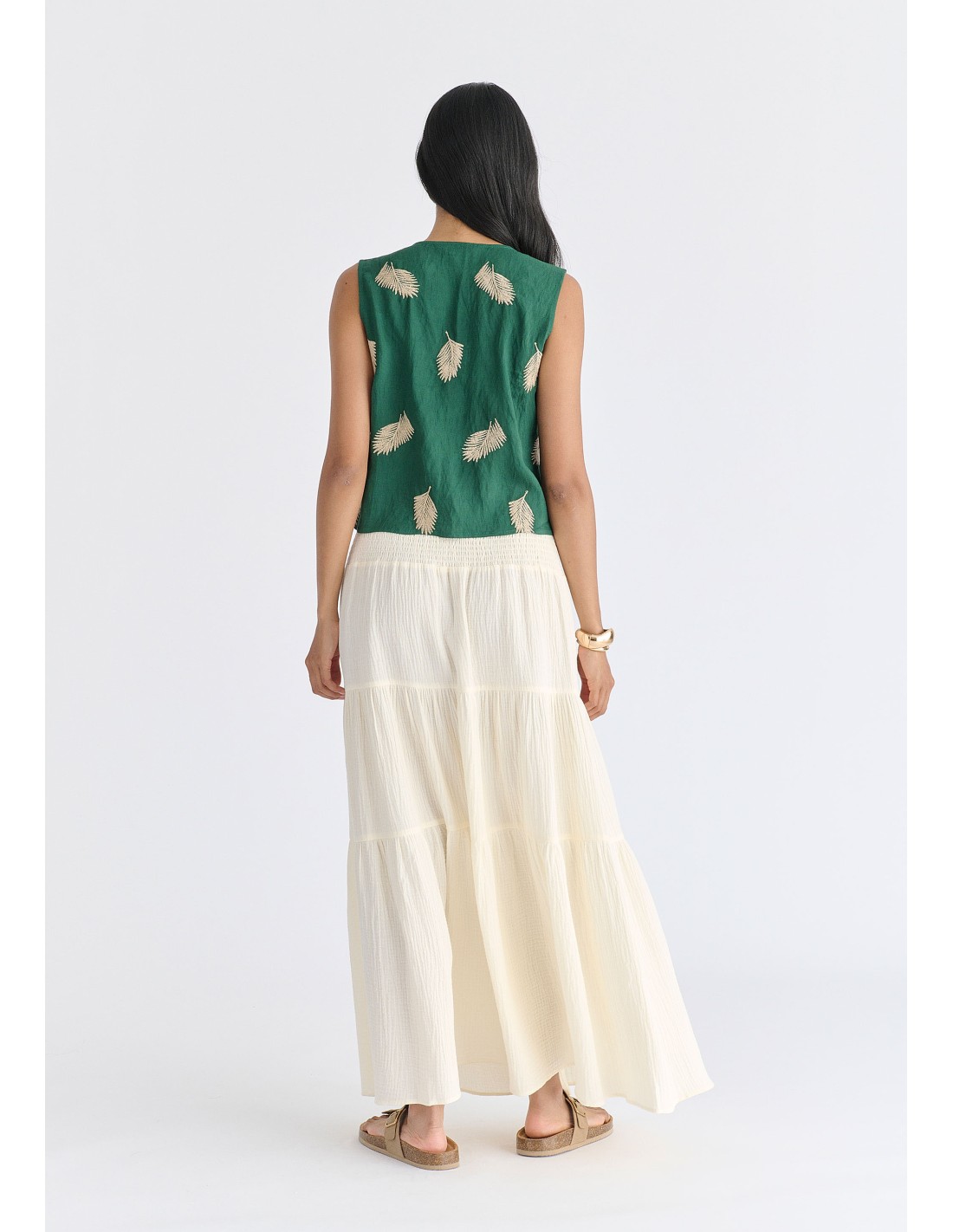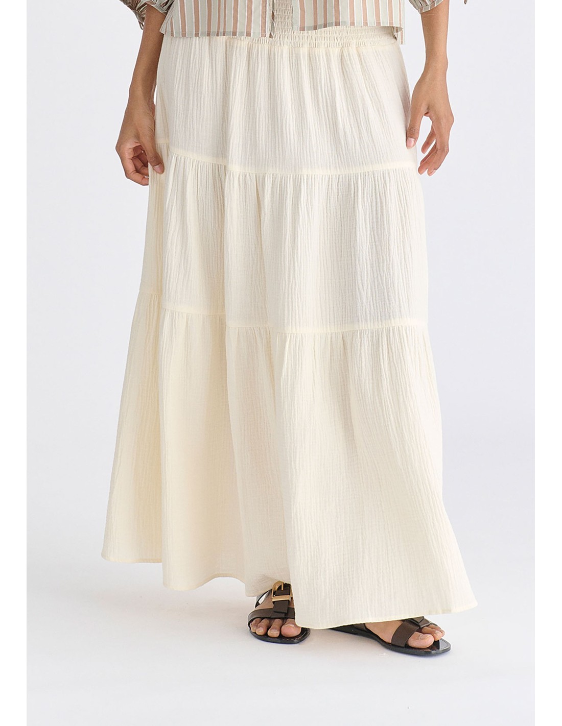 Falda larga escalonada de gasa con cinturilla ancha elástica