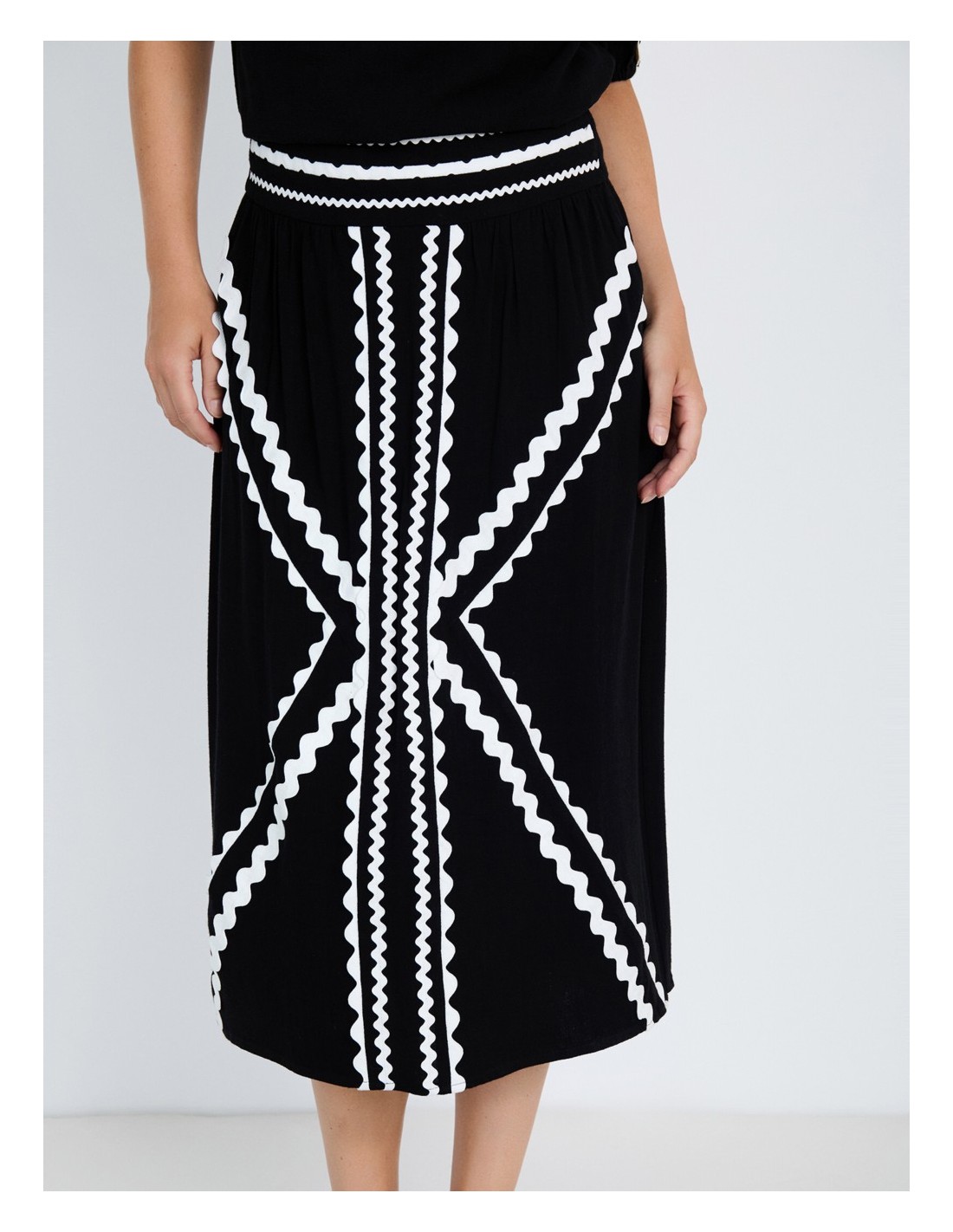 FALDA CON CINTURILLA Y FRUNCE CON DIBUJO GEOMÉTRICO CON CINTA EN CONTRASTE CRUDO