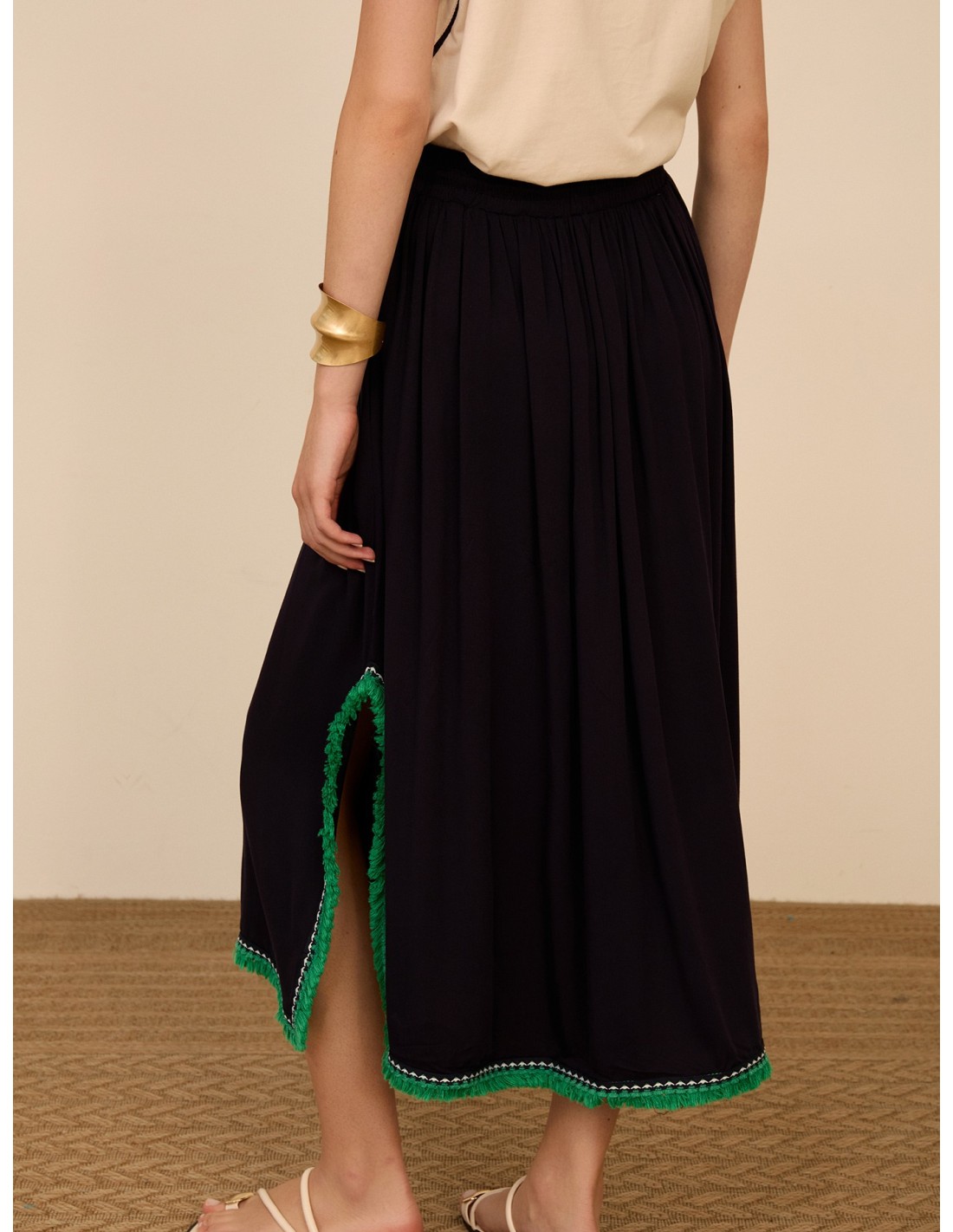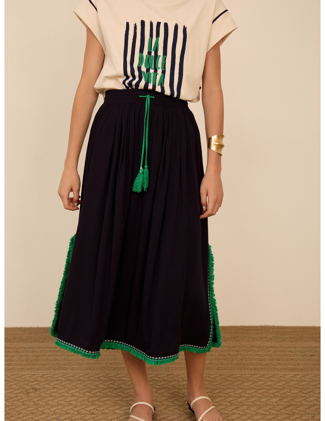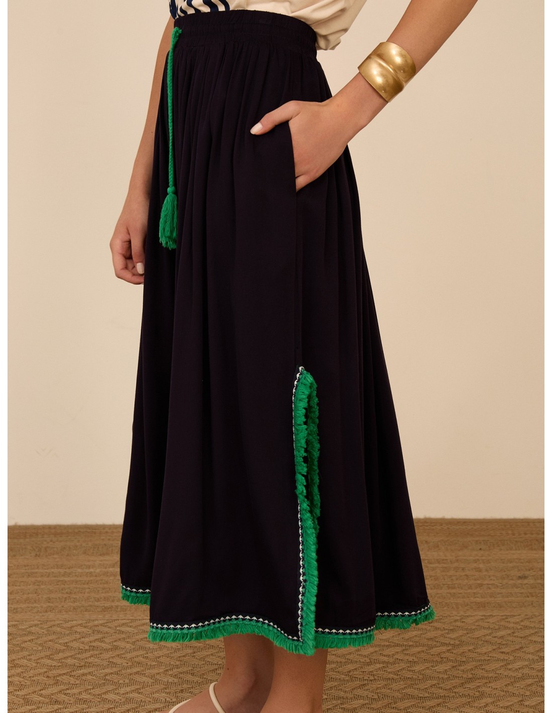 FALDA CINTURILLA ELÁSTICA FRUNCIDA EN MARINO REMATADA CON COSNTRASTES DE CROCHÉ VERDE, 100% VISCOSA - MEISIE