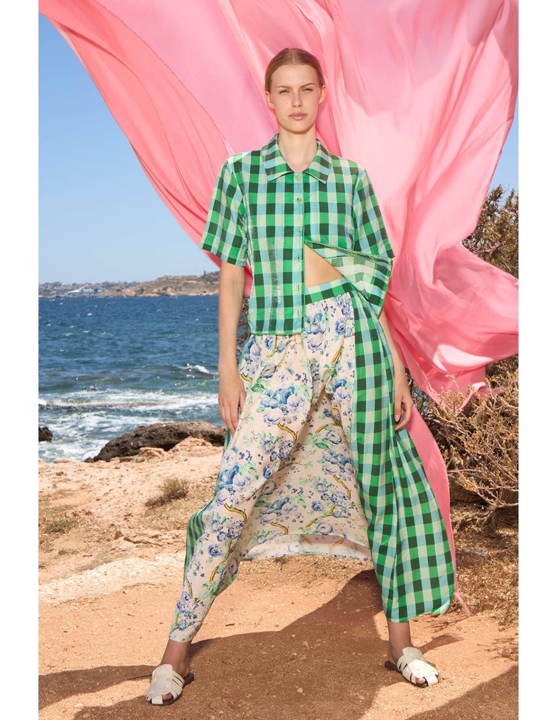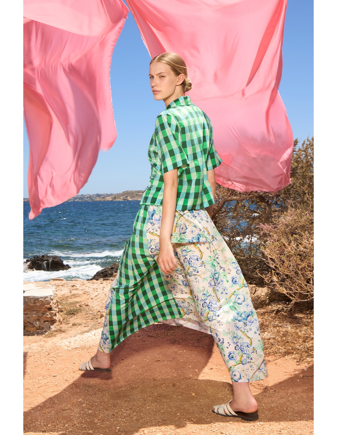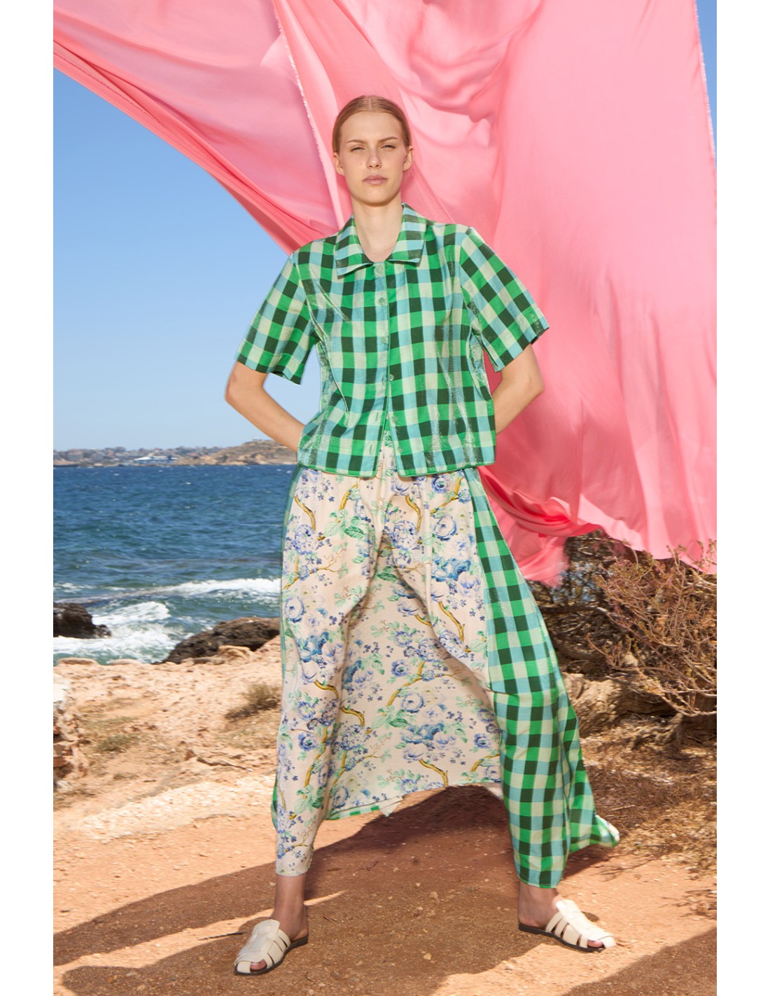 Su diseño destaca por la fusión de estampados: delicados motivos florales en tonos suaves se combinan con paneles de cuadros vichy en verde, creando un contraste moderno y sofisticado. La silueta amplia aporta comodidad y libertad de movimiento, mientras que los detalles asimétricos elevan el look con un toque artístico y original.
