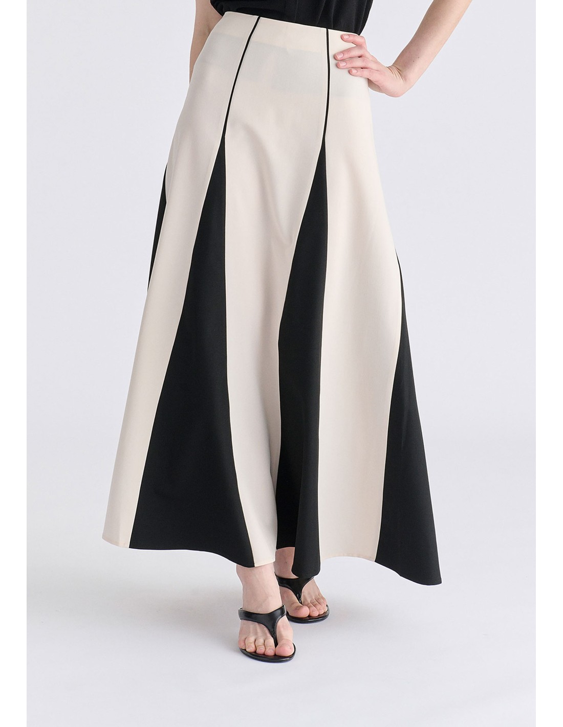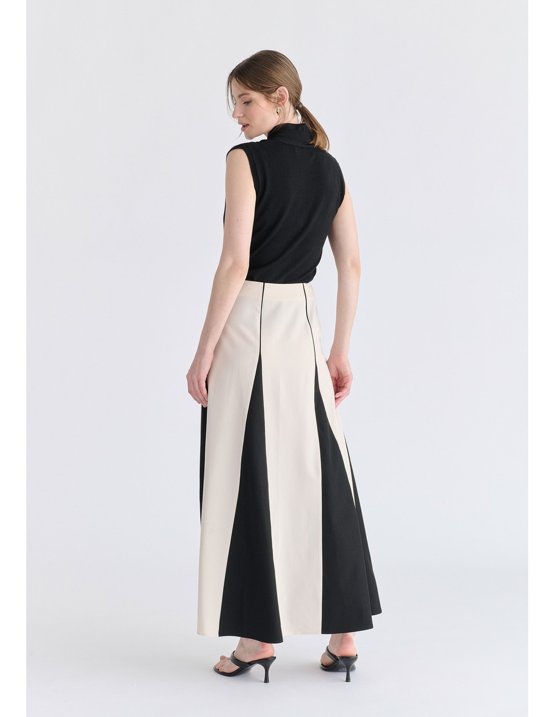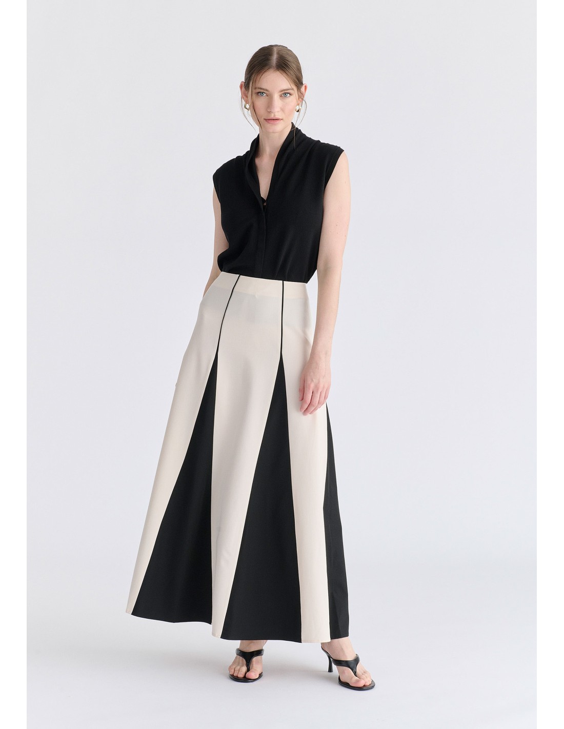 Falda larga, sin cinturilla en tonos beige y negro, con cortes en contraste de Paisie London. La talla 8 equivale a 36/38, la 10/40, 12/42, y la 14 equivale a una talla 44.