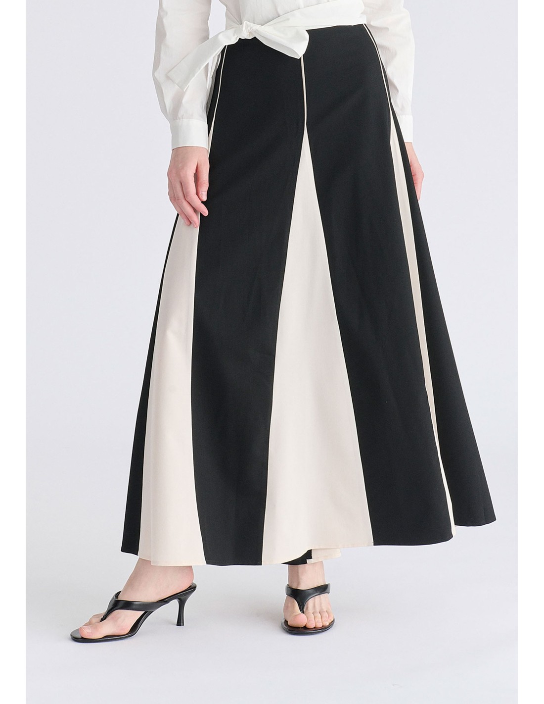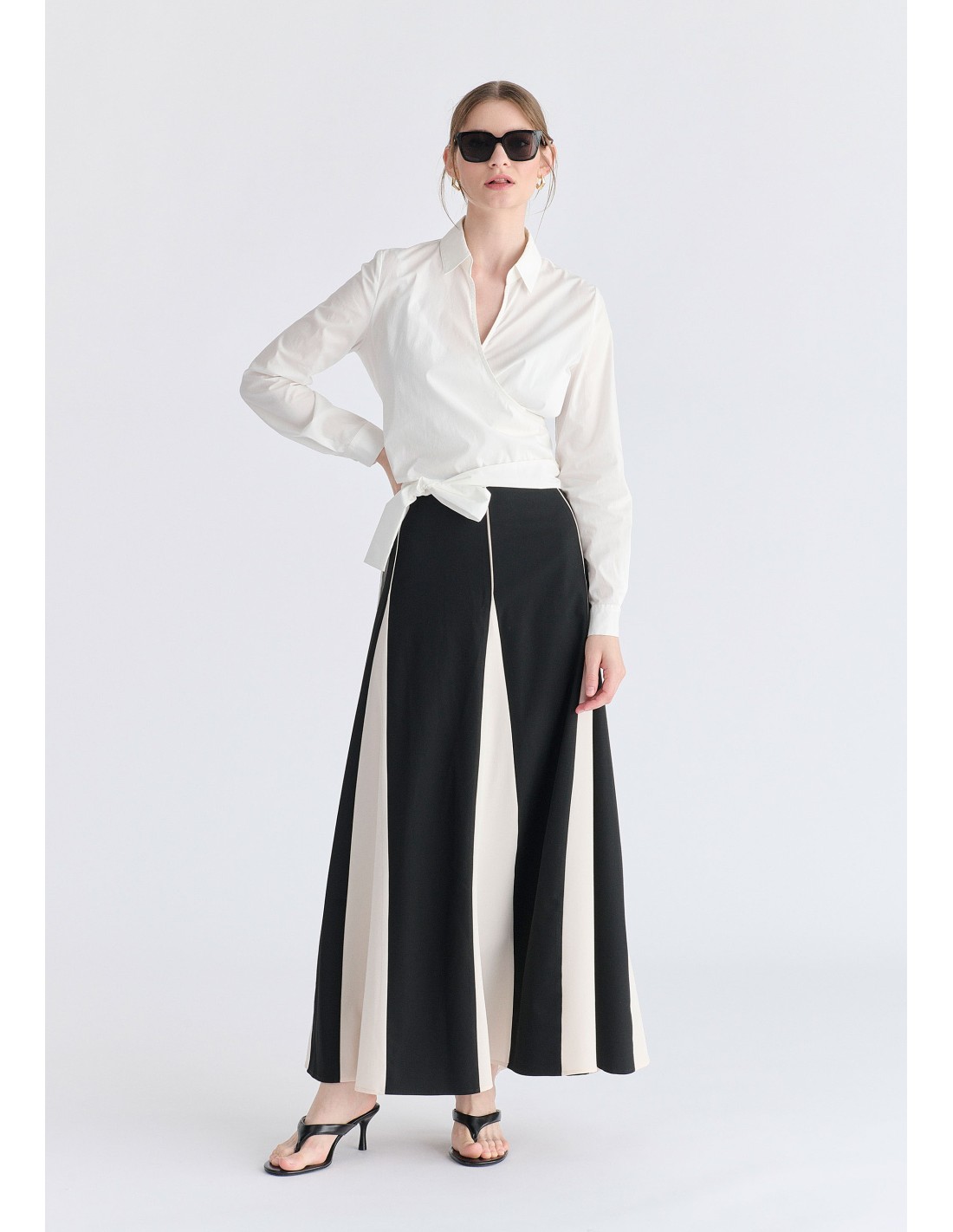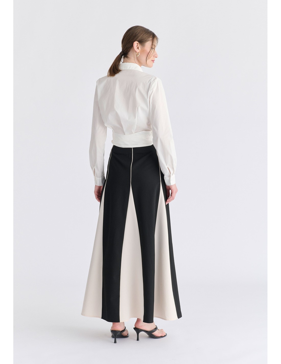 Falda larga, sin cinturilla en tonos beige y negro, con cortes en contraste de Paisie London. La talla 8 equivale a 36/38, la 10/40, 12/42, y la 14 equivale a una talla 44.