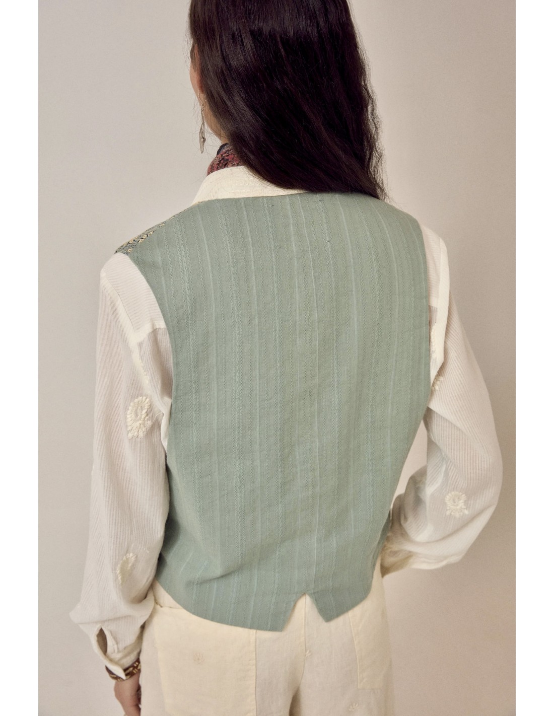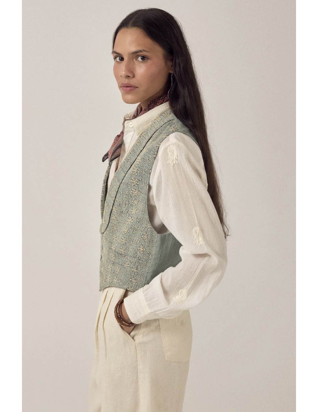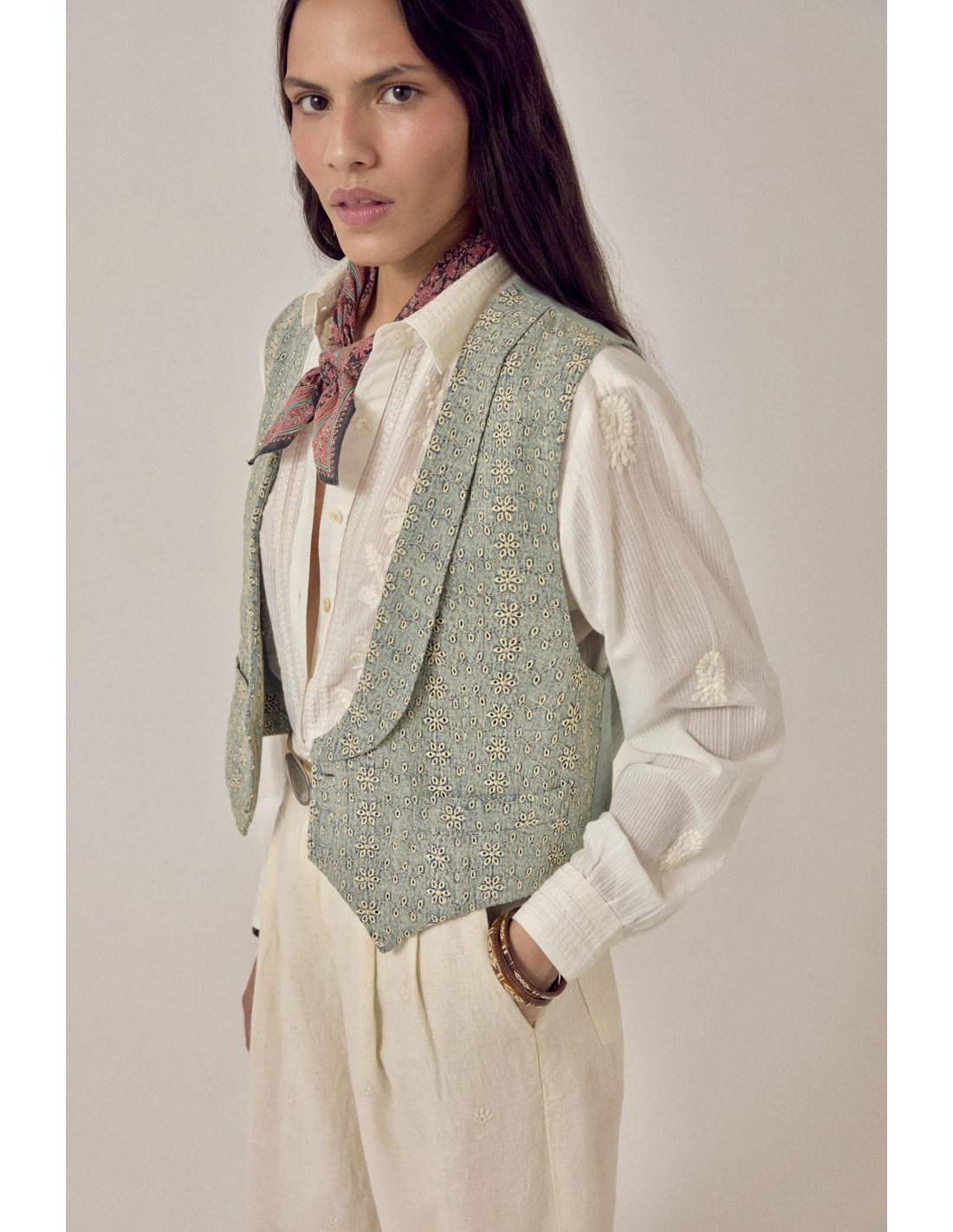 Misma construcción que la versión Shell: chaleco de corte masculino en sarga de algodón bordada. Cuello en V con solapas anchas y pronunciadas. Tres botones metálicos, dos bolsillos pequeños en la cintura. Patrón de ojales bordados en toda la prenda. Corte entallado con hombros estructurados.