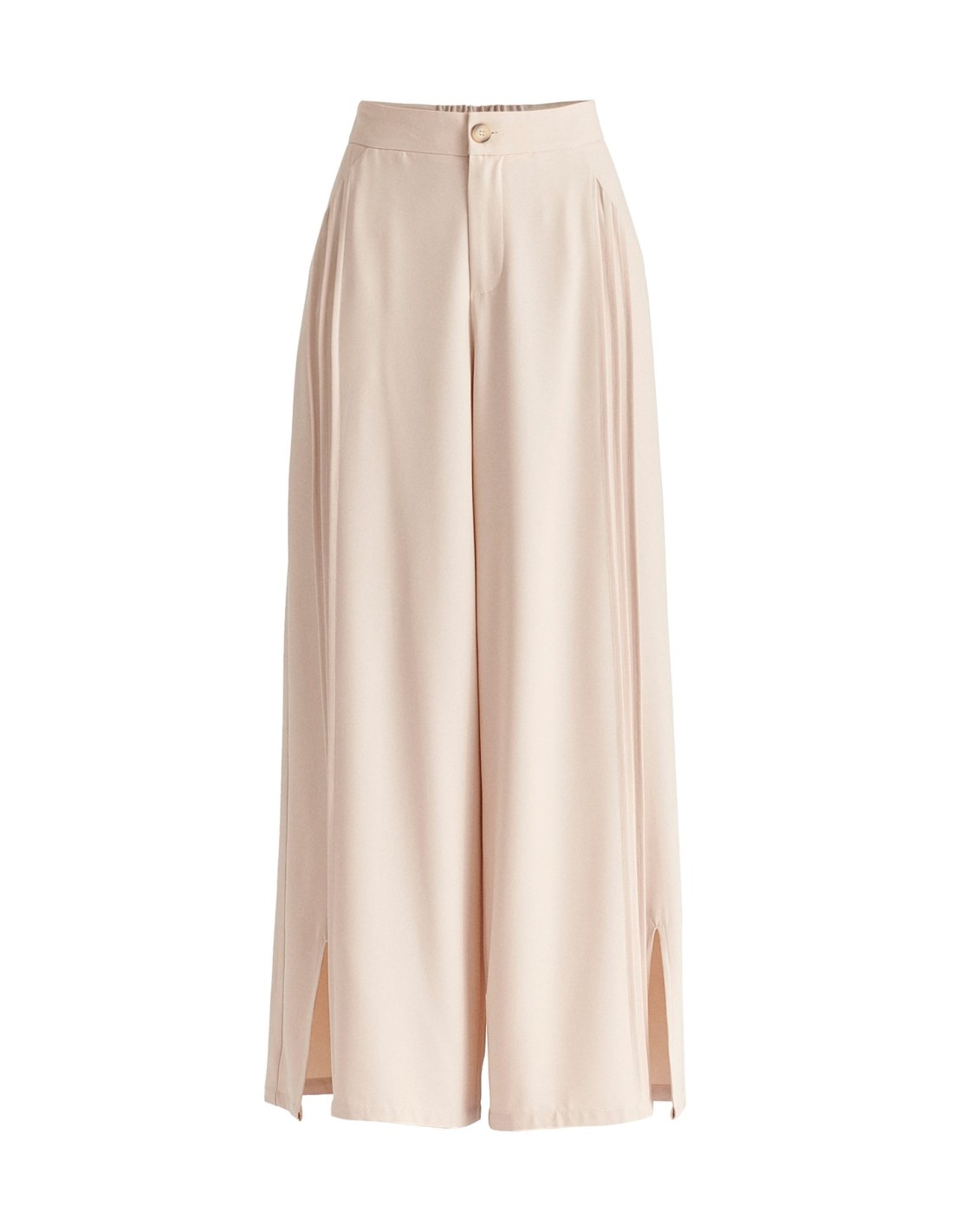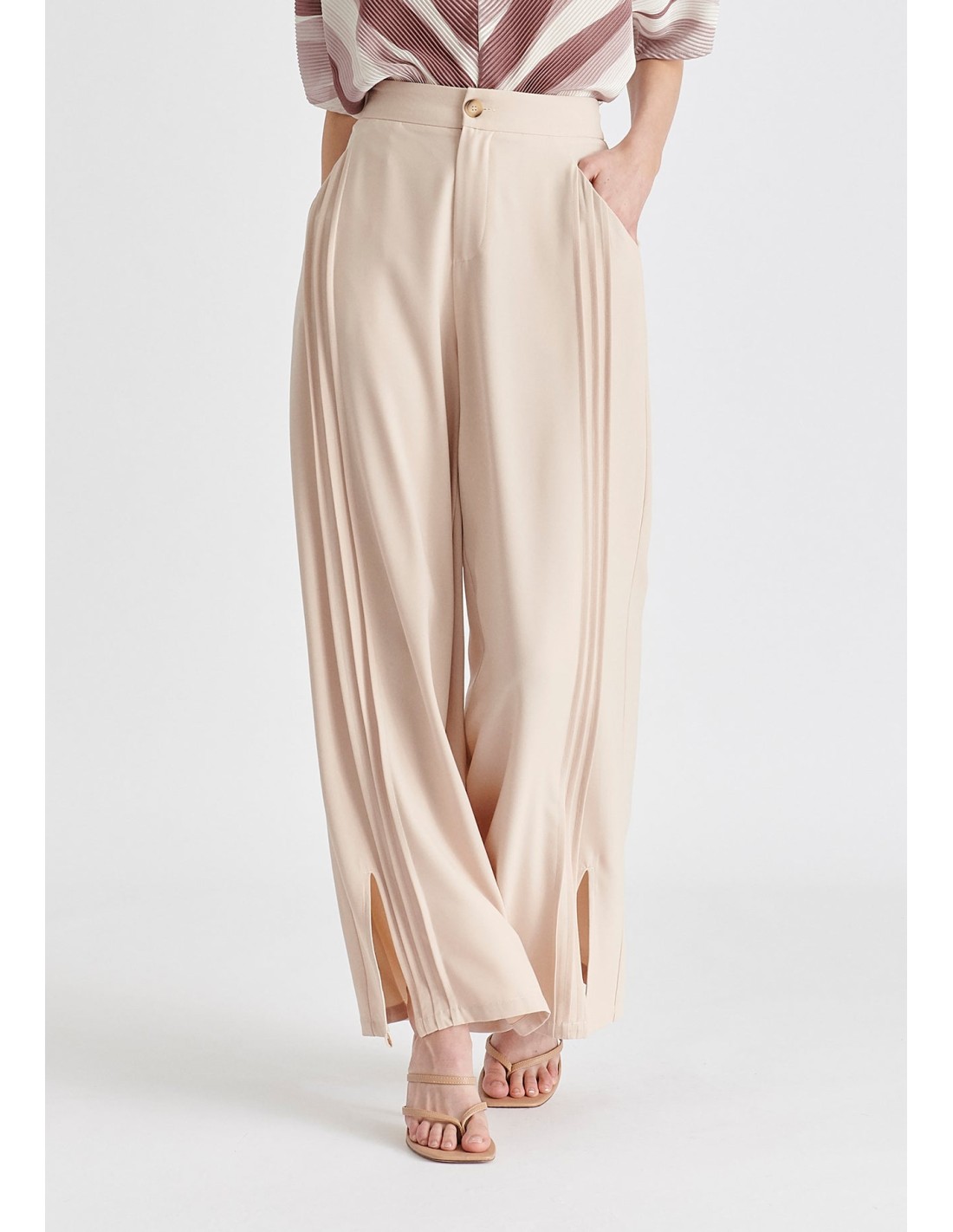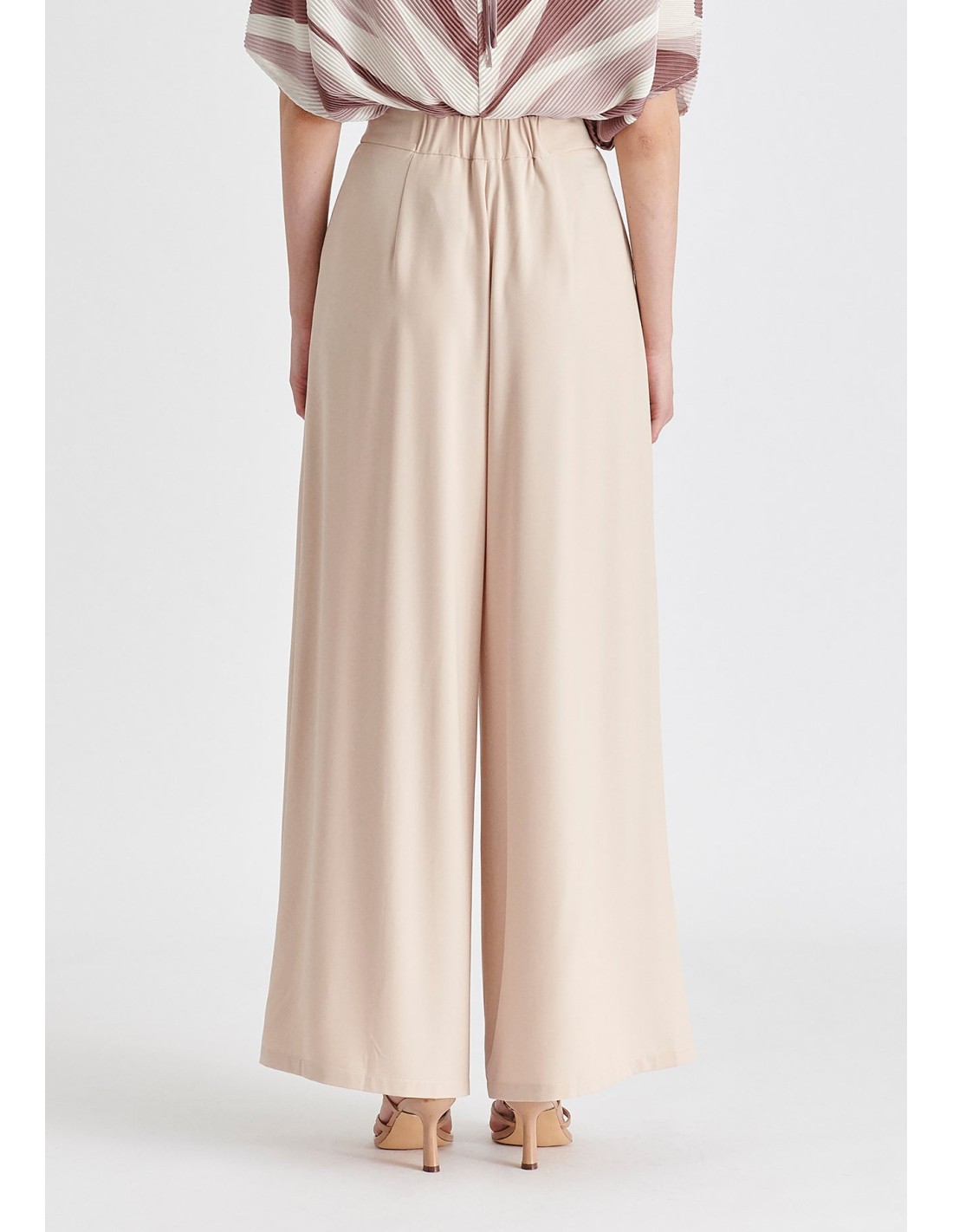Pantalones de pierna ancha confeccionados en creo de poliéster con mucha caída resistente a las arrugas, diseñados con pliegues laterales y bajos con abertura. Se cierran con botón y cremallera, y cuentan con una banda elástica en la parte de atrás de la cinturilla para mayor comodidad y flexibilidad. El tejido es suave, fluido y con una caída perfecta, ofreciendo libertad de movimiento y elegancia.