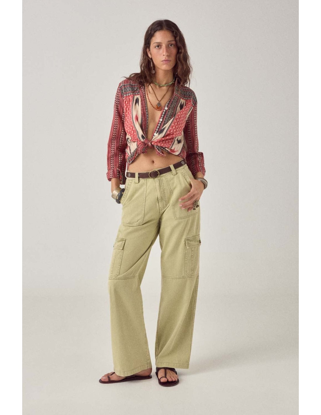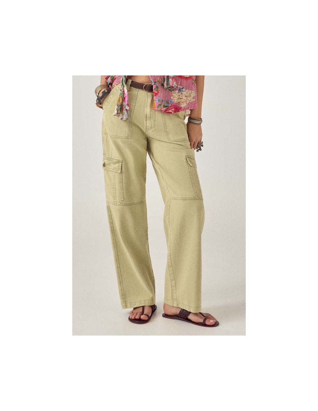 Pantalón cargo en sarga de algodón color caqui desteñido por el sol. Cintura media con cierre de botón y cremallera, pernera ancha y recta. Dos bolsillos delanteros y dos bolsillos cargo en los muslos con solapa y botón. Las costuras utilitarias en toda la prenda le aportan estructura.