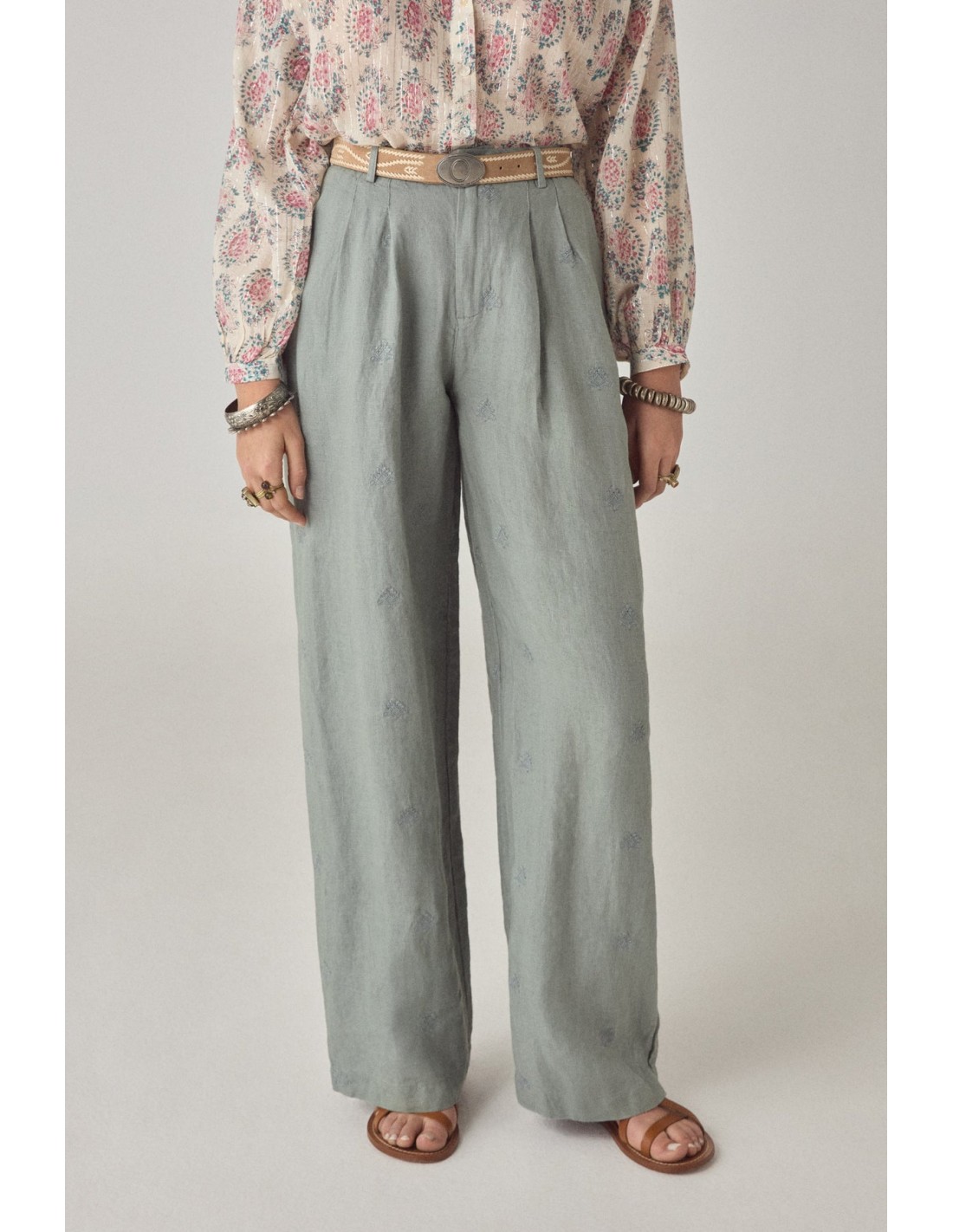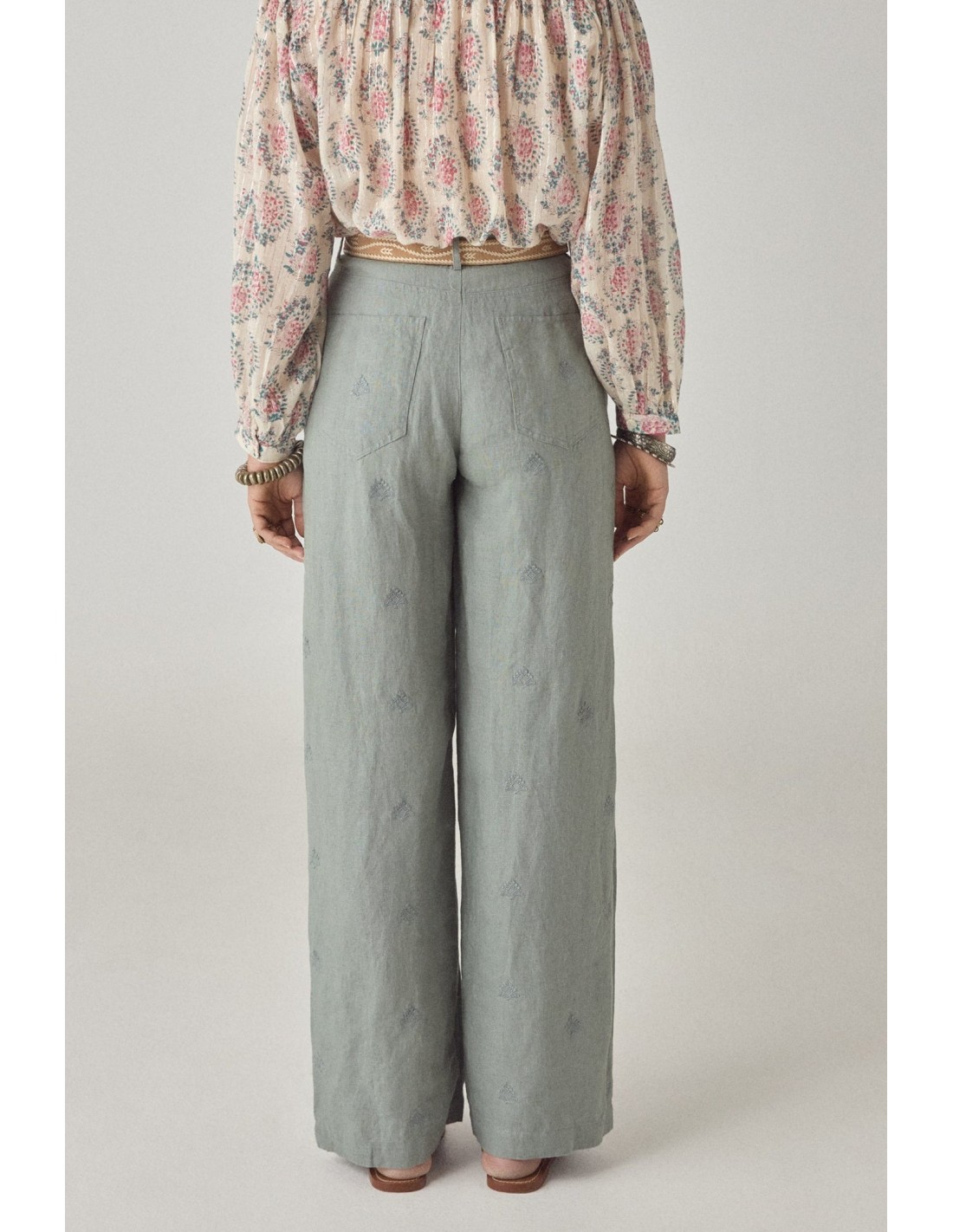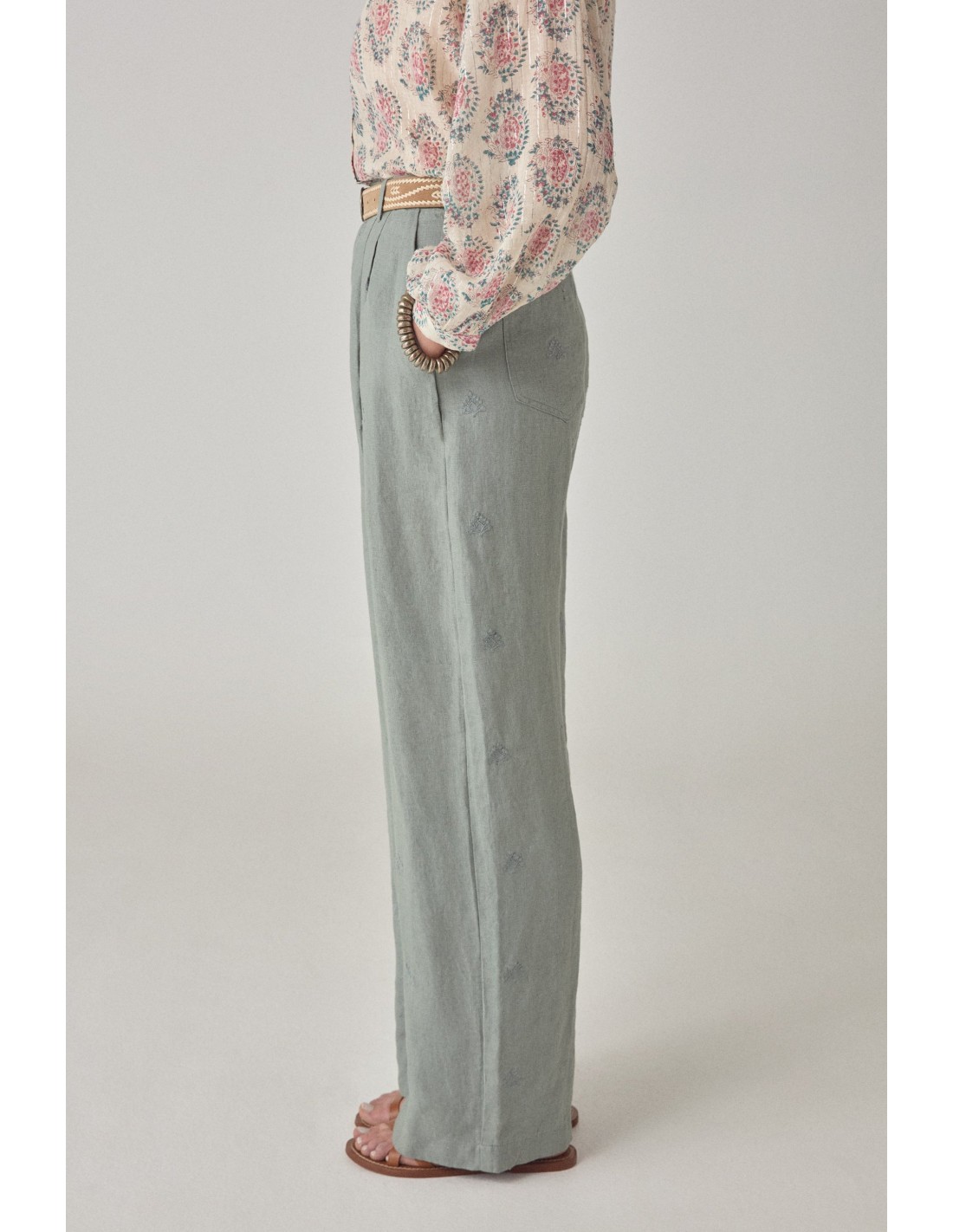 Pantalón de pierna ancha en mezcla de algodón y lino azul claro empolvado. Cintura media con cierre de botón y cremallera, dos bolsillos delanteros. Pierna holgada con caída recta. El tejido transpirable combina ligereza y estructura.