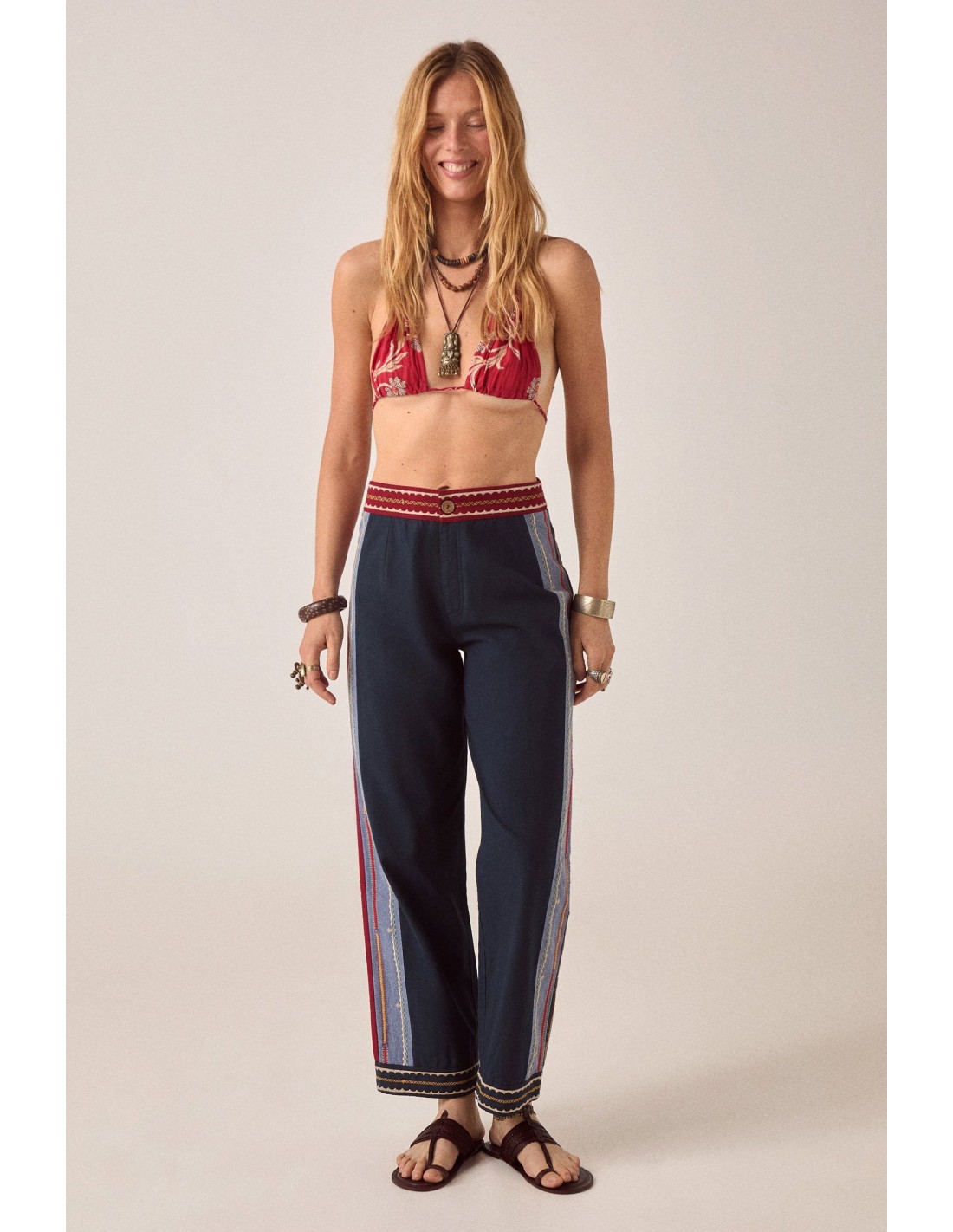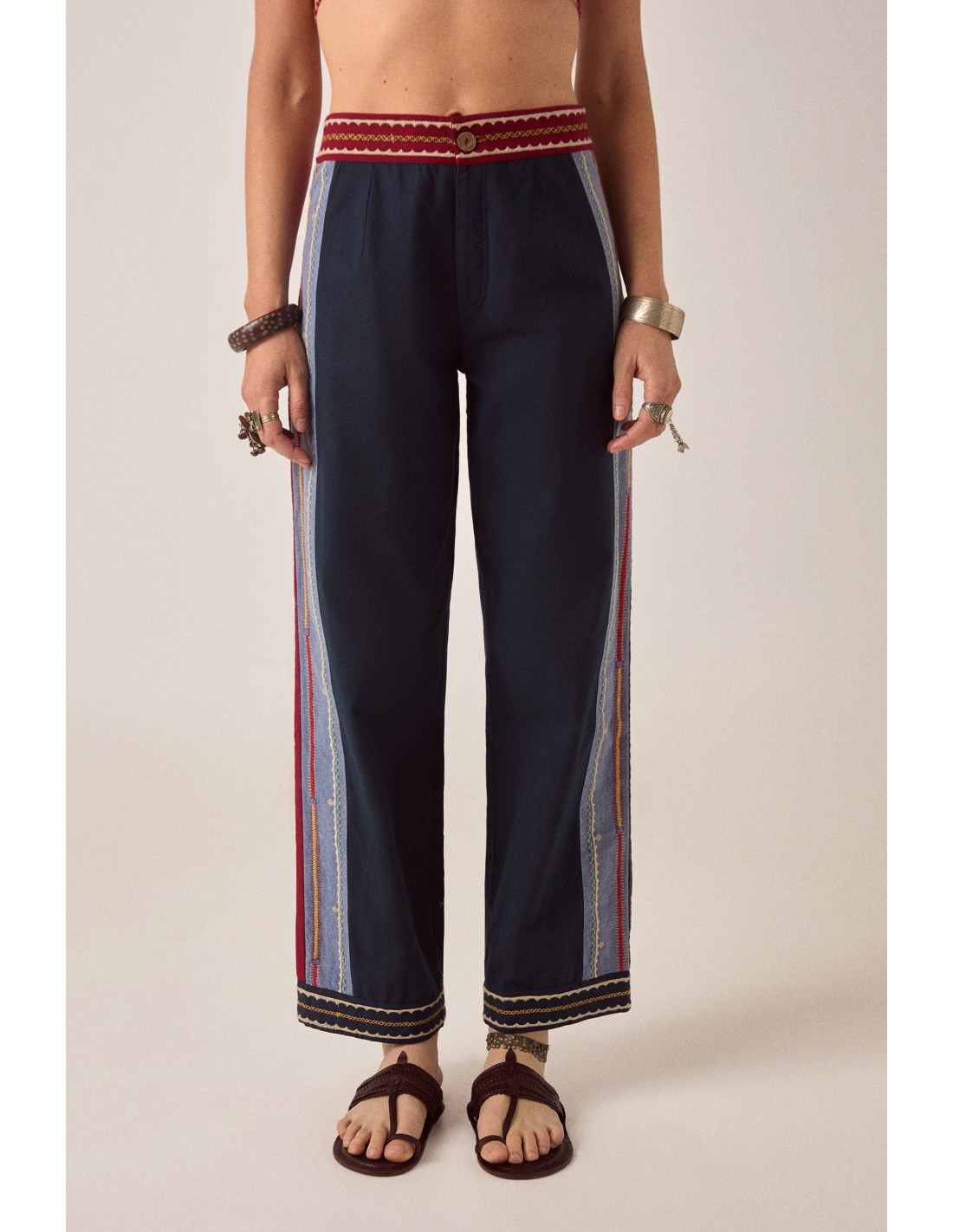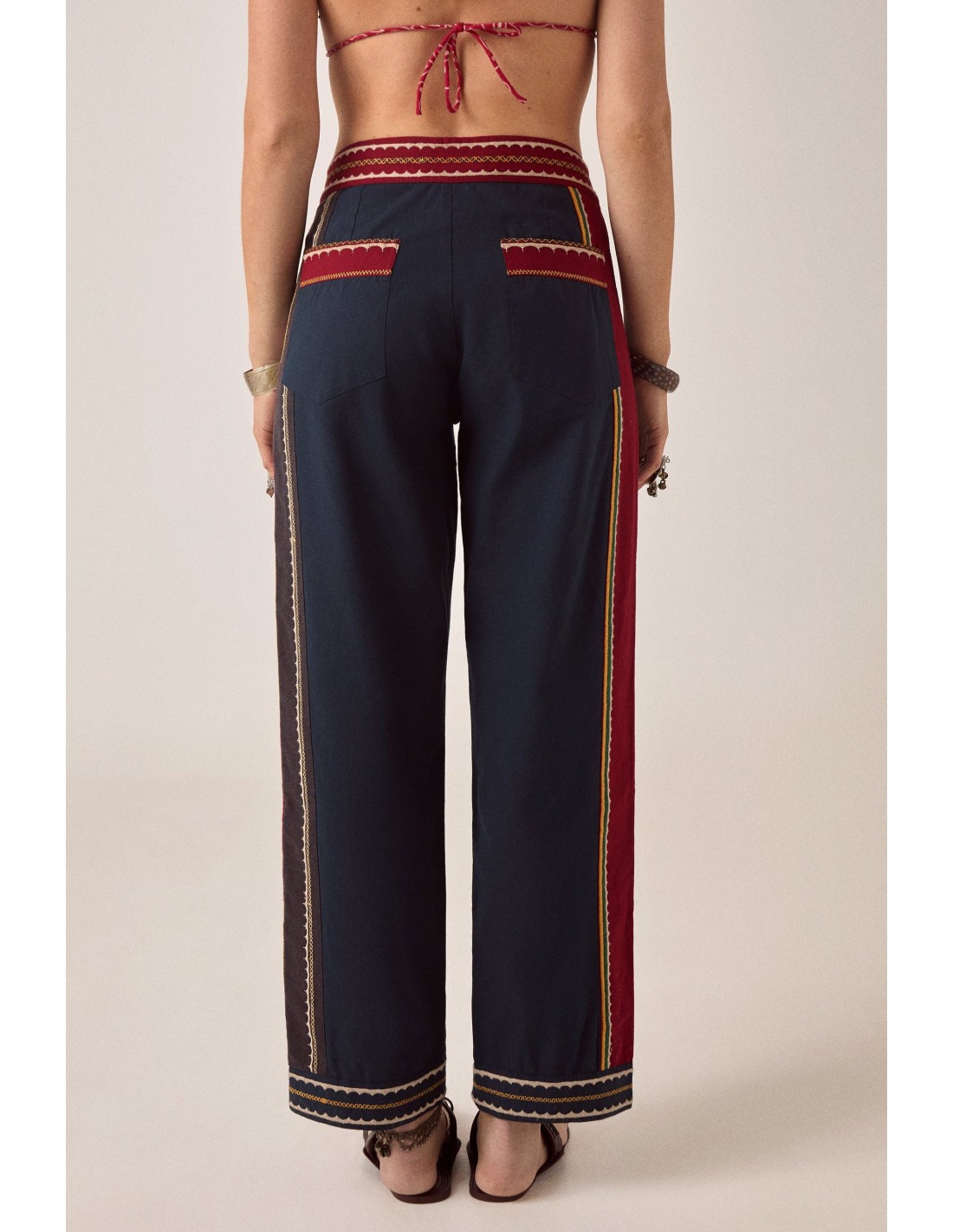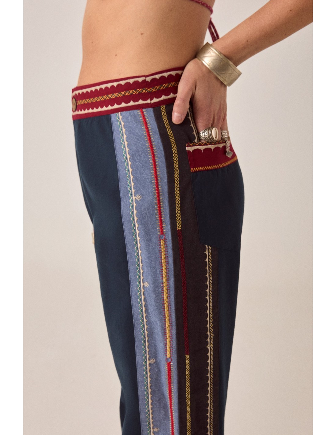 El color recorre los pantalones con intención, nunca estridente, pero siempre presente. A lo largo de la pierna, el bordado traza una línea vertical, añadiendo ritmo y alargamiento, anclando el movimiento del patchwork. Casi parece un sendero, guiando la mirada, marcando el camino.