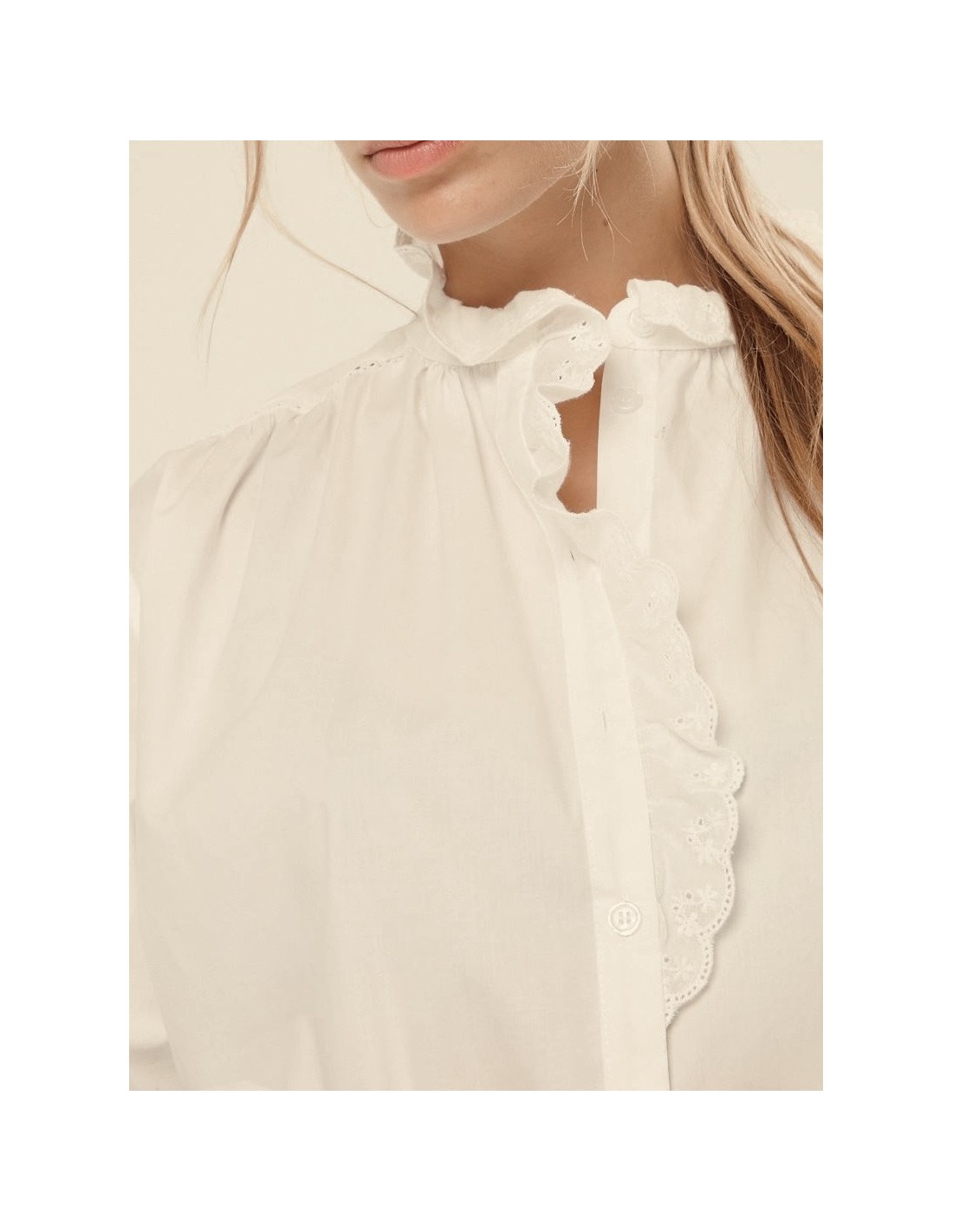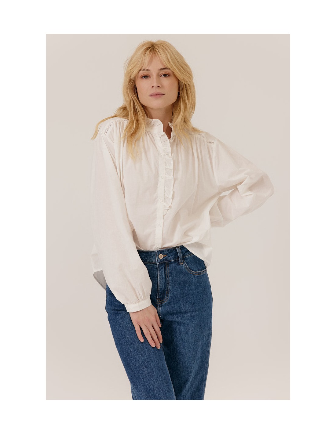 Camisa blanca con cuello con volantes y tapeta fruncida. Un detalle romántico para un look refinado - Artlove. 100% ALGODÓN