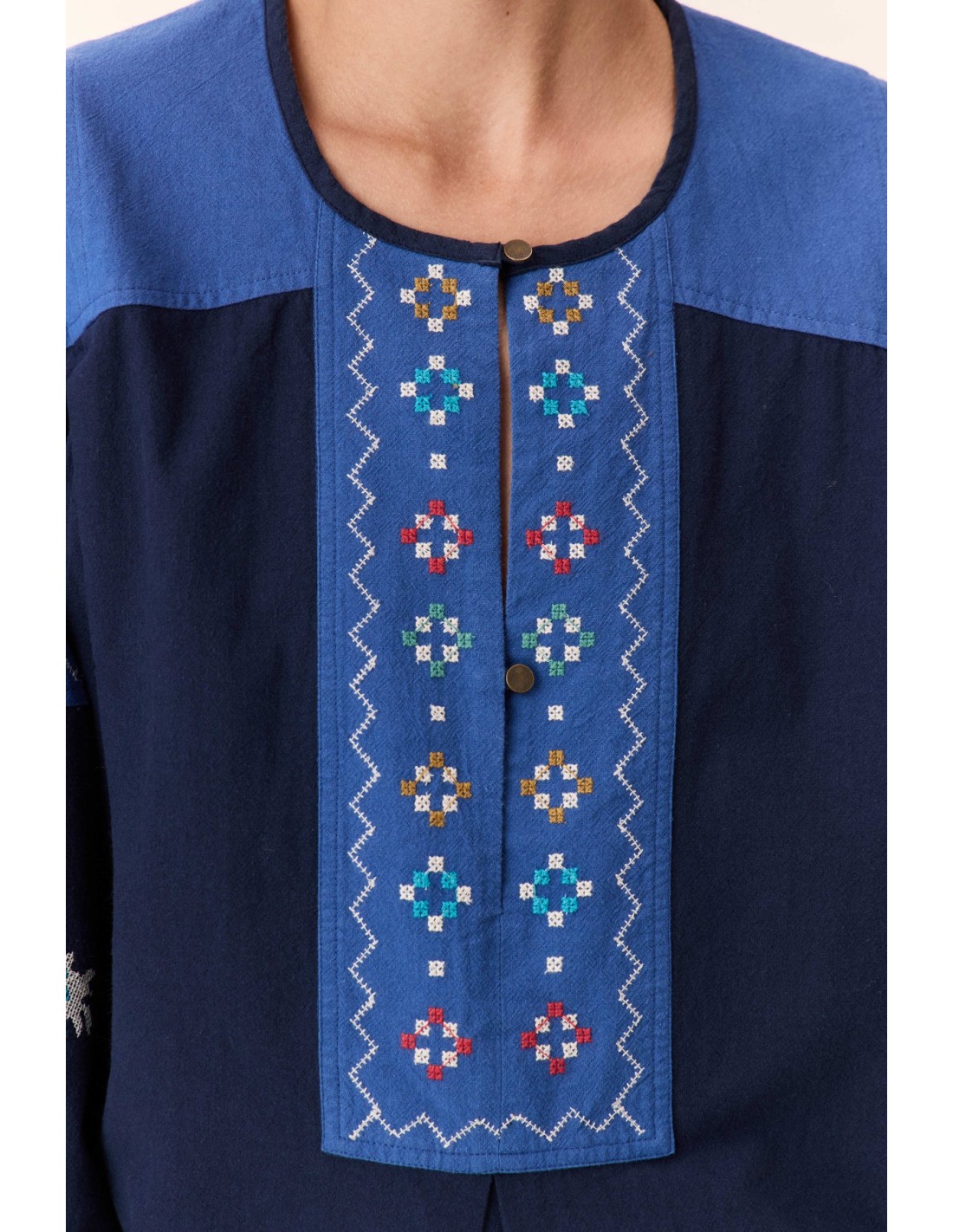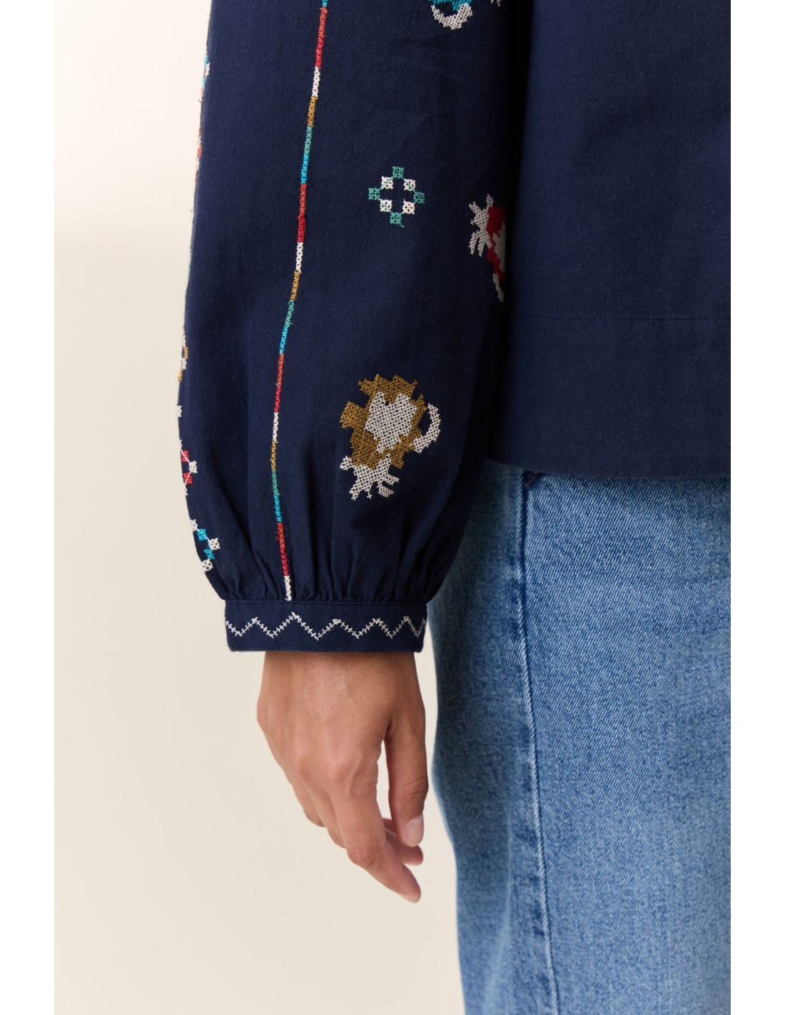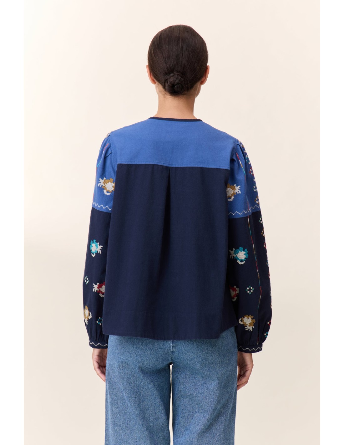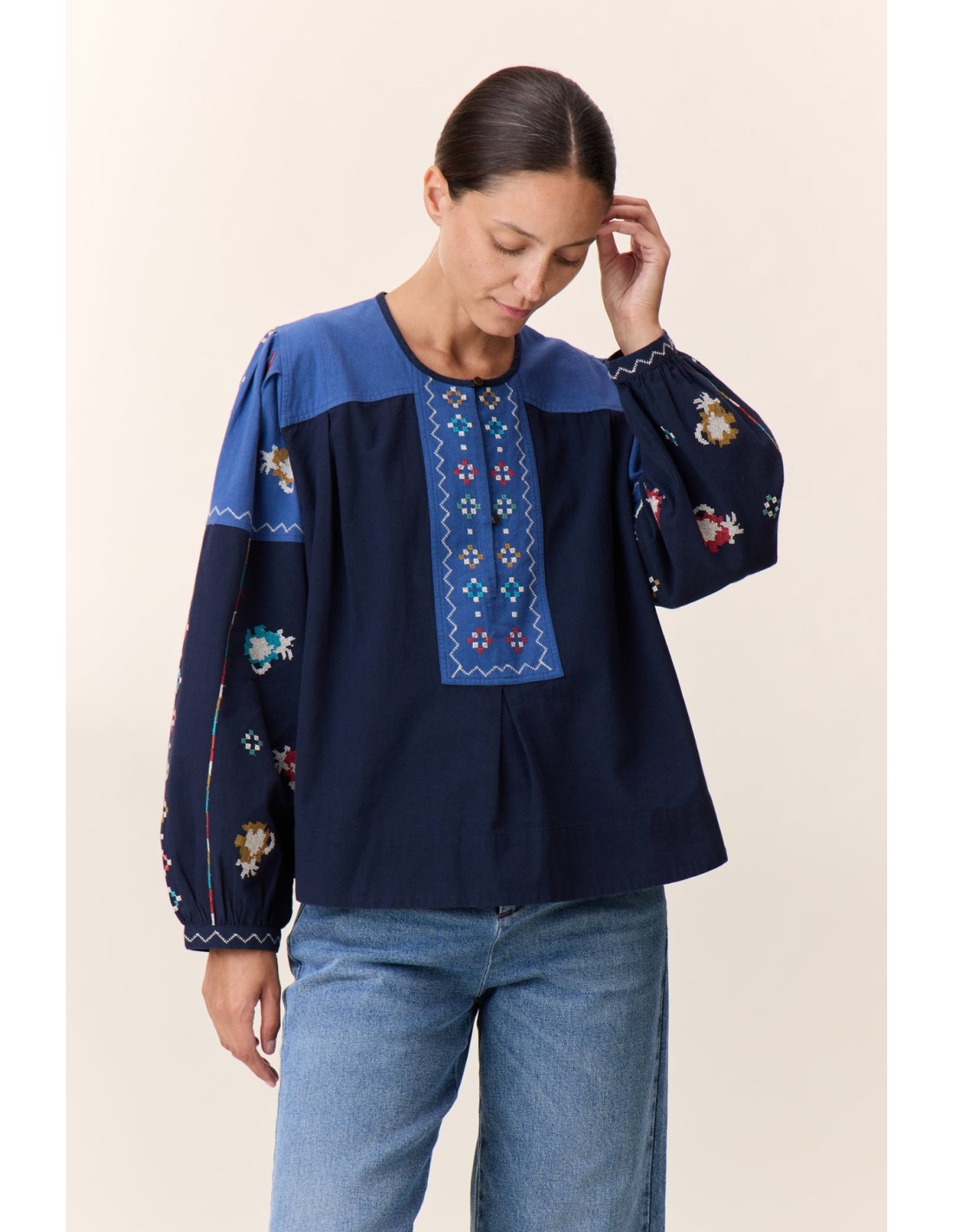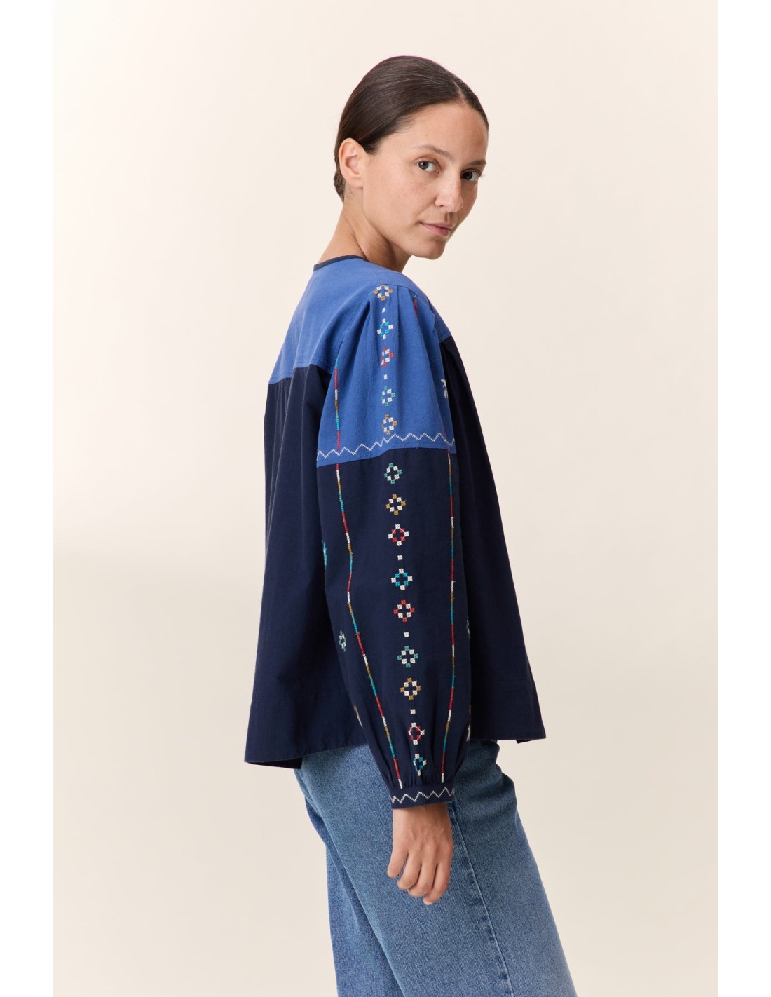 La blusa Chuki Brd está pensada para mujeres que disfrutan afirmar su estilo a través de los detalles característicos de Leon & Harper. Su cuello redondo y la tapeta de botones parcial, realzada con bordados geométricos, aportan relieve y personalidad a la silueta. Las mangas largas, estructuradas con bordados colocados estratégicamente y puños fruncidos elásticos, crean un sutil juego de volúmenes. Su corte amplio garantiza una caída fluida y la libertad de movimiento que distingue a la marca. Confeccionada en 100% algodón, esta blusa añade un toque creativo tanto a un look relajado como a un estilo urbano. Ideal para combinar con unos vaqueros rectos en el día a día.
