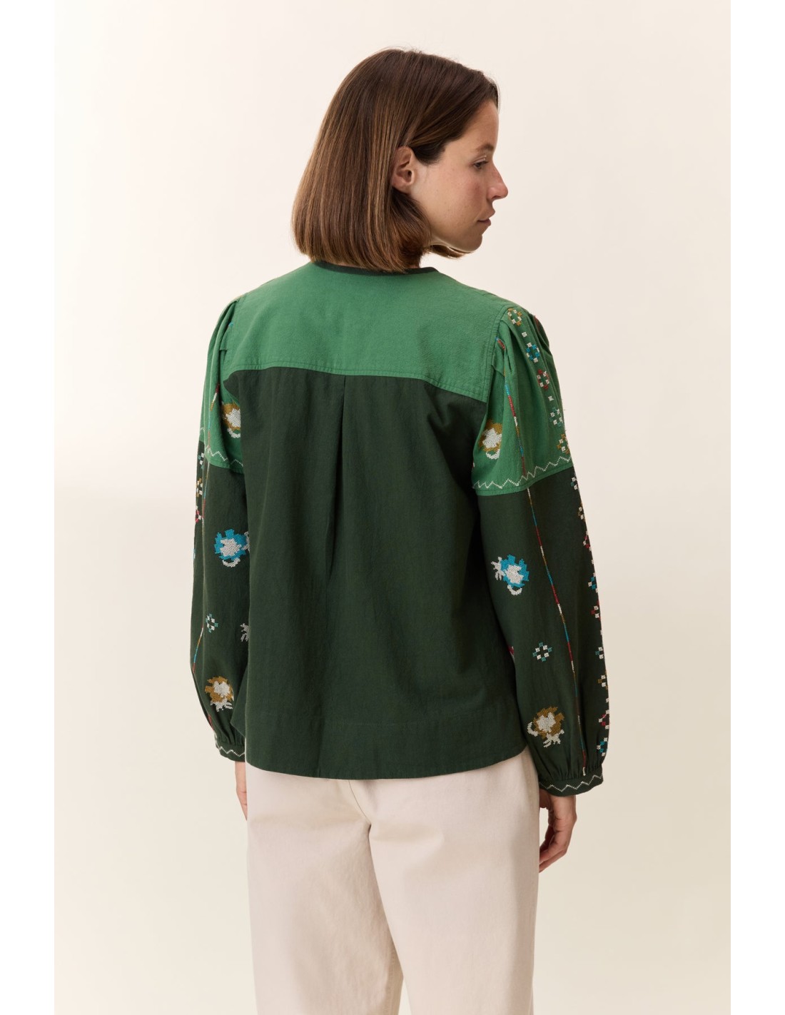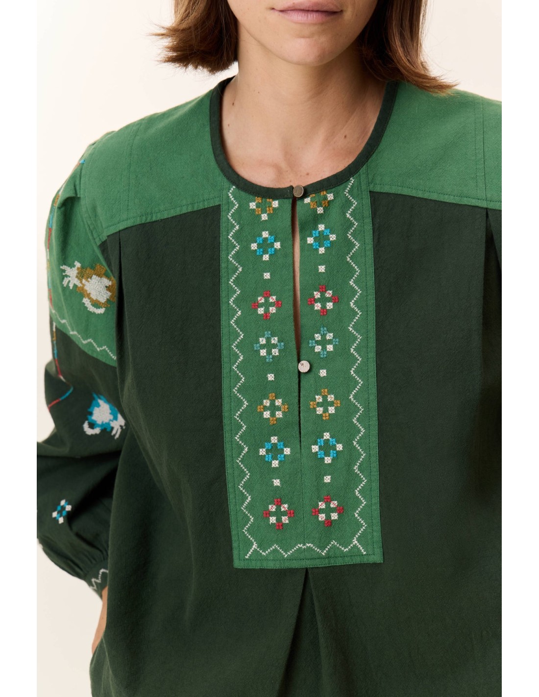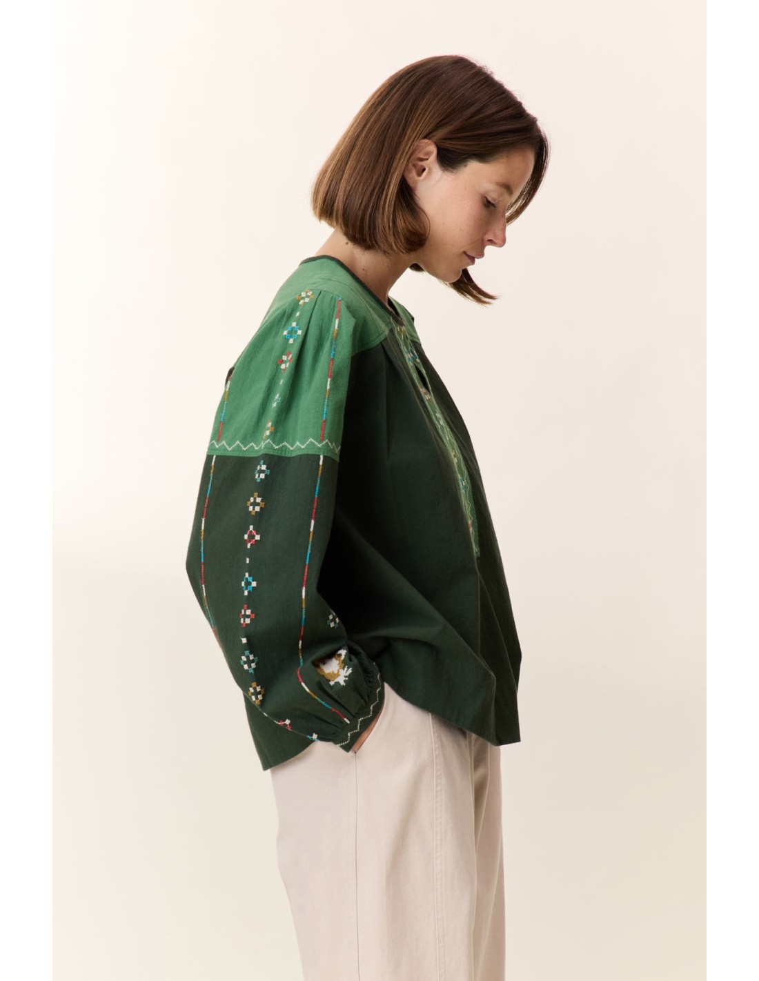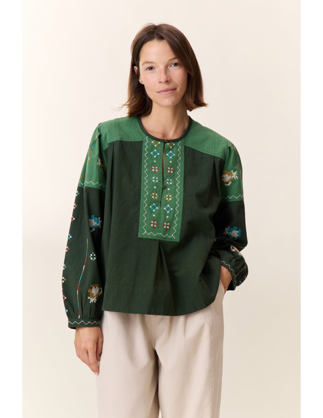 La blusa Chuki Brd está pensada para mujeres que disfrutan afirmar su estilo a través de los detalles característicos de Leon & Harper. Su cuello redondo y la tapeta de botones parcial, realzada con bordados geométricos, aportan relieve y personalidad a la silueta. Las mangas largas, estructuradas con bordados colocados estratégicamente y puños fruncidos elásticos, crean un sutil juego de volúmenes. Su corte amplio garantiza una caída fluida y la libertad de movimiento que distingue a la marca. Confeccionada en 100% algodón, esta blusa añade un toque creativo tanto a un look relajado como a un estilo urbano. Ideal para combinar con unos vaqueros rectos en el día a día.