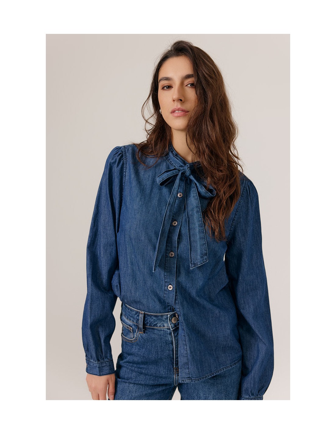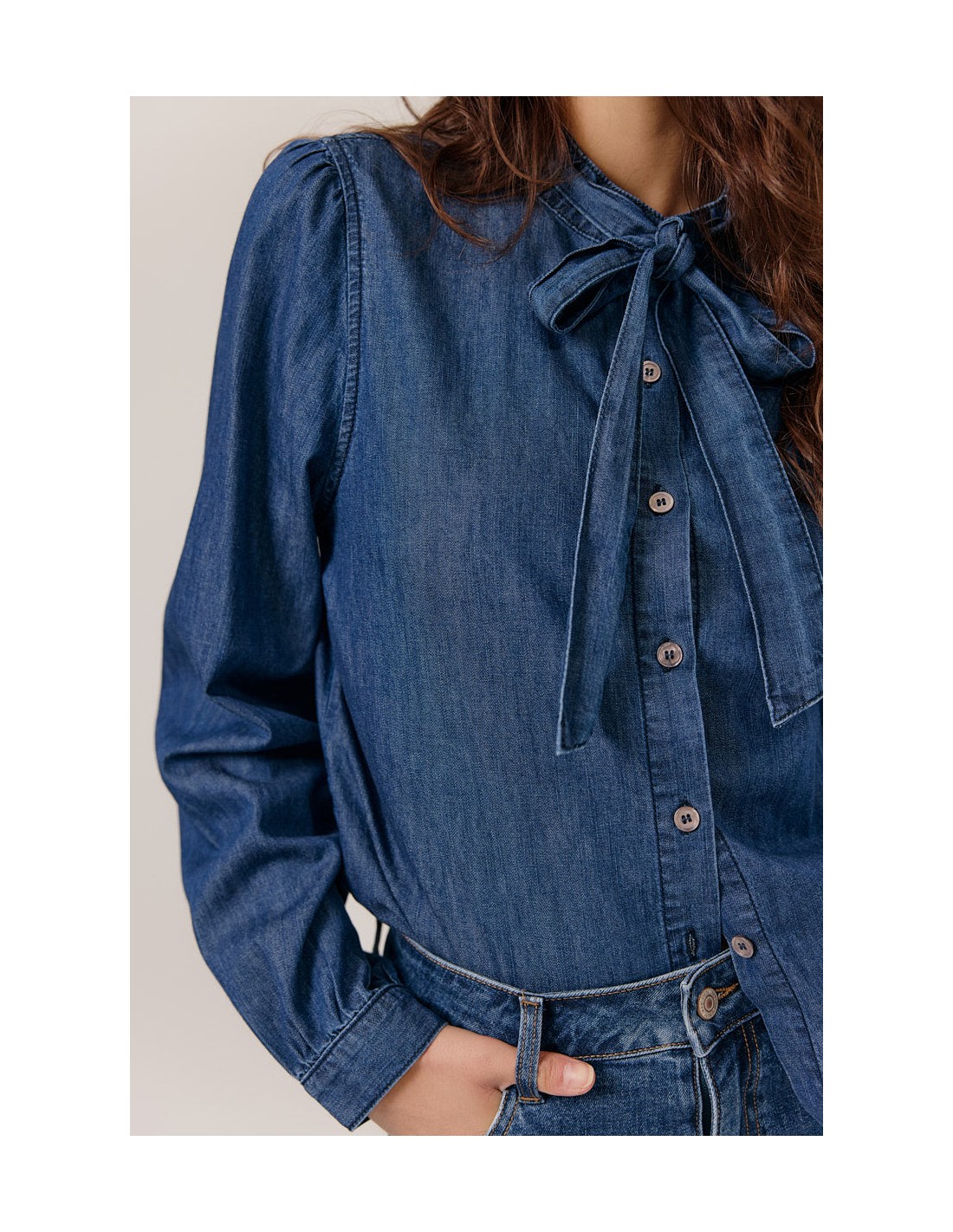 Camisa vaquera con cuello de lazo y mangas ligeramente abullonadas. Un detalle femenino en un corte muy en tendencia - Artlove 100% ALGODÓN