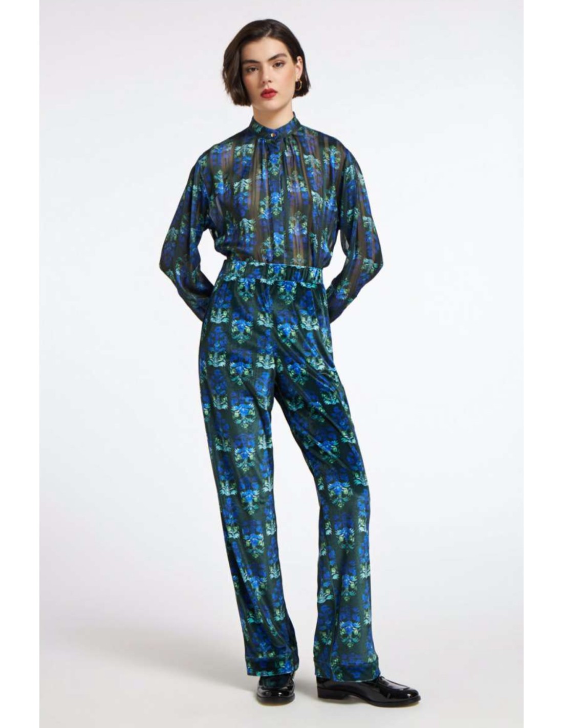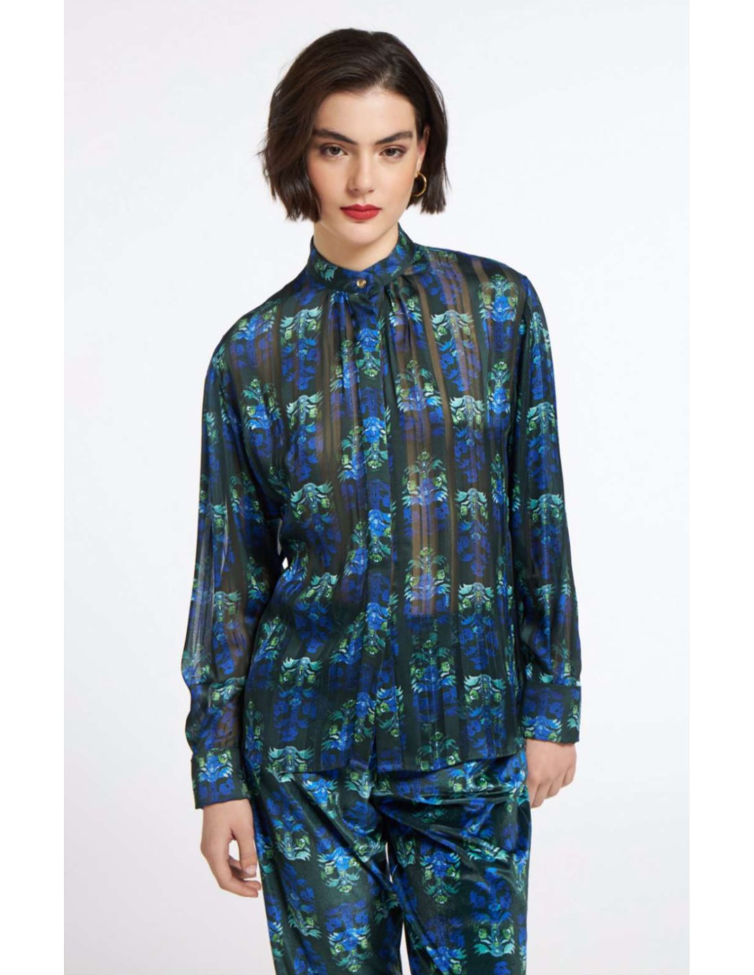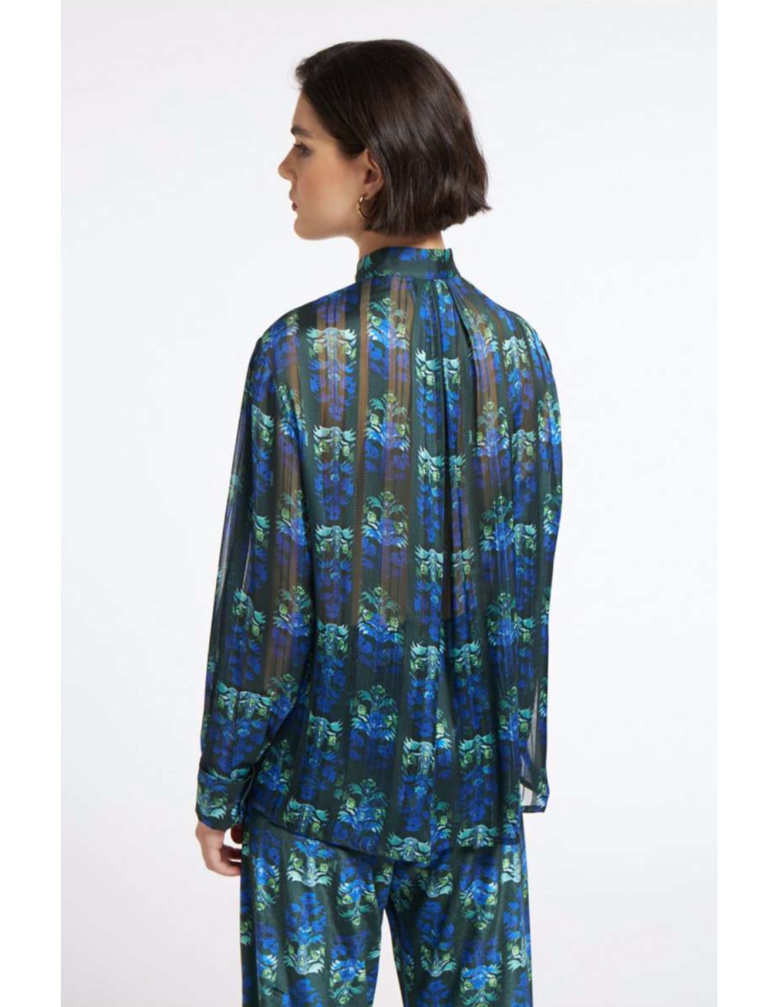 El estampado floral en tonos azul y verde, sobre fondo oscuro, aporta un aire moderno y vibrante que no pasa desapercibido. El cuello alto fruncido y los puños abotonados añaden detalles refinados que elevan la prenda, convirtiéndola en una elección ideal tanto para una salida nocturna como para un evento más informal con estilo.