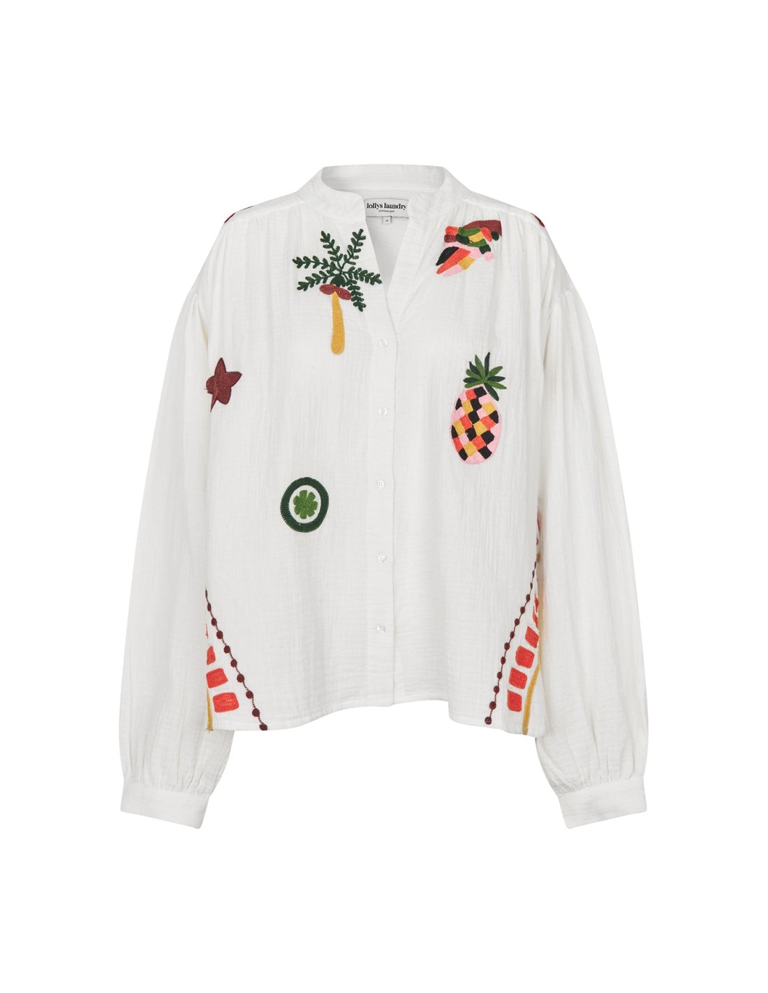 ScottieLL es una camisa encantadora y femenina llena de motivos bordados coloridos que crean una expresión artística y viva. La calidad suave y de textura ligera del algodón 100% lo hace cómodo de llevar y perfecto para los días más luminosos de la temporada.