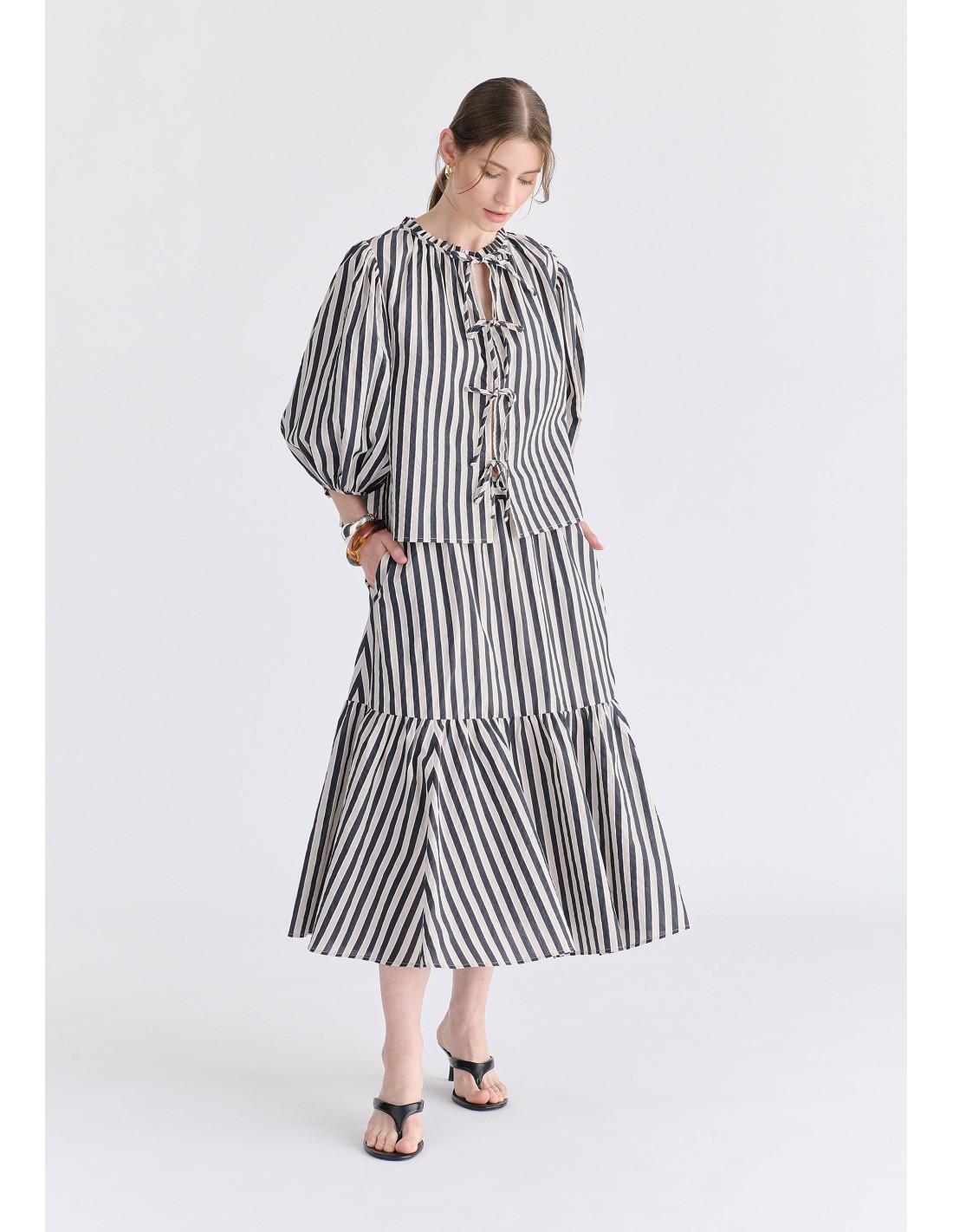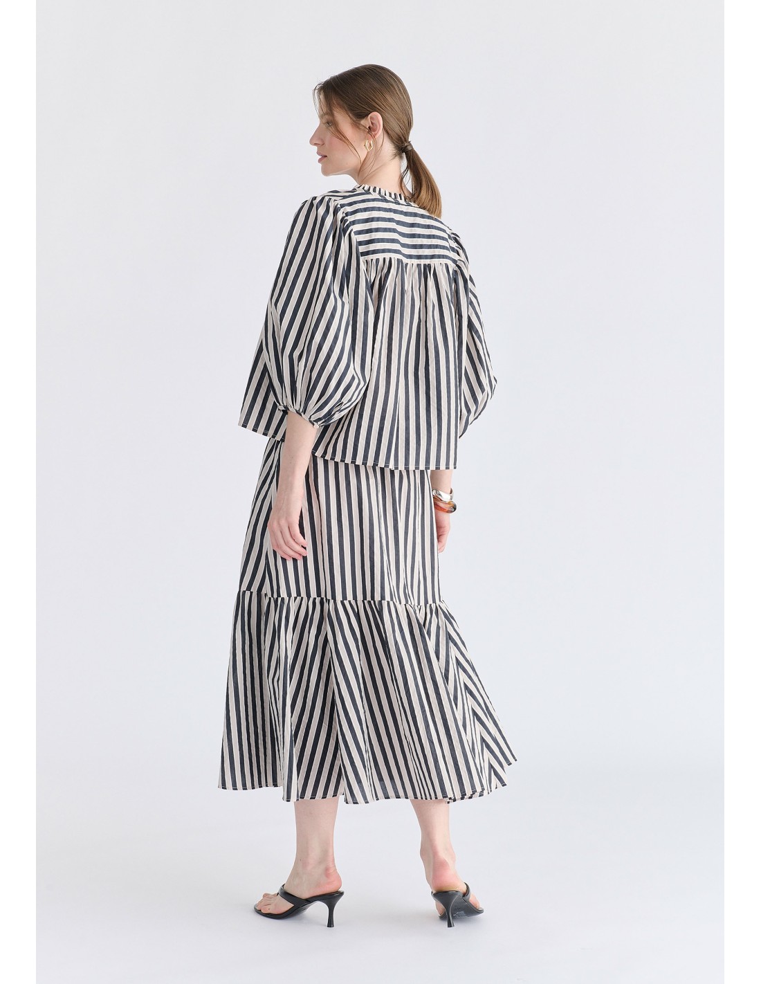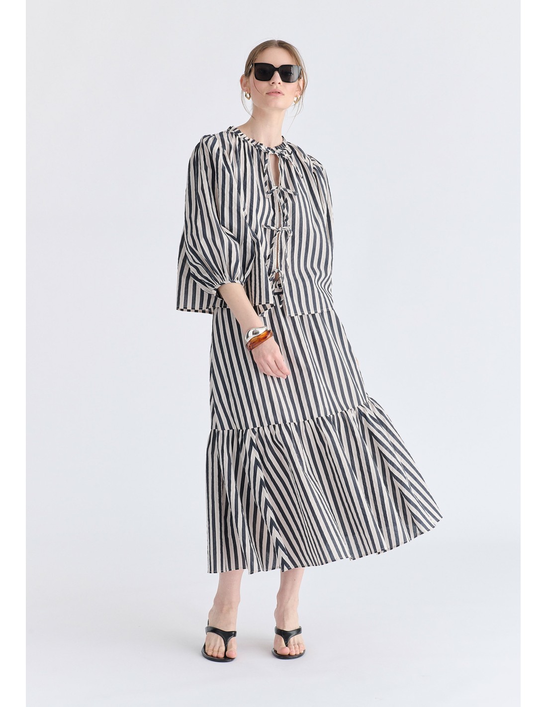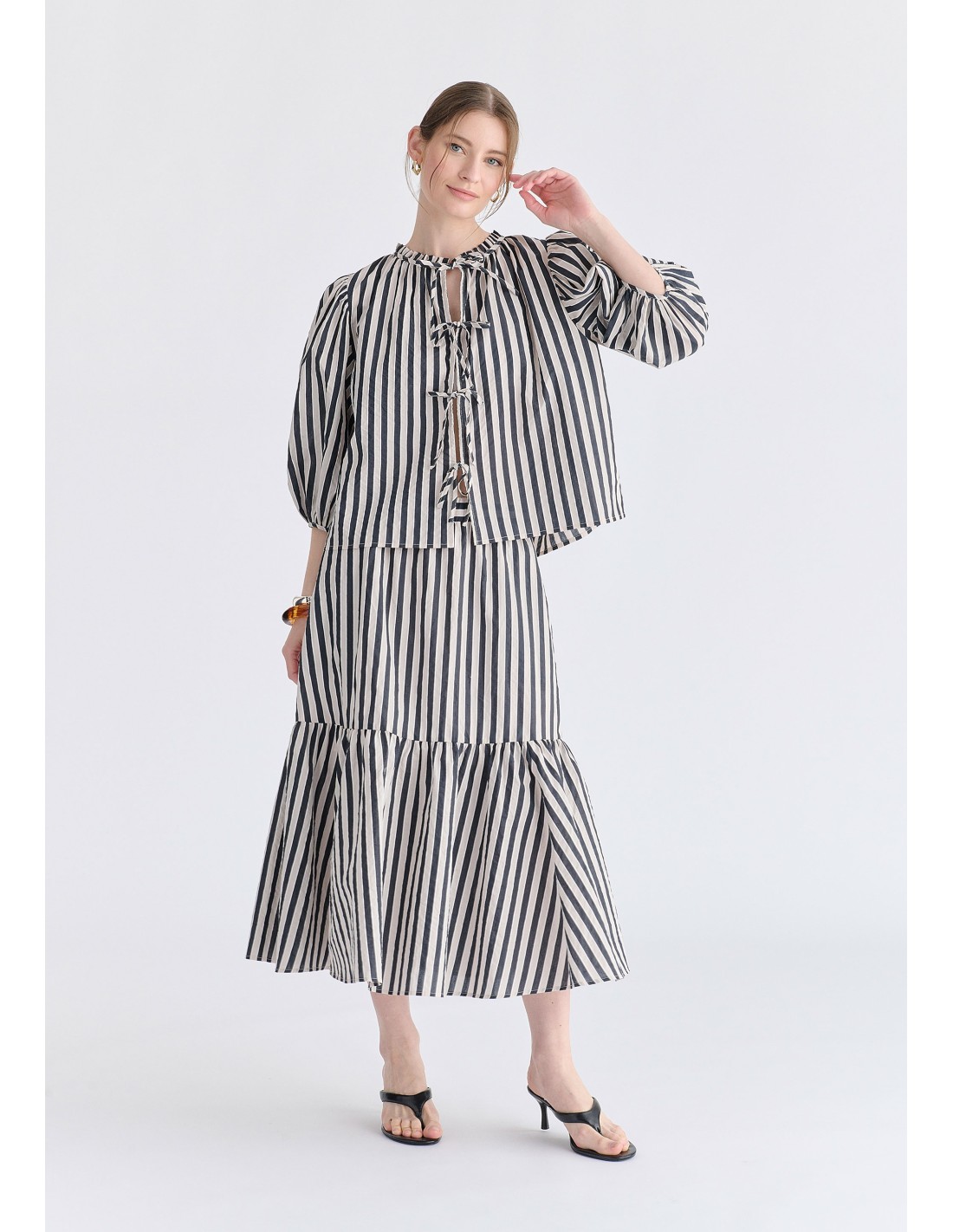 Blusa estampado de rayas con mangas abullonadas y cierre delantero con lazos