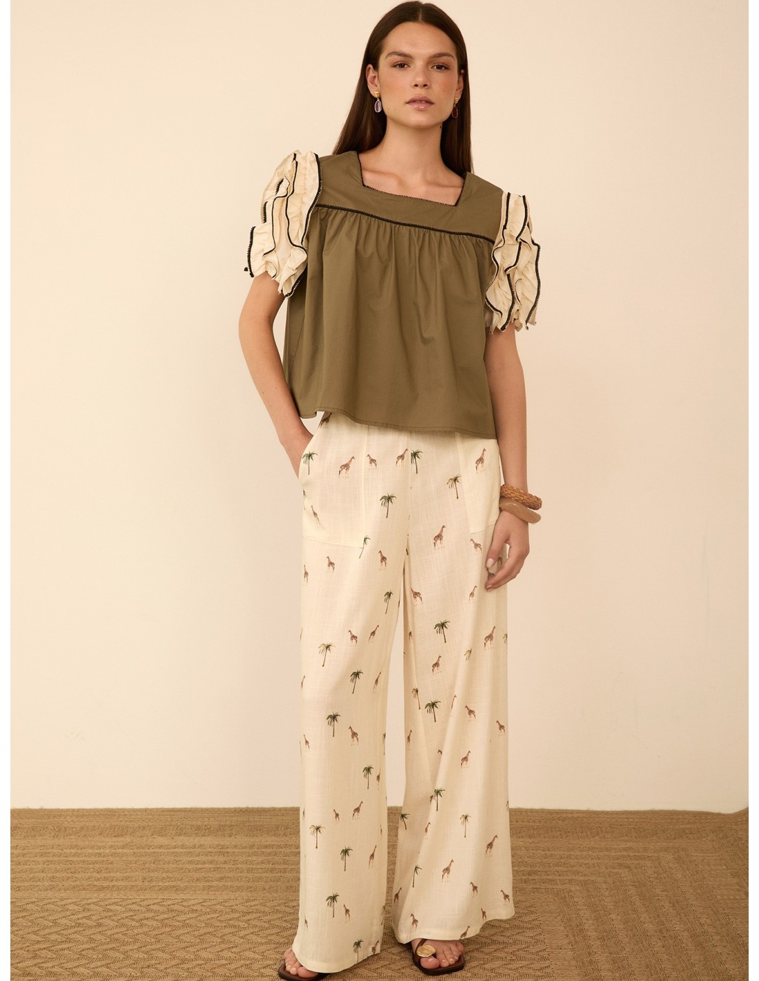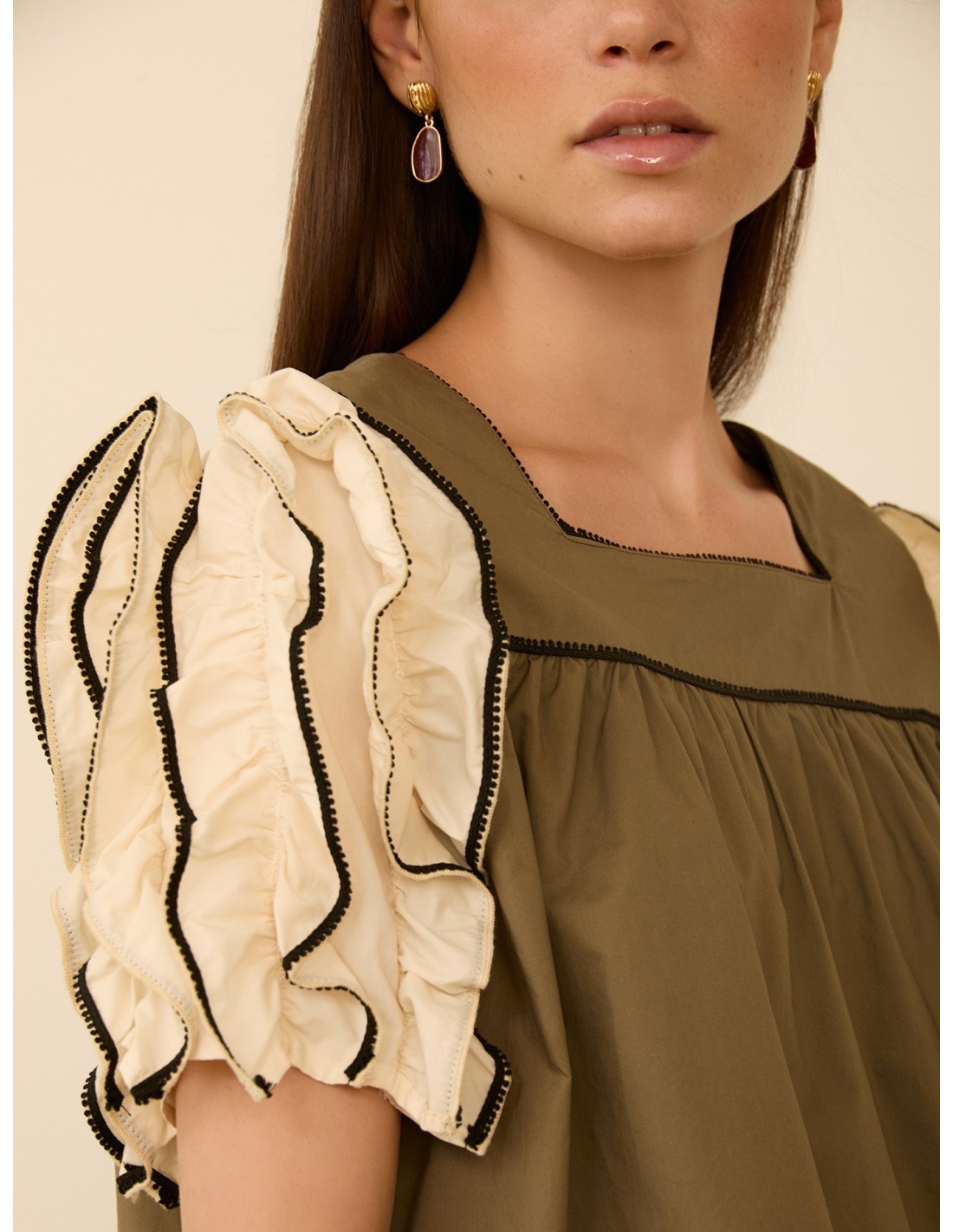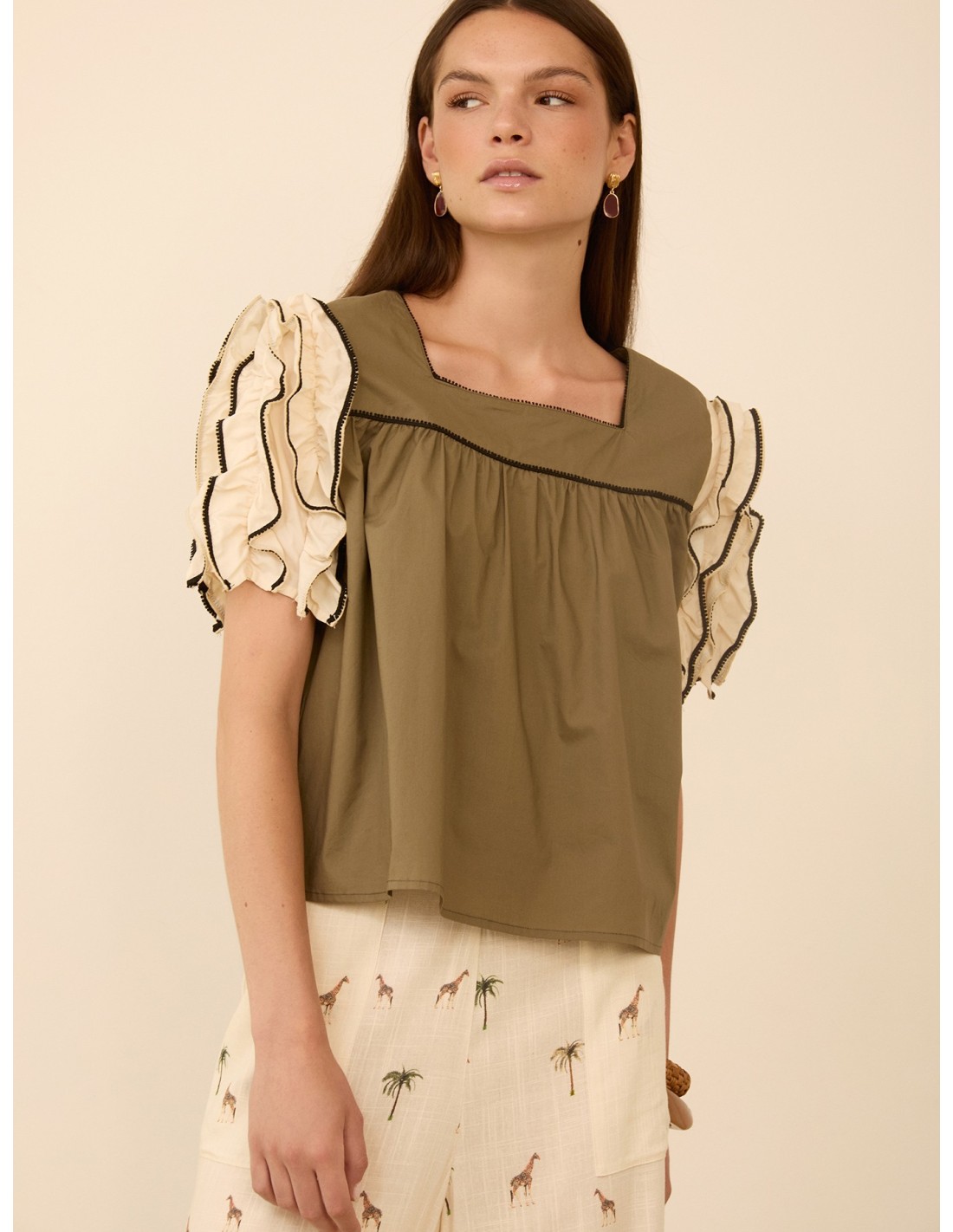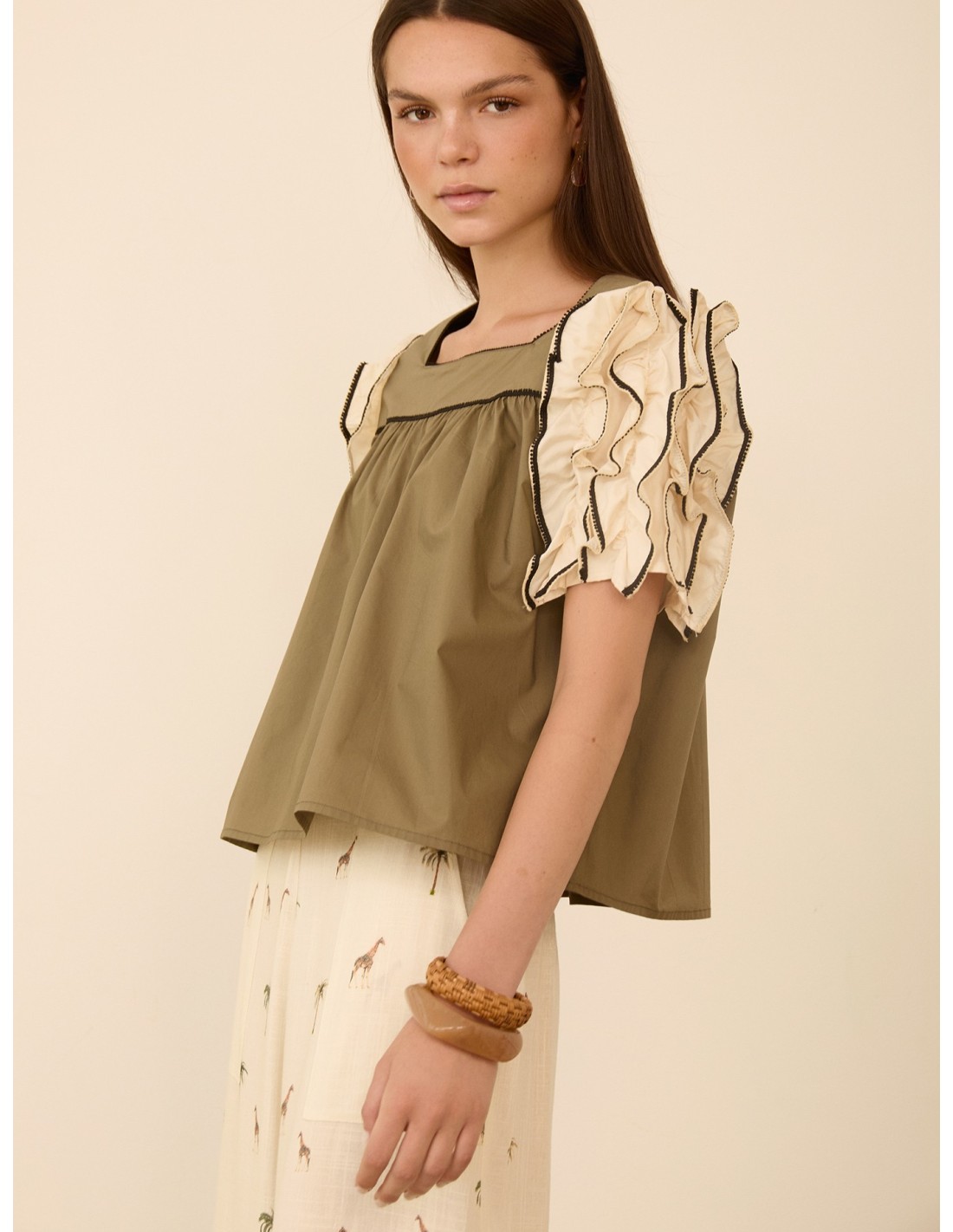 TOP RECTO NEGRO CON FRUNCE Y MANGAS DE VOLANTES EN CRUDO REMATADAS CON VIVO EN CONTRASTE - MEISIE