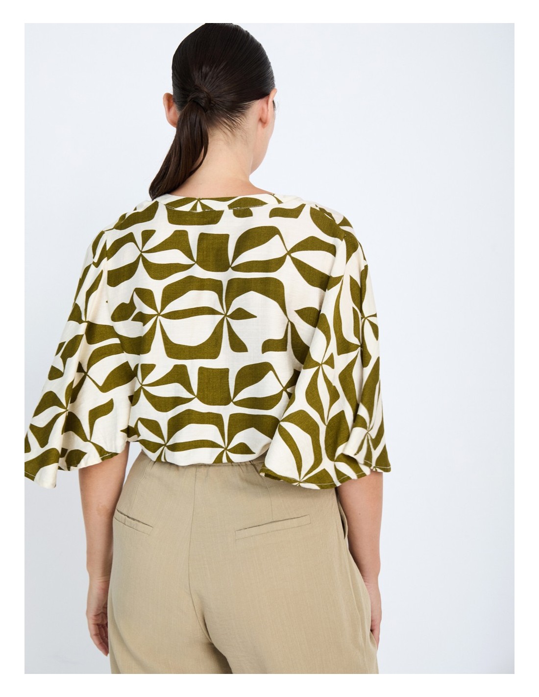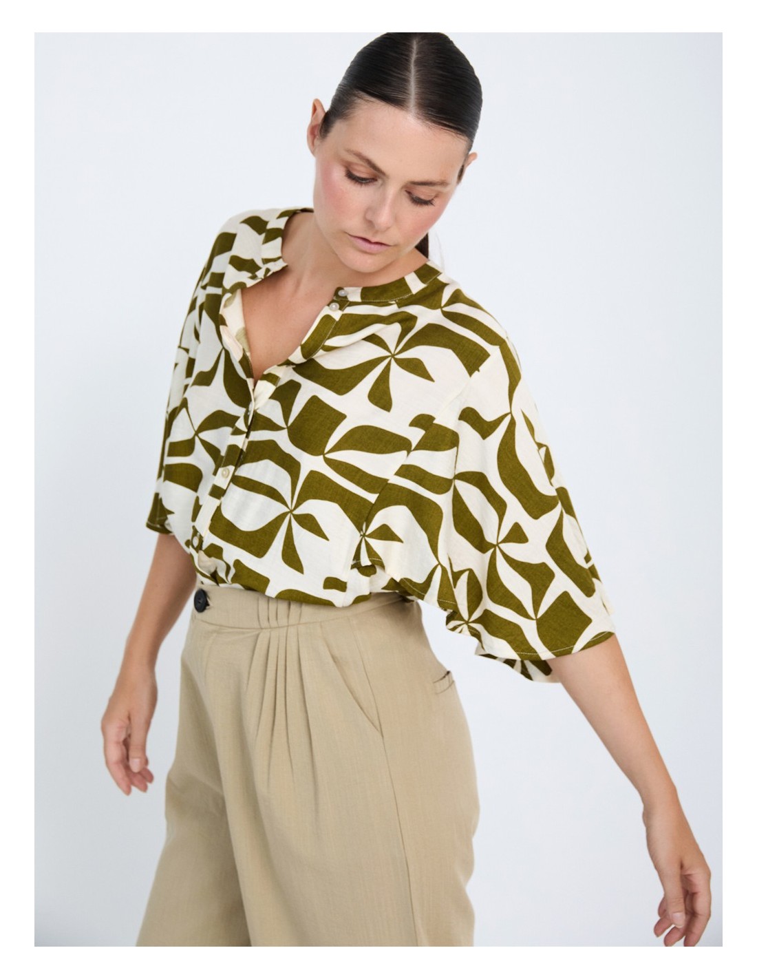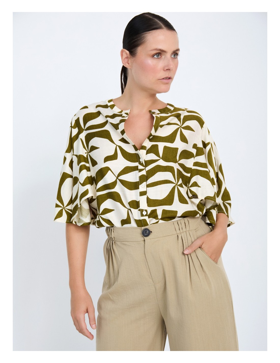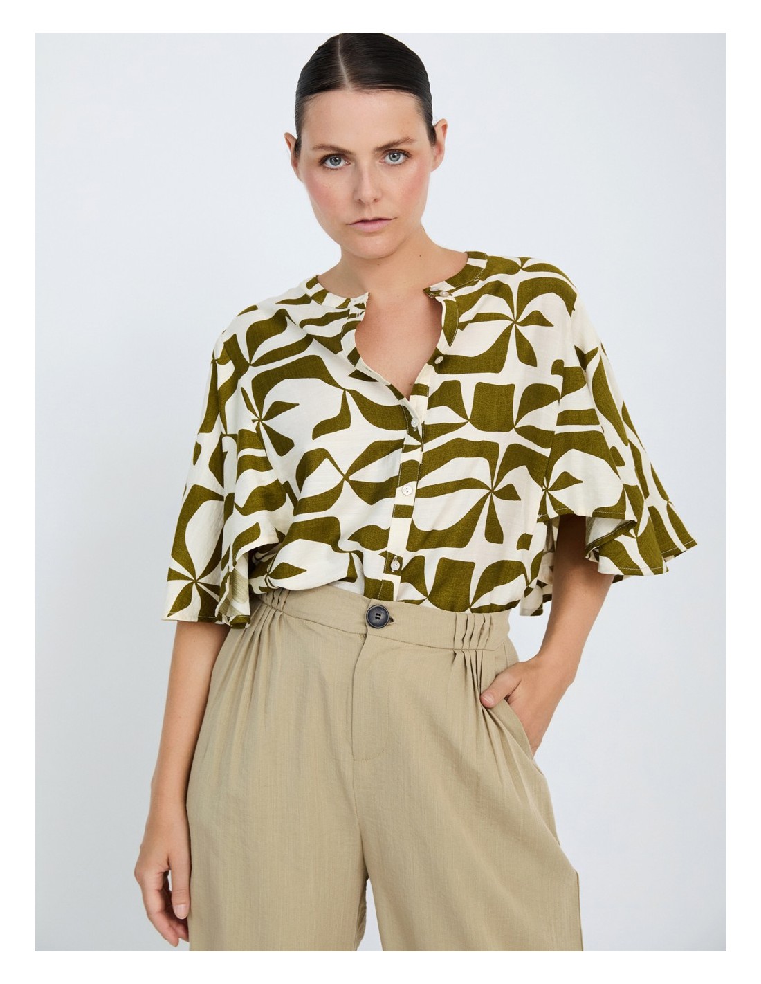 CAMISA EN TEJIDO FLUIDO ESTAMPADO ABSTRACTO ESCOTE REDONDO CON TIRILLA VERDE KAKI Y CRUDO.