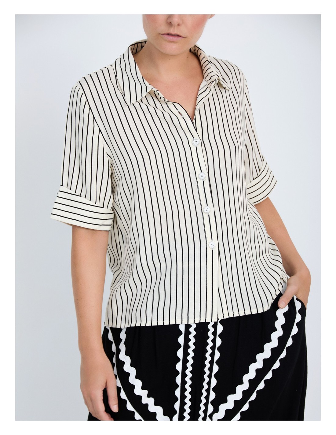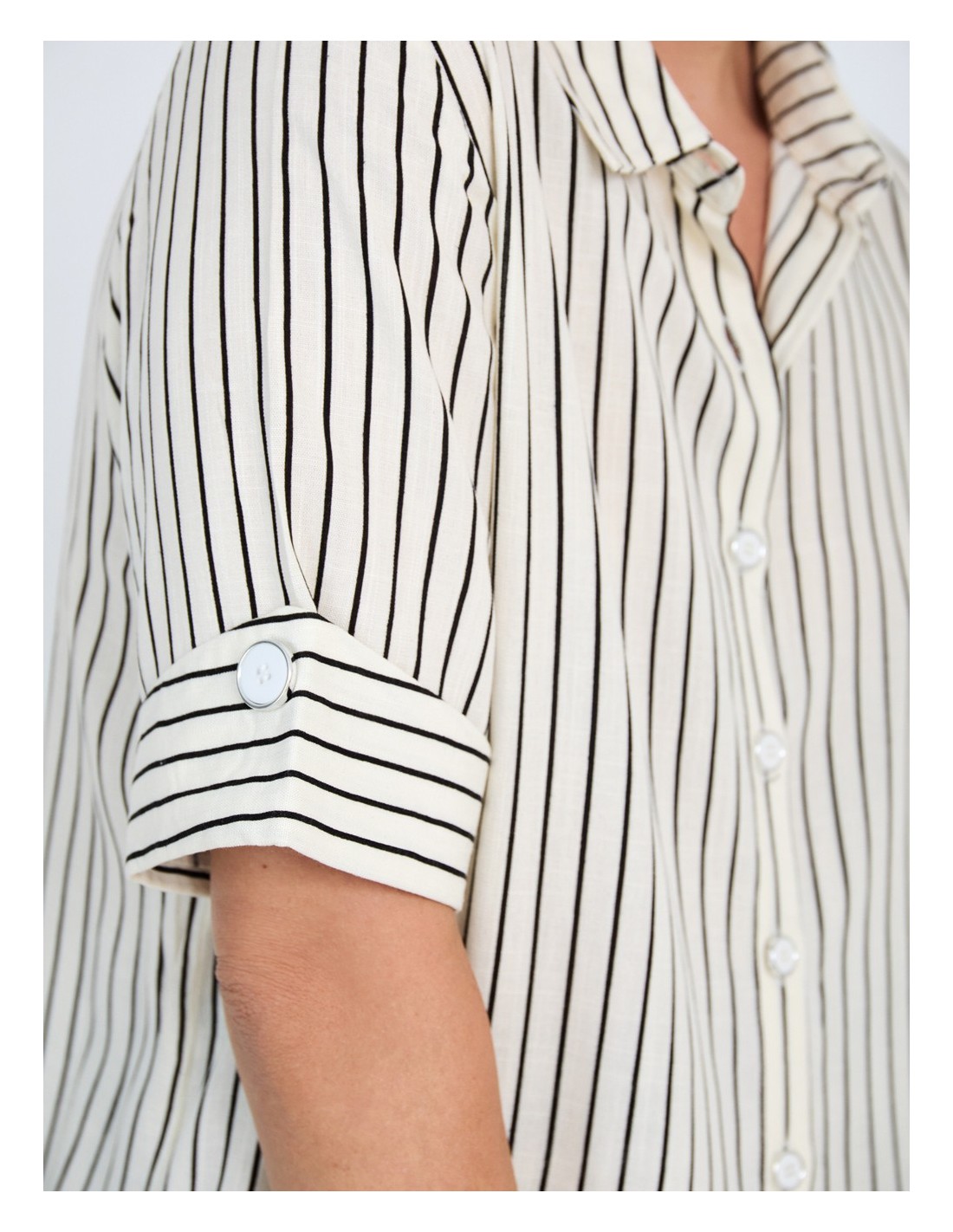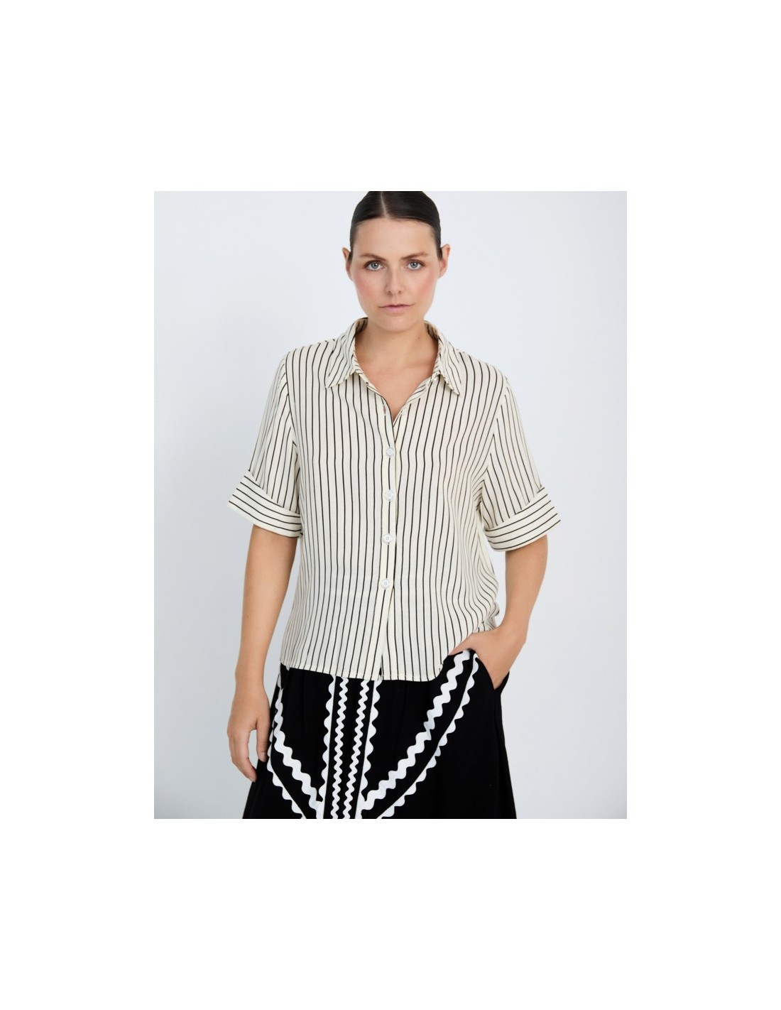 CAMISA EN TEJIDO FLUÍDO DE VISCOSA EN MANGA CORTA CON VUELTA Y CUELLO CLÁSICO. BOTONADURA DE FANTASÍA.