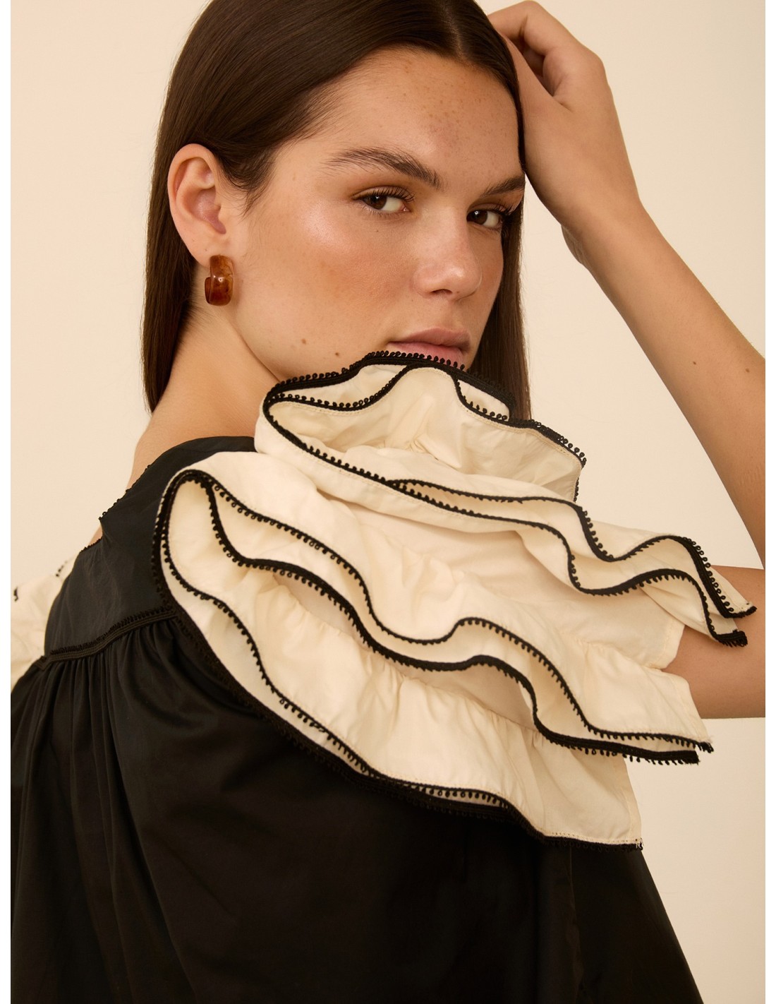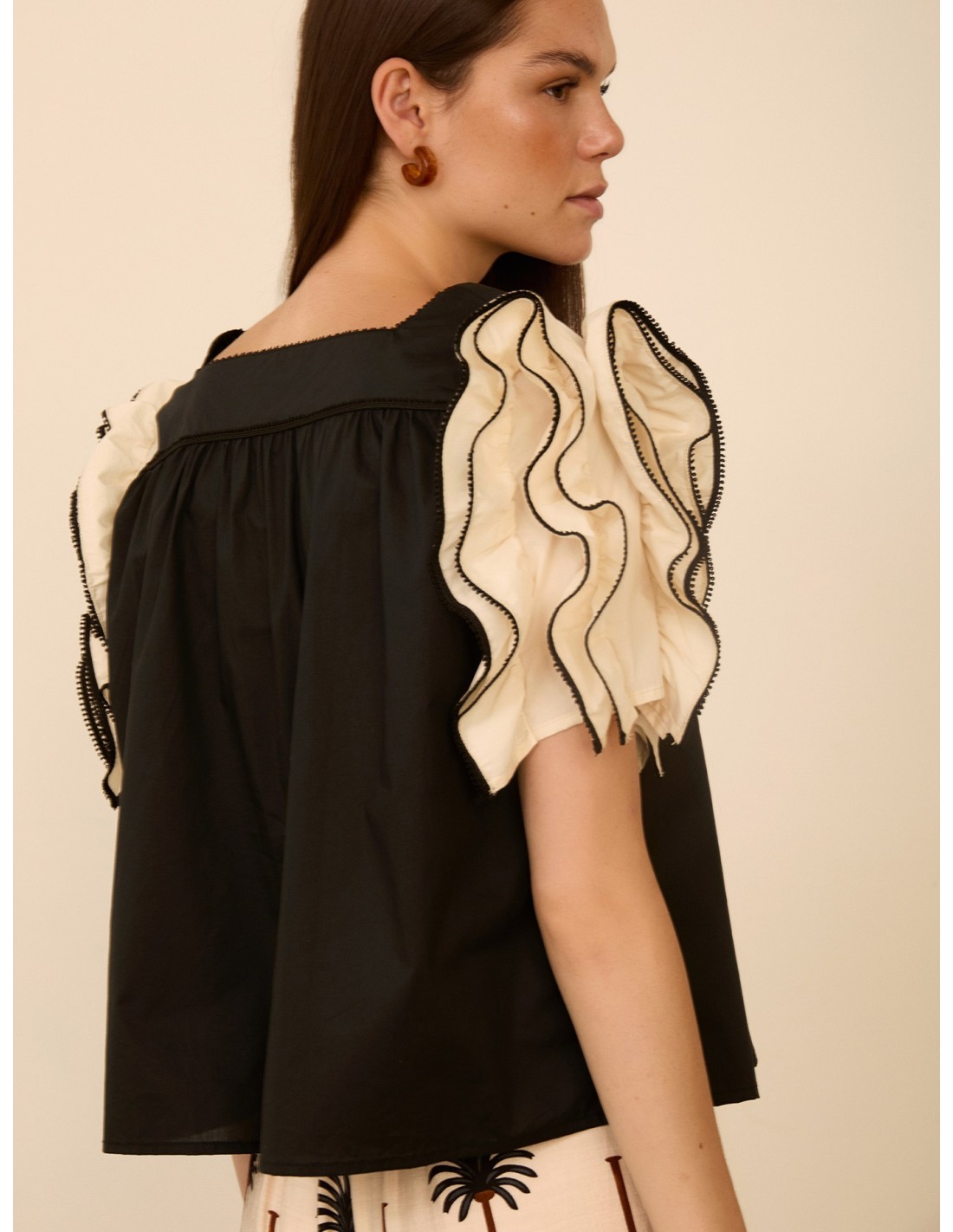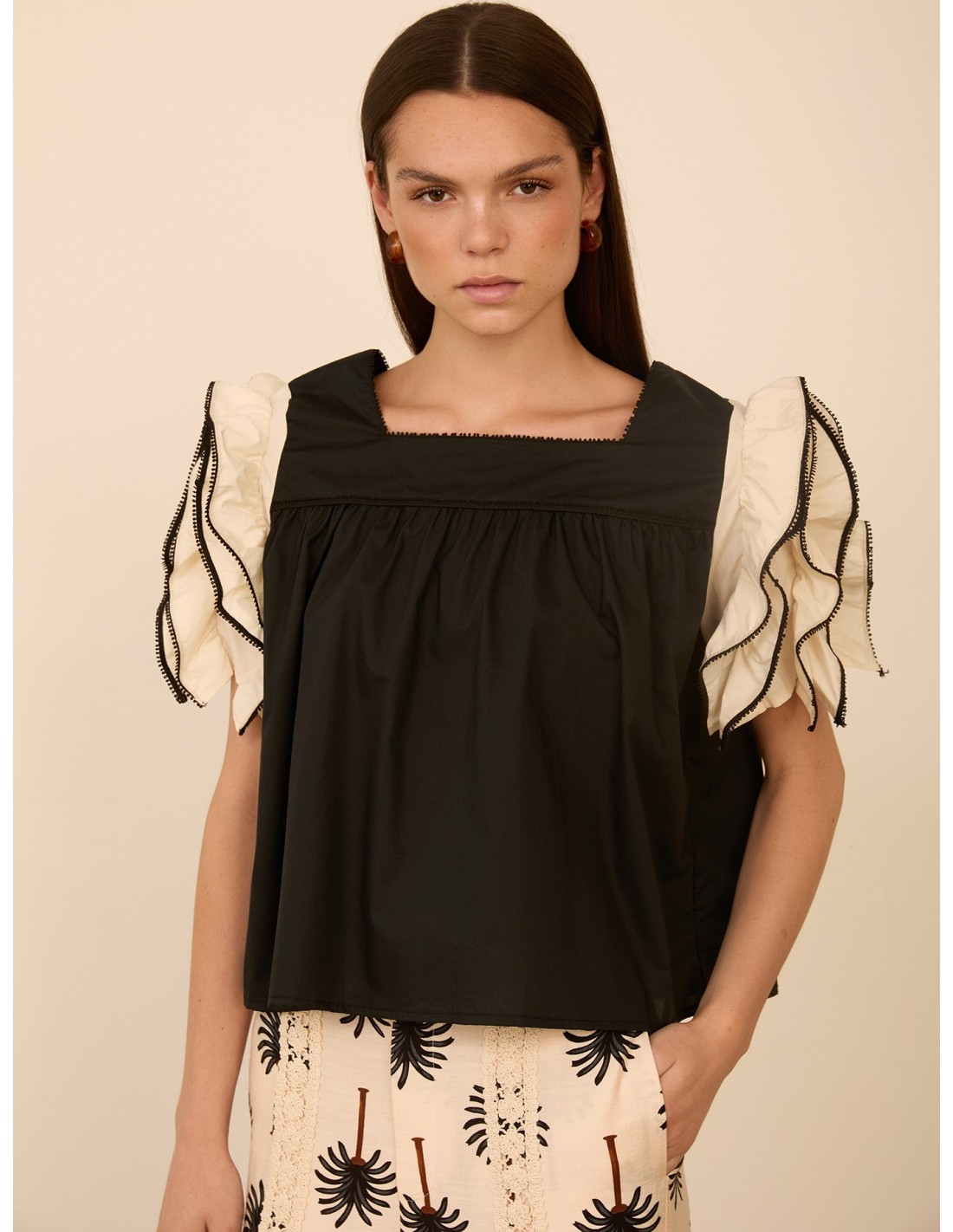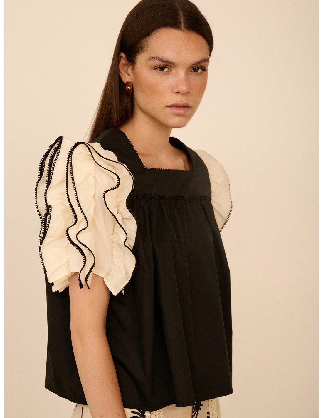 TOP RECTO NEGRO CON FRUNCE Y MANGAS DE VOLANTES EN CRUDO REMATADAS CON VIVO EN CONTRASTE