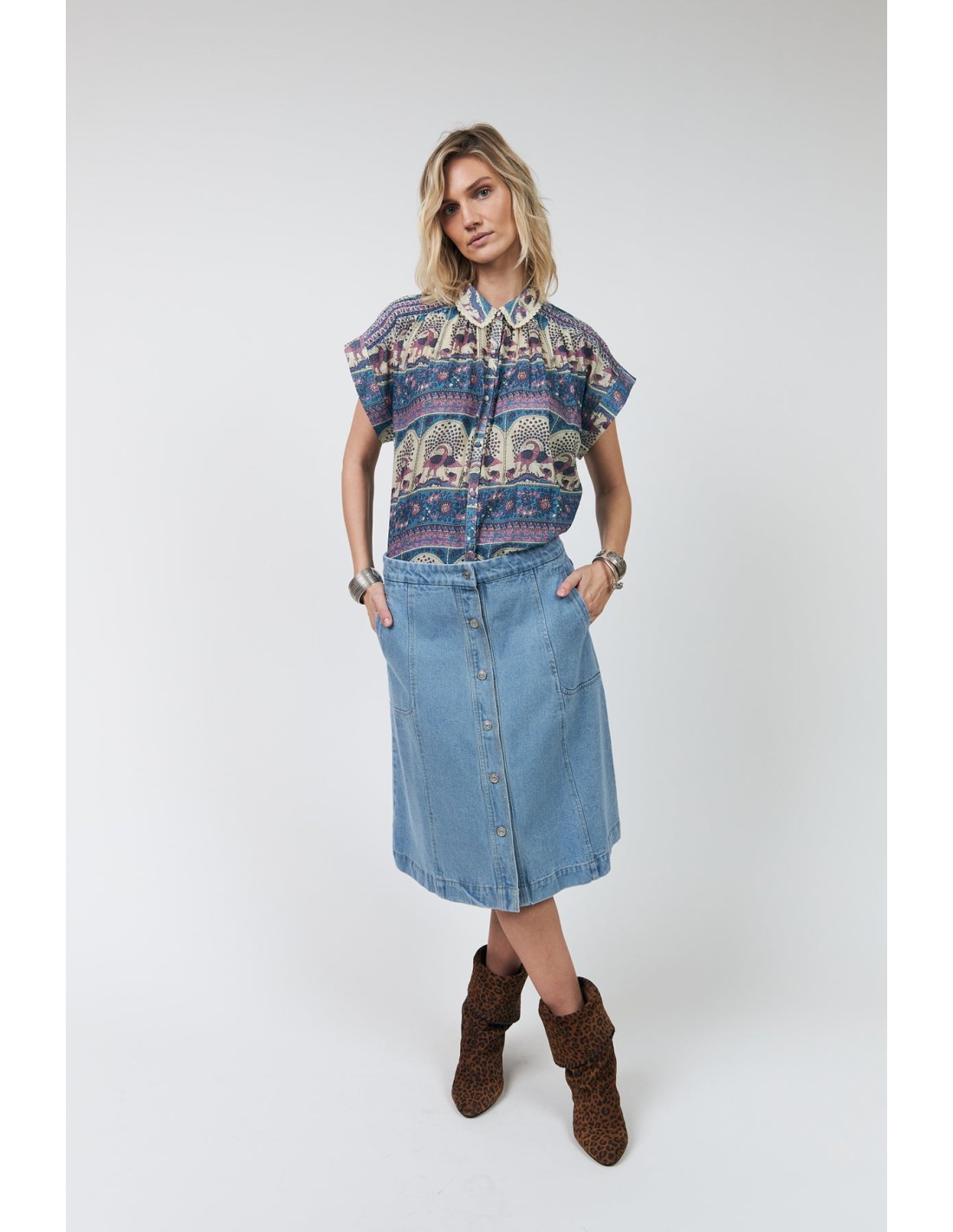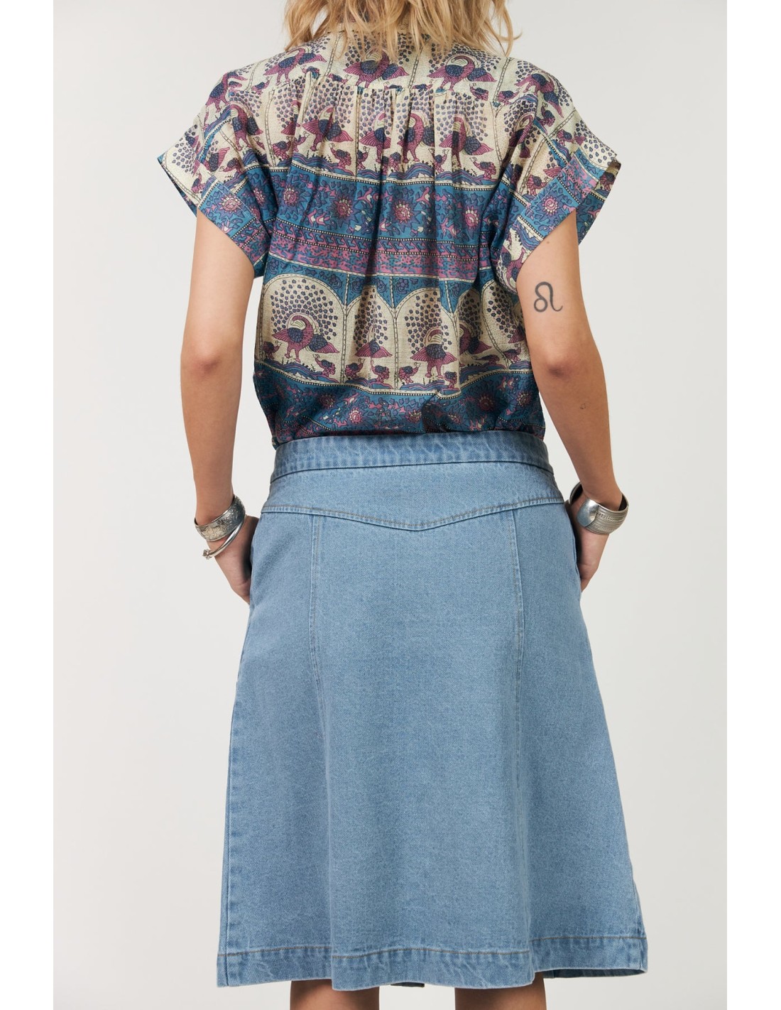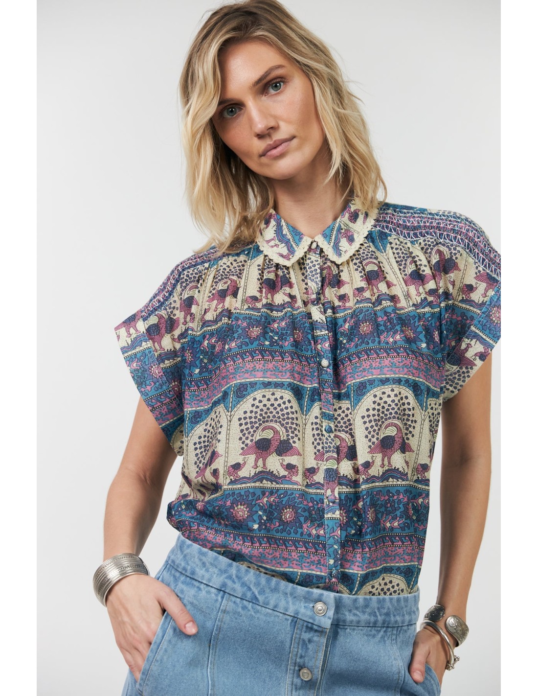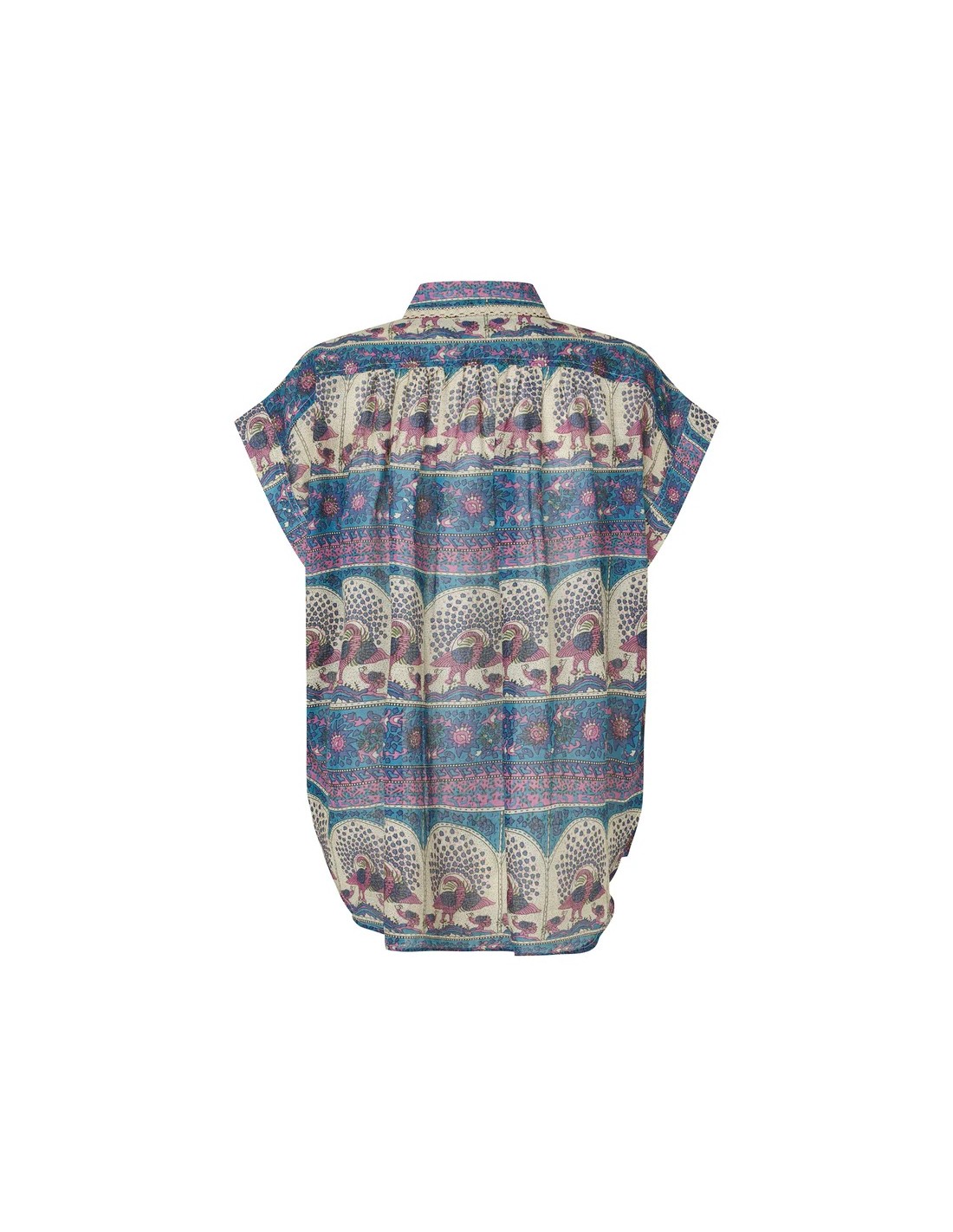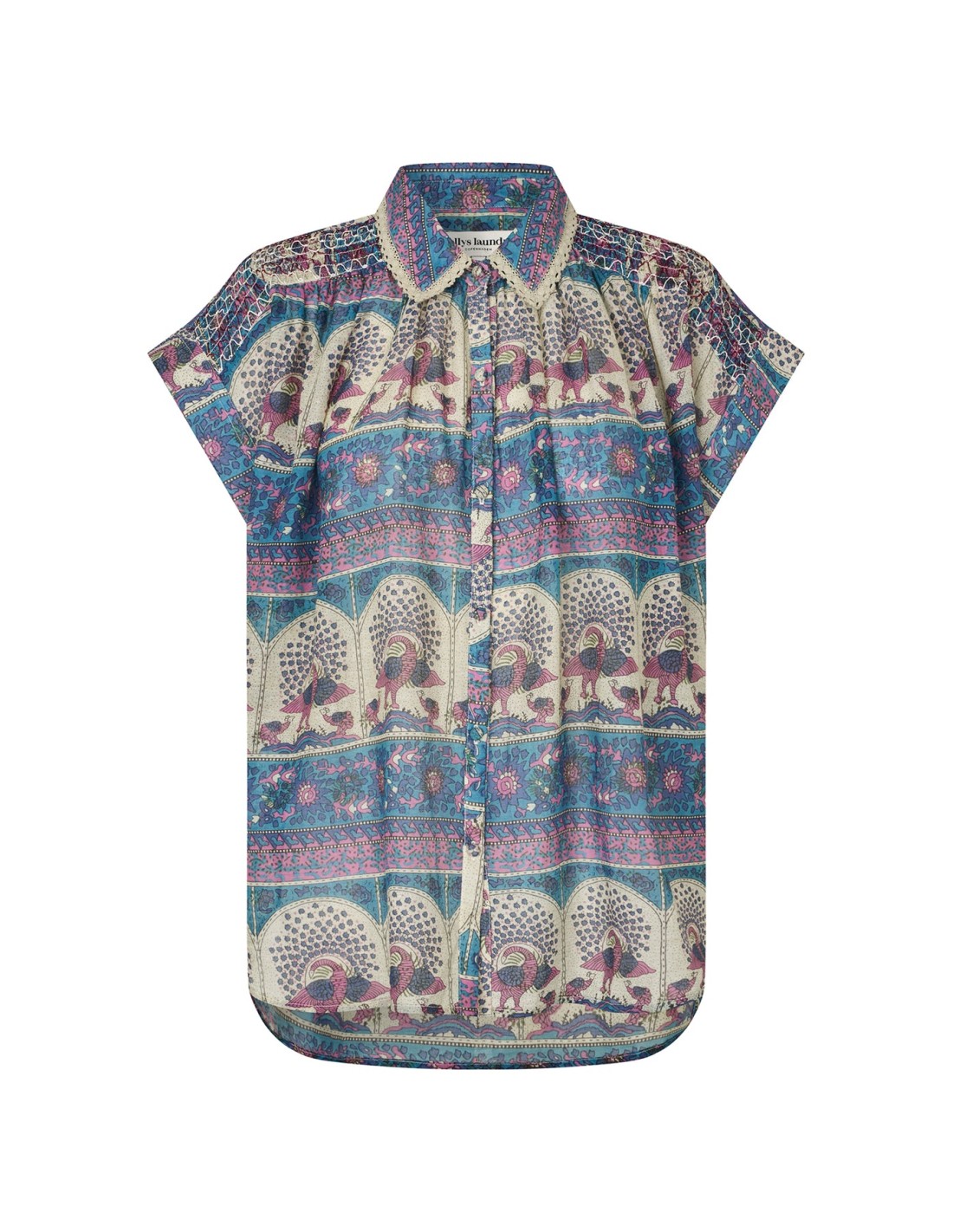 La camisa BadalLL es una camisa femenina de calidad ultra ligera, con un estampado artístico lleno de detalles delicados. La impresión combina bordes ornamentales y motivos ilustrados de pájaros en tonos suaves de azul y rosa. Presenta detalles decorativos en los hombros y preciosos detalles de encaje en el cuello. La camisa combina perfectamente con la falda MyraLL para un look completo.