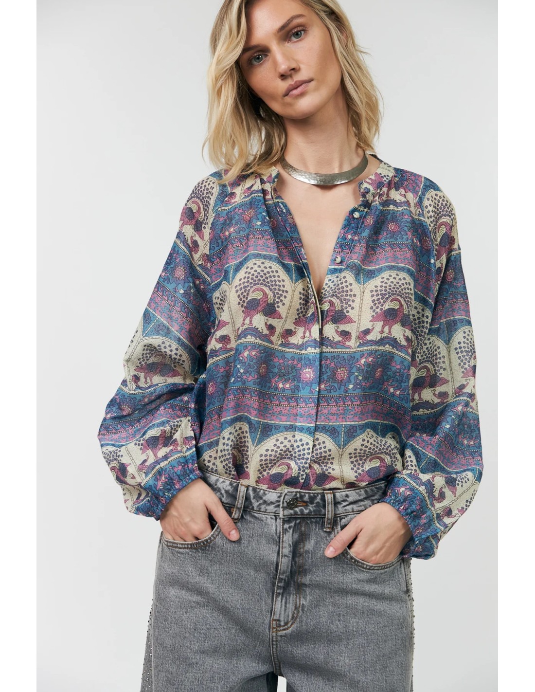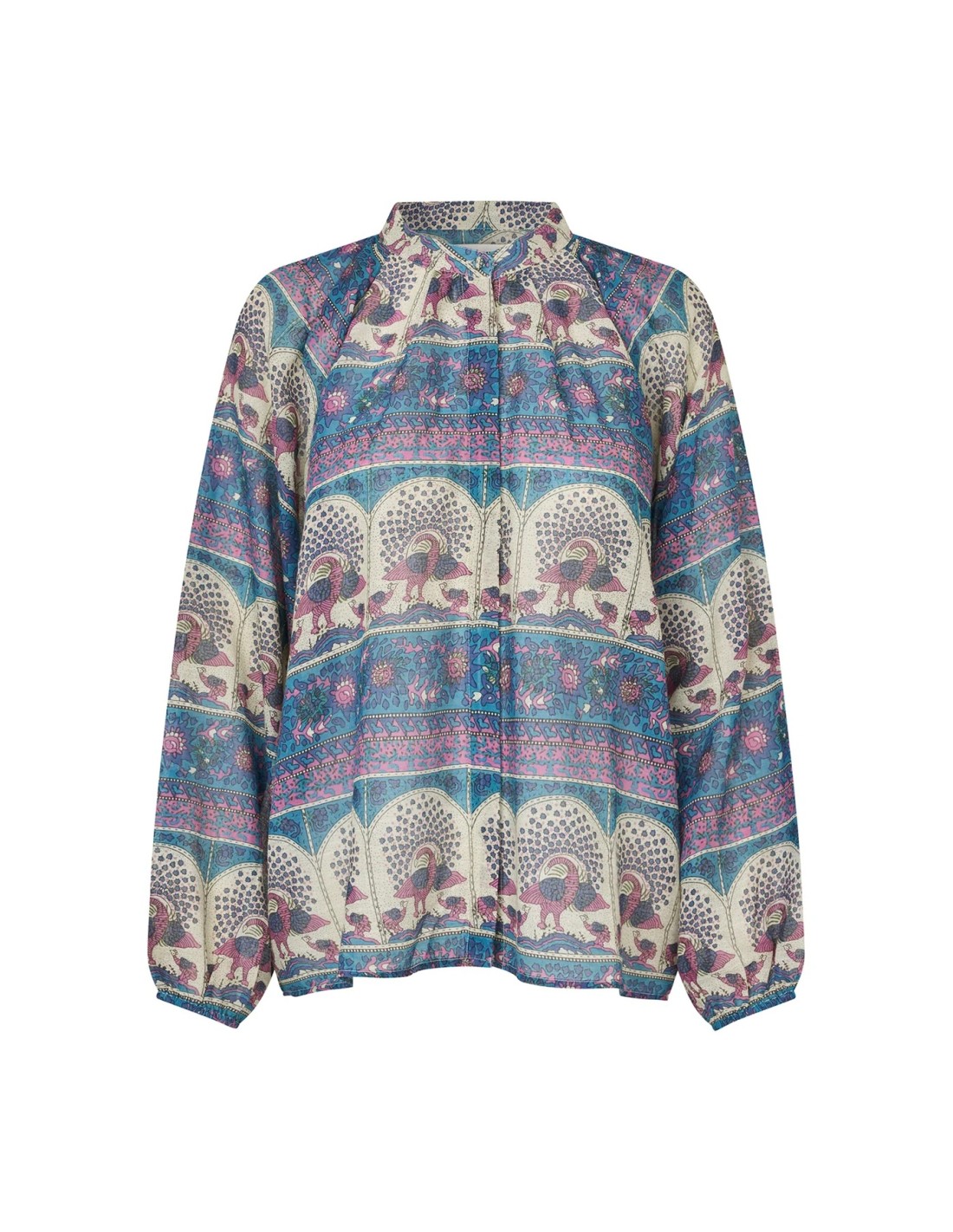La camisa HaileyLL es de estilo femenino hecho de algodón 100% en una calidad ultra ligera con un estampado artístico lleno de detalles delicados. La impresión combina bordes ornamentales y motivos ilustrados de pájaros en tonos suaves de azul y rosa. La camisa combina de maravilla con la falda de MyraLL para un look completo.