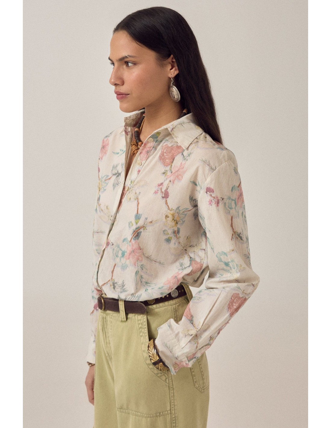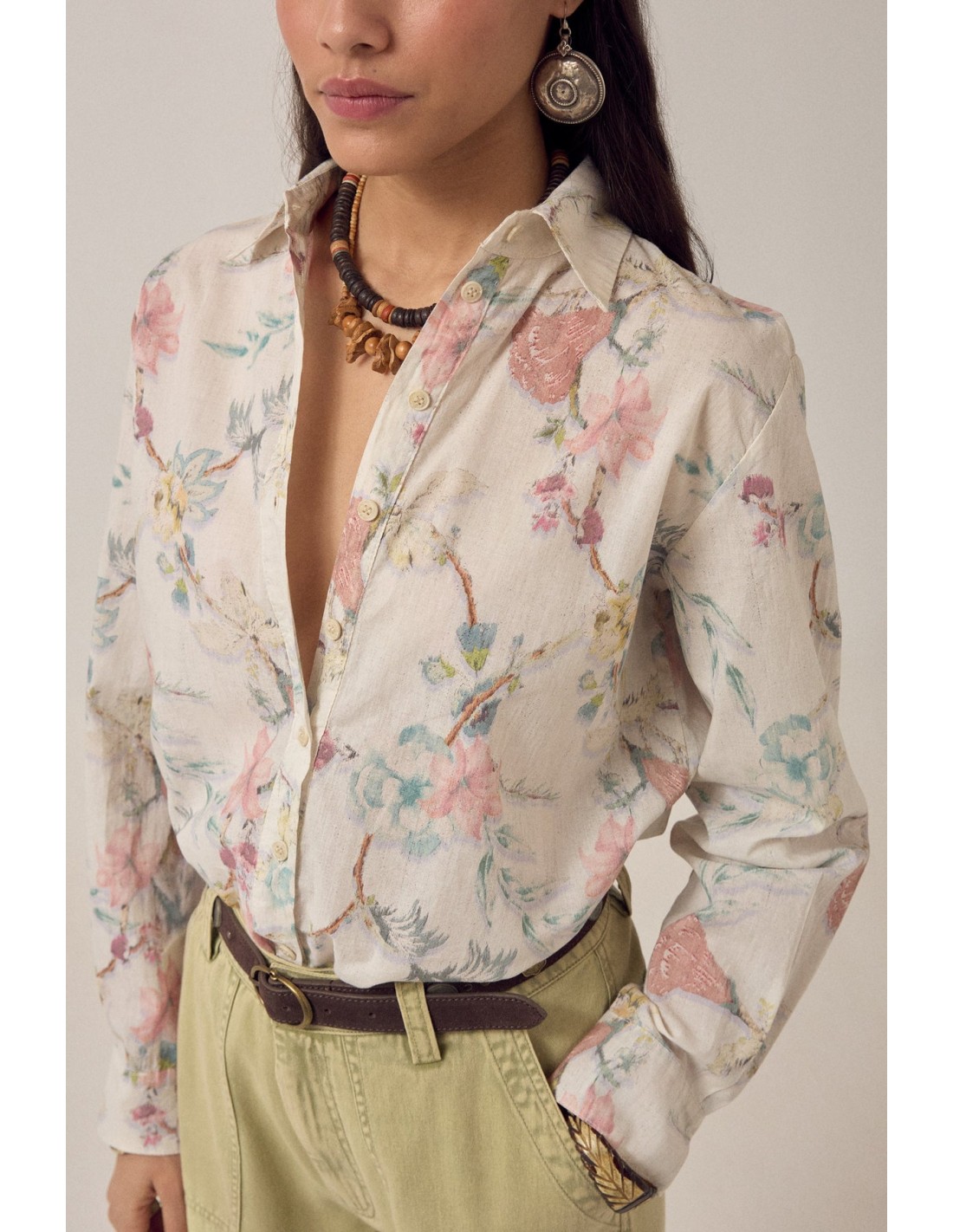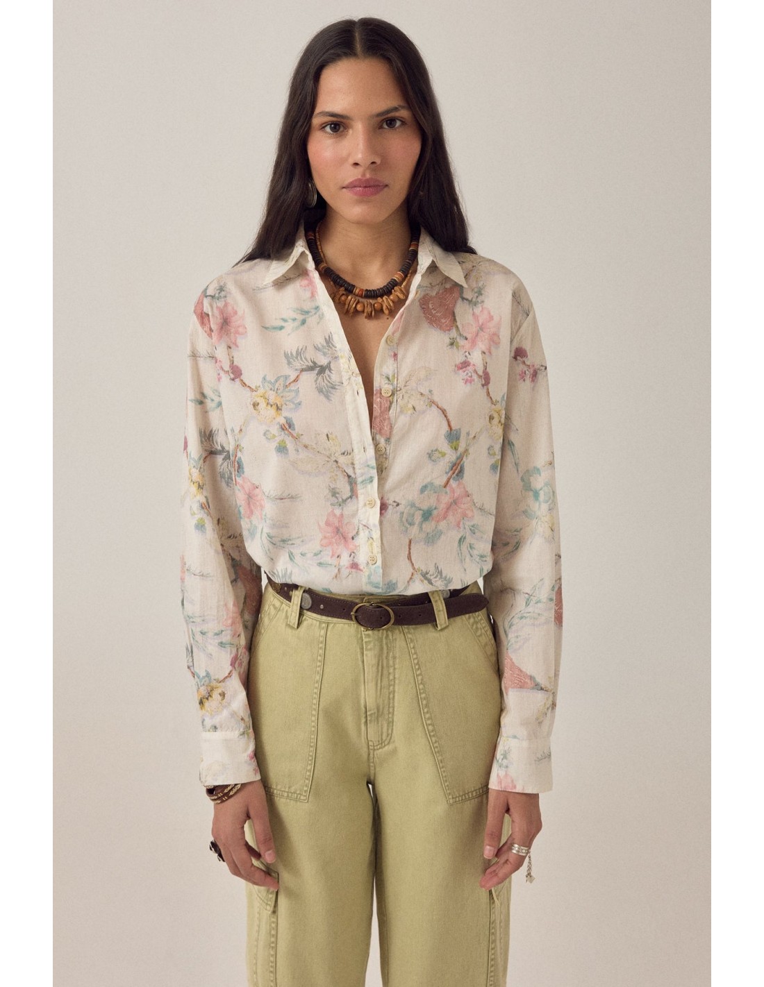 Bautizada en honor a la flor del narciso: delicada, un poco salvaje, imposible de ignorar. Esta camisa presenta un suave estampado floral con flores rosa melocotón dispersas sobre algodón color crema. De corte holgado, cuello clásico, cierre frontal de botones y mangas largas. Lo suficientemente amplia para sentirse cómoda, pero con un aspecto impecable.