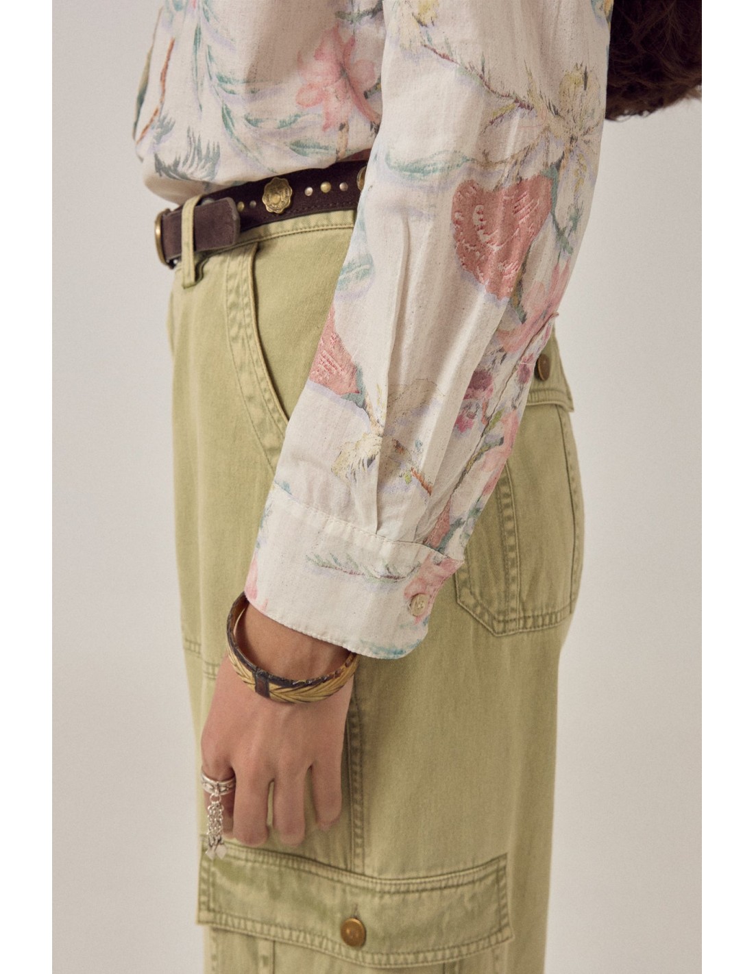 Los colores son suaves y deslavados, como si hubieran estado expuestos al sol durante años. Queda bien metida por dentro de pantalones de talle alto o suelta sobre vaqueros. Combina a la perfección con el pantalón Botanica Lirio para un look estampado sobre estampado, o con vaqueros para un estilo más sencillo.