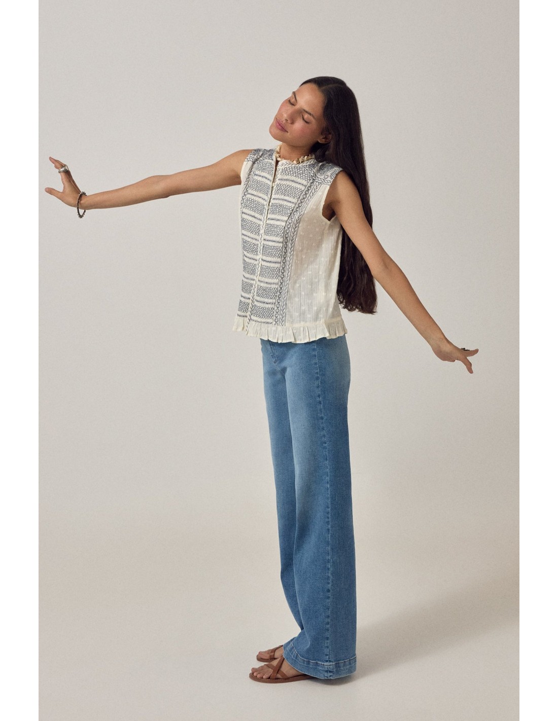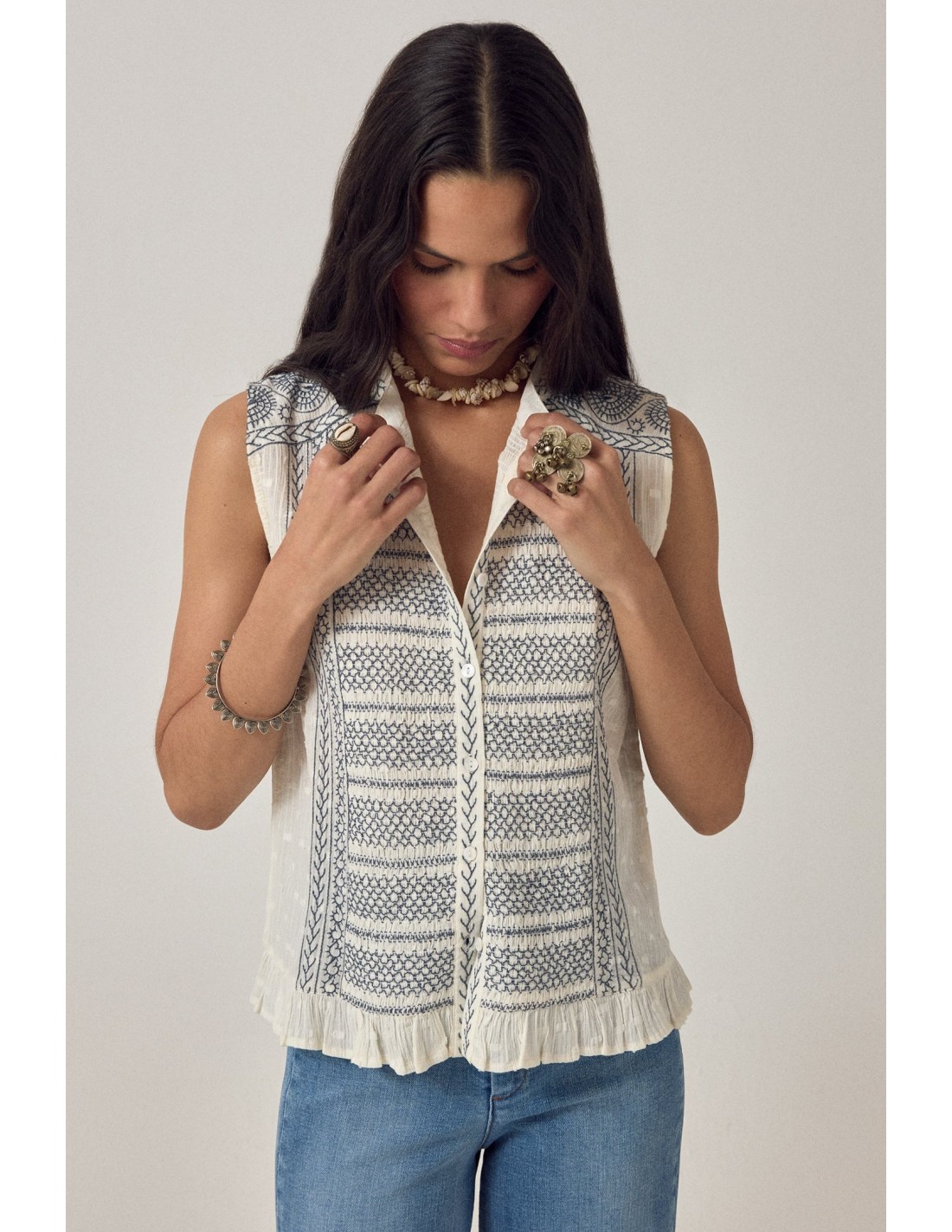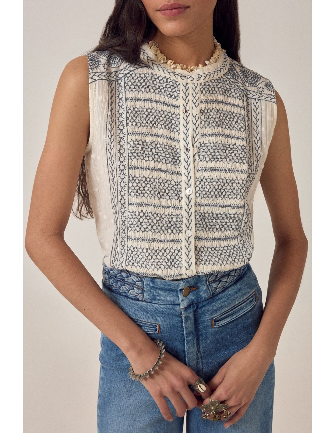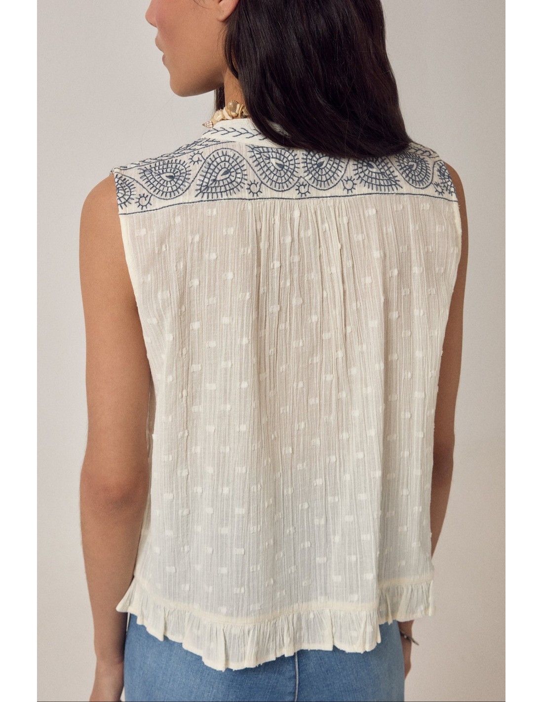 Blusa sin mangas de suave gasa de algodón color crema con bordado azul marino en el panel frontal. Escote redondo con ribete bordado, cierre de botones, corte ajustado y volante en el bajo. El bordado enmarca el panel central.