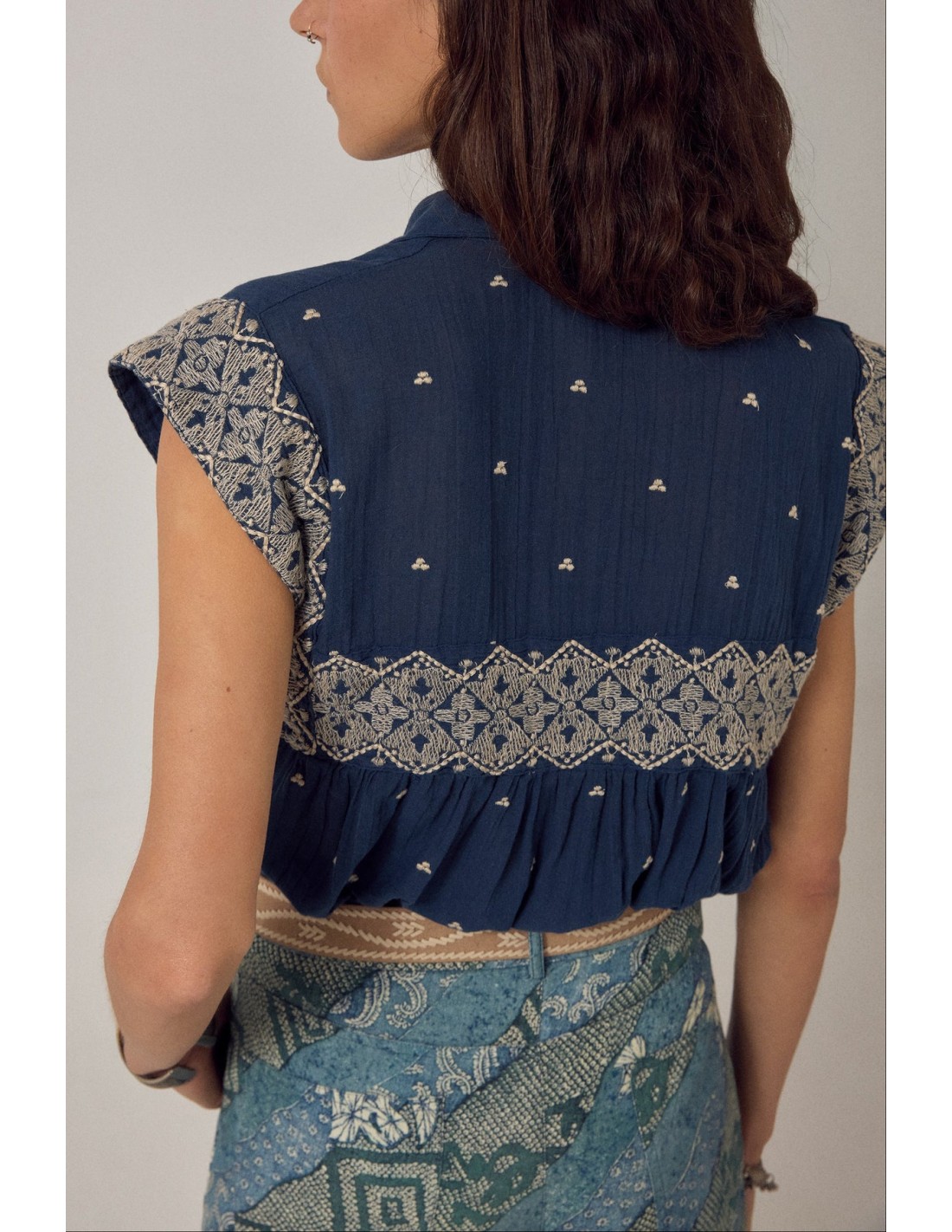 Base azul intenso, casi tinta, de color intenso pero tacto ligero. Pequeñas marcas blancas bordadas se distribuyen por la superficie, irregulares y espaciadas como trazos más que como un patrón. Rompen la intensidad del azul sin suavizarlo. Los paneles de encaje en los hombros aportan textura y tensión, no decoración. Maison Hotel.