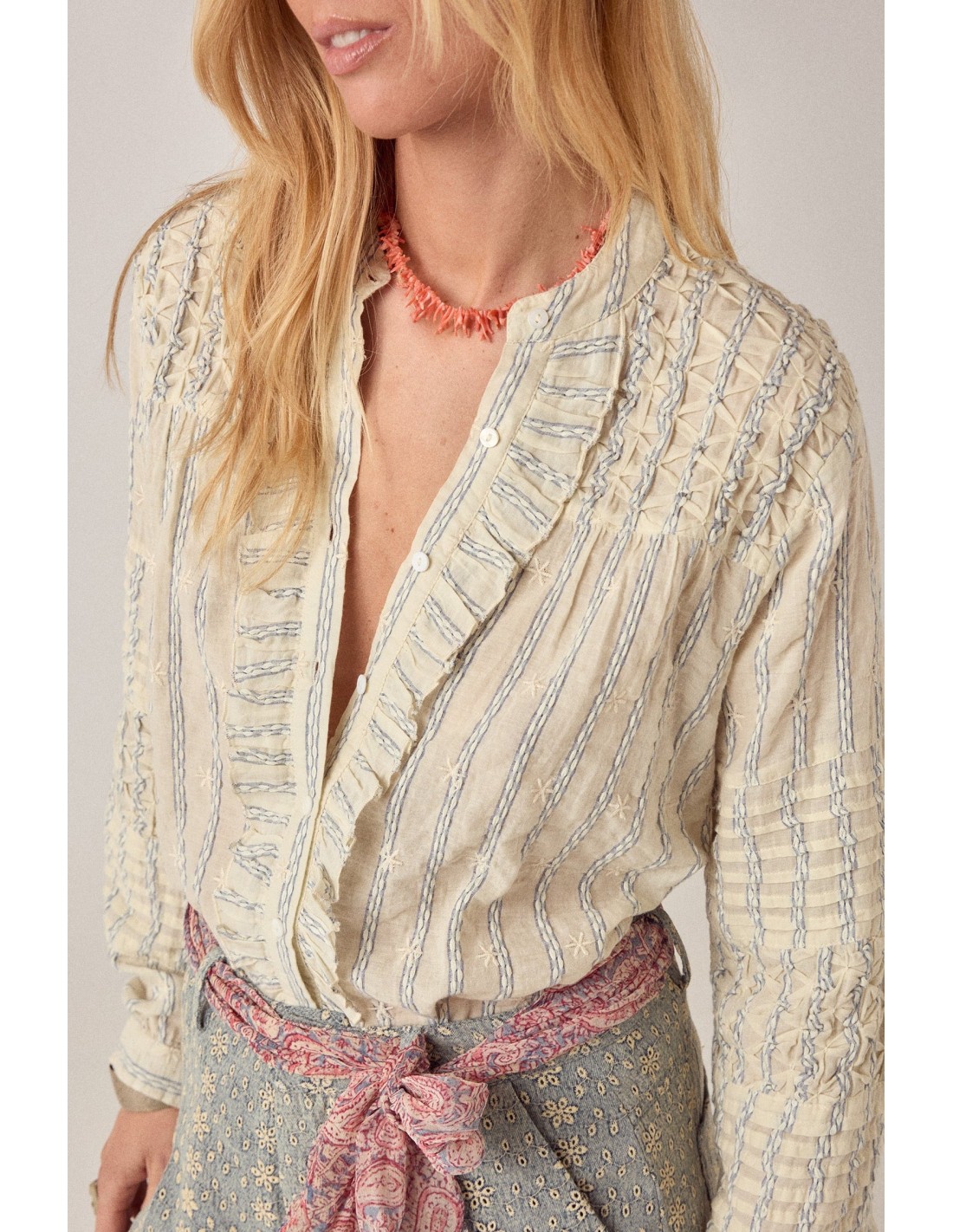 Blusa de manga larga en algodón. Con cuello, camisa abotonada y volantes a lo largo de la línea de botones. Insertos de encaje y puntadas finas por todo el conjunto. Mangas largas con volumen y facilidad. Ajuste suelto, sin forzar.