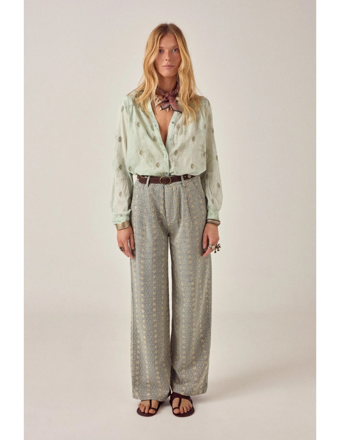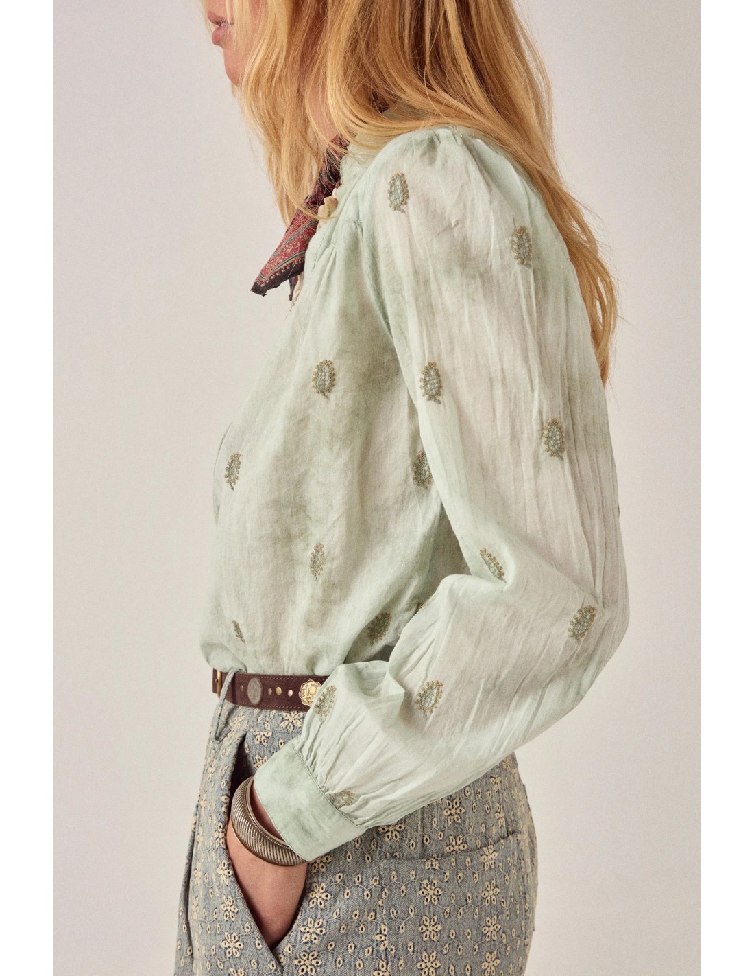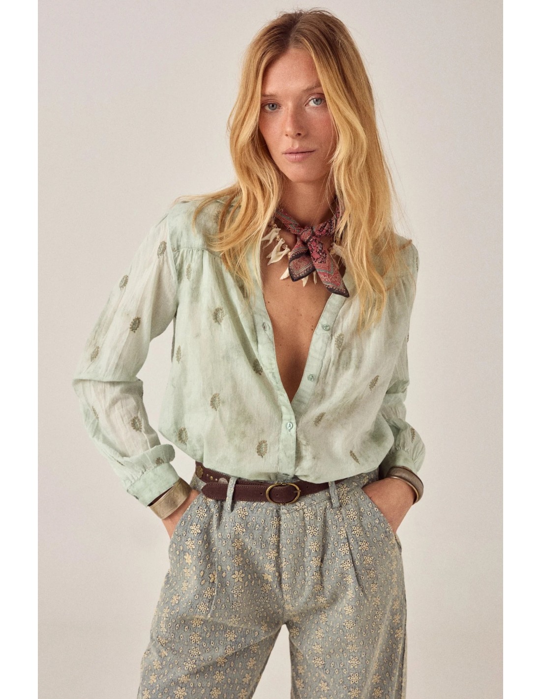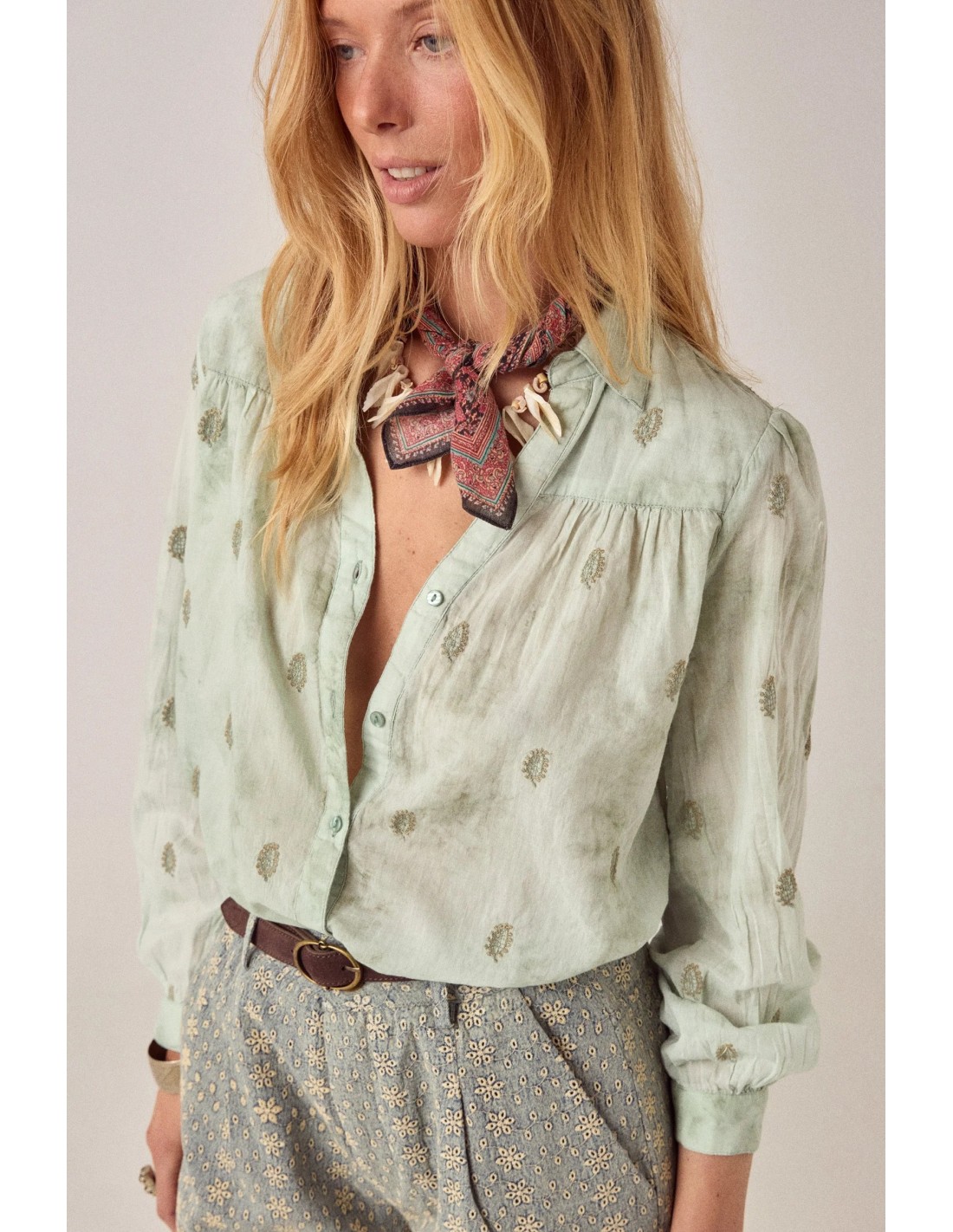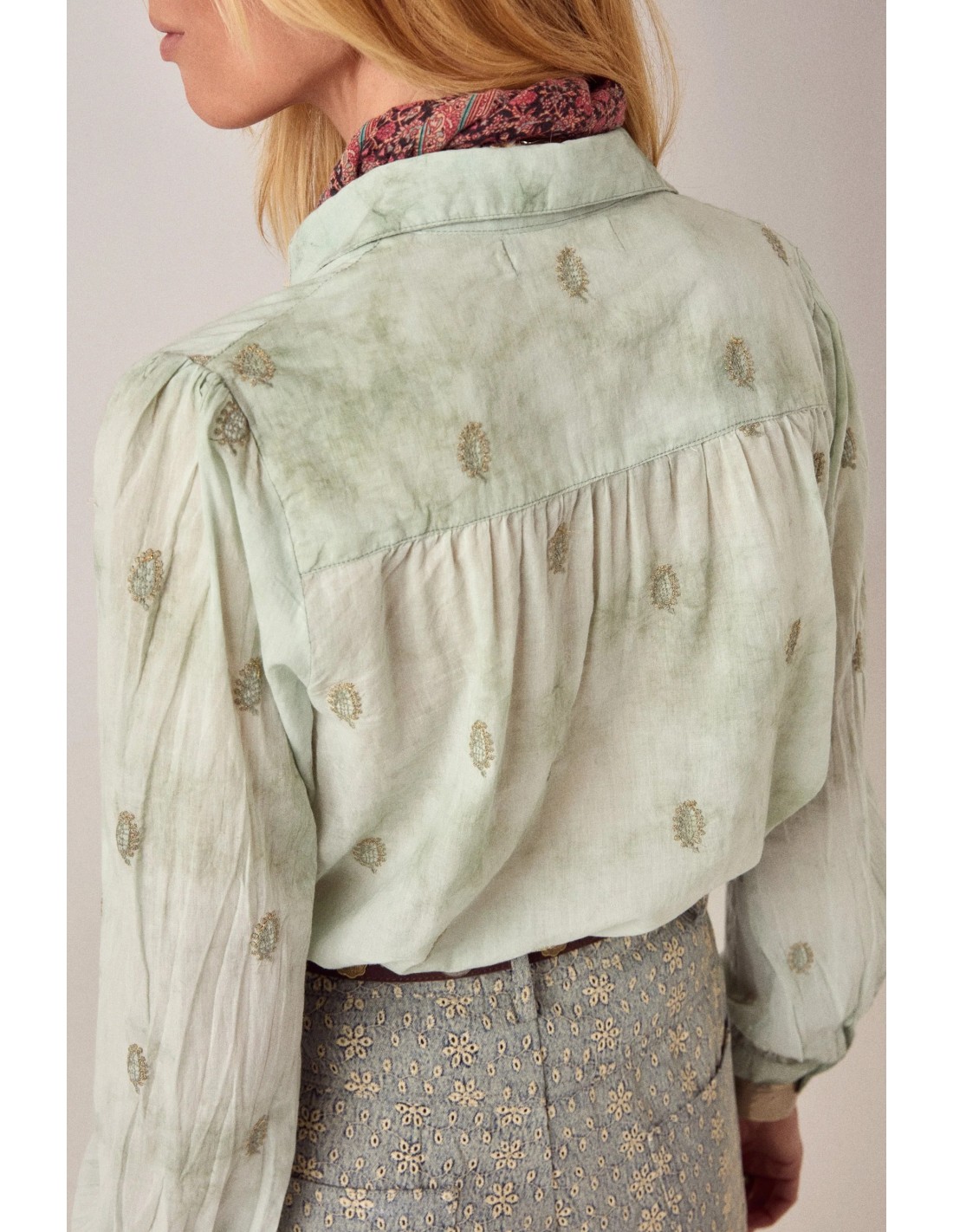 Camisa de manga larga en verde mineral teñido a mano. El tinte de ligadura se mueve entre translúcido y saturado — no hay dos piezas que caigan exactamente en el mismo lugar. Pequeños motivos bordados por toda la superficie le dan al color algo al que aferrarse.