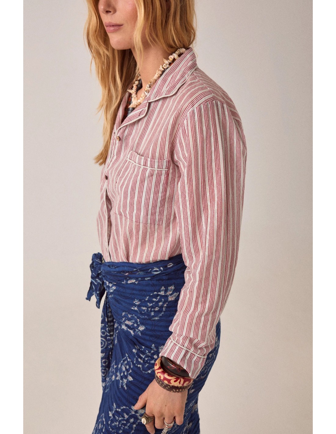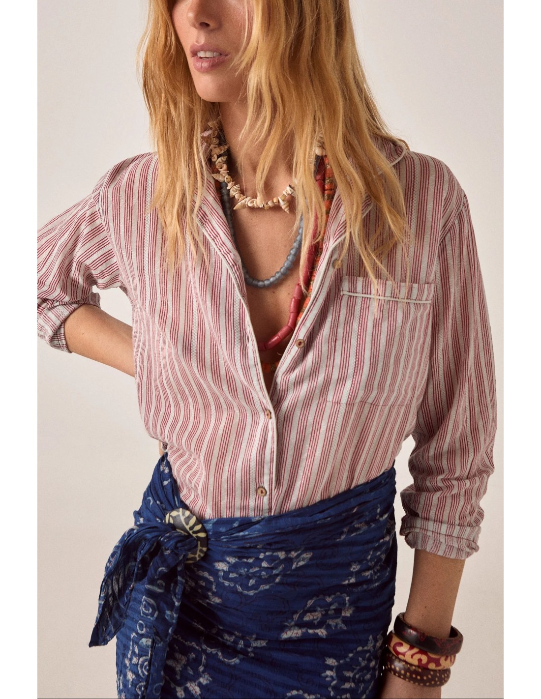 Camisa relajada en fina capa de algodón doblado. Cuello con cuello, camisa abotonada delante, mangas largas con puños abotonados. Silueta, inspirada en pijamas, fácil y despreocupada. Diseñado para llevarse sin reglas.