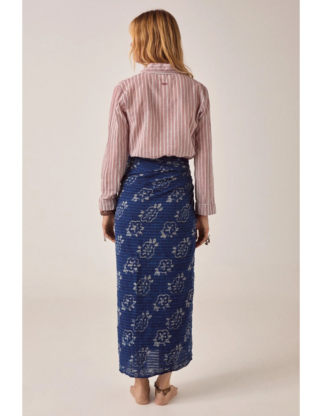 Base azul claro con rayas verticales color vino—cálidas y profundas, relajadas en lugar de pulidas. Toma de camisetas de pijama vintage y piezas heredadas. Las rayas se sienten íntimas y familiares, como tela prestada de otro tiempo.