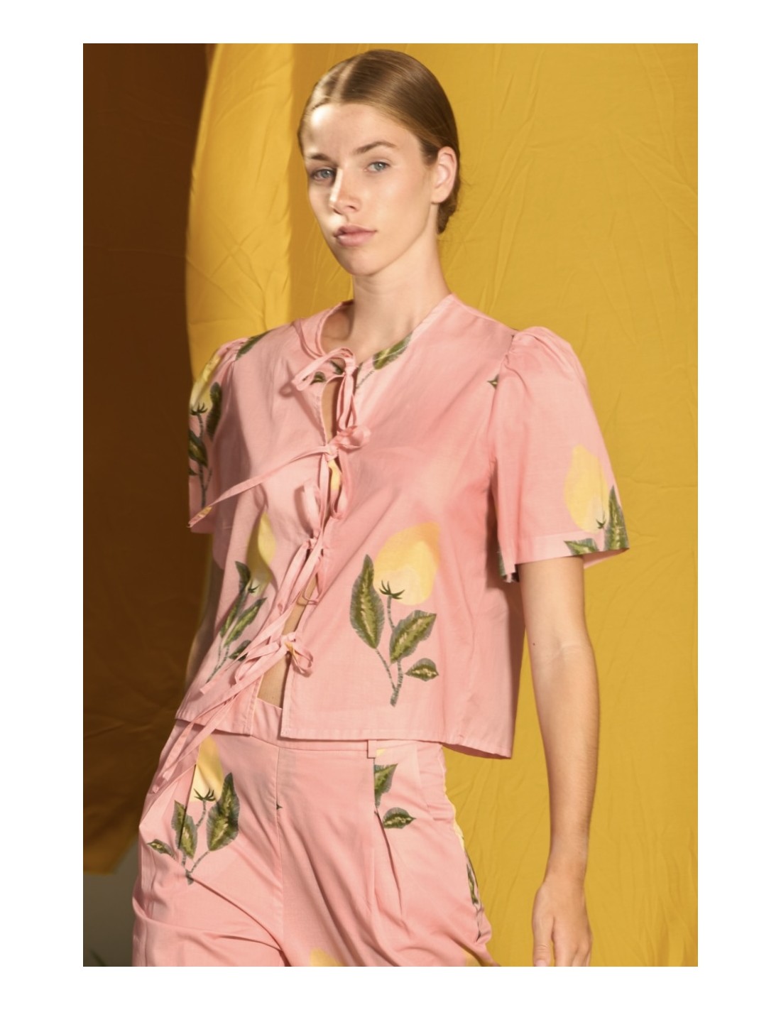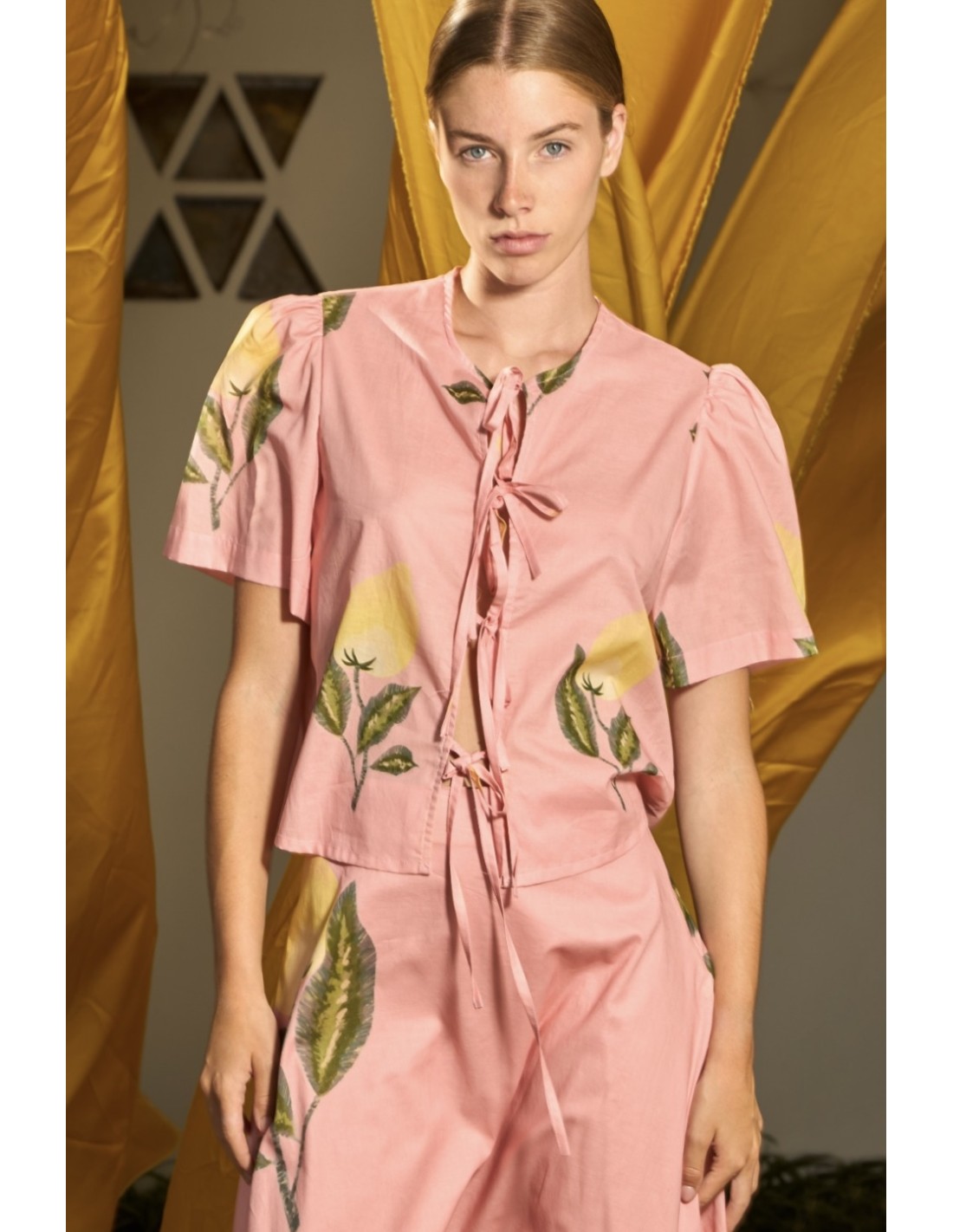 Su diseño en tono rosa con estampado botánico se realza con un favorecedor escote con lazadas frontales y mangas cortas con ligero volumen, aportando un aire femenino y actual. Su corte relajado la convierte en una prenda cómoda y fácil de combinar, ideal tanto sola como en conjunto con la falda.