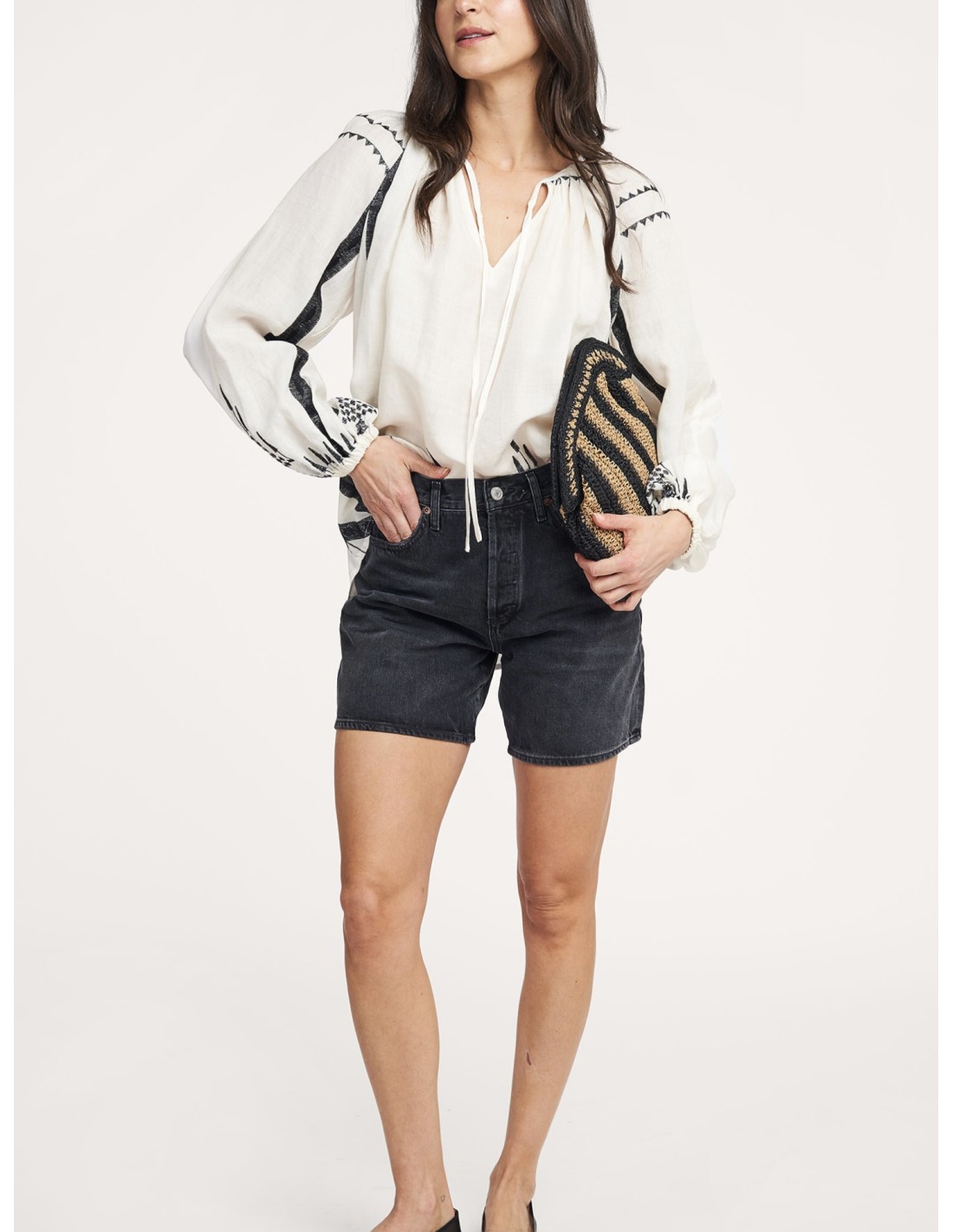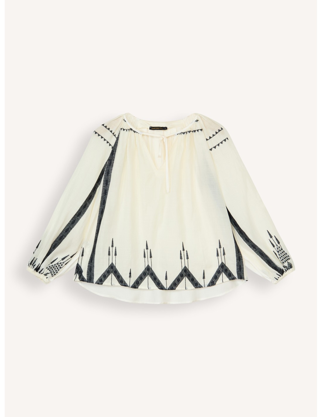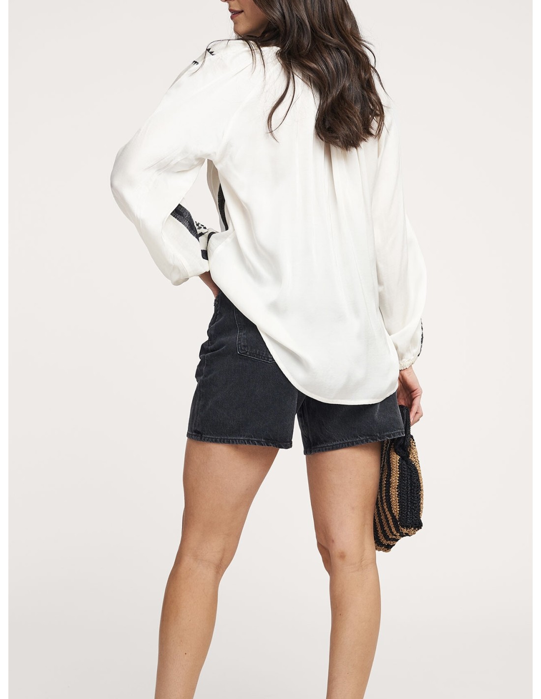 Top bimateria en algodón y satén de viscosa con bordados en negro. Cuello con frunce estilo tunecino. Greek Archaic Kori.