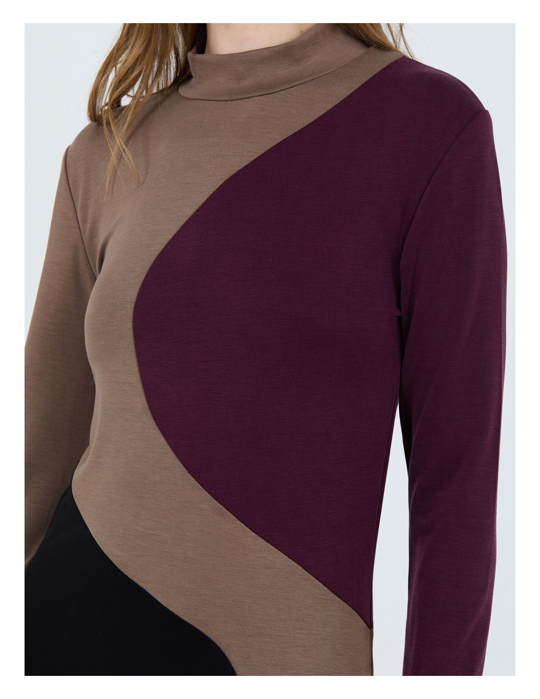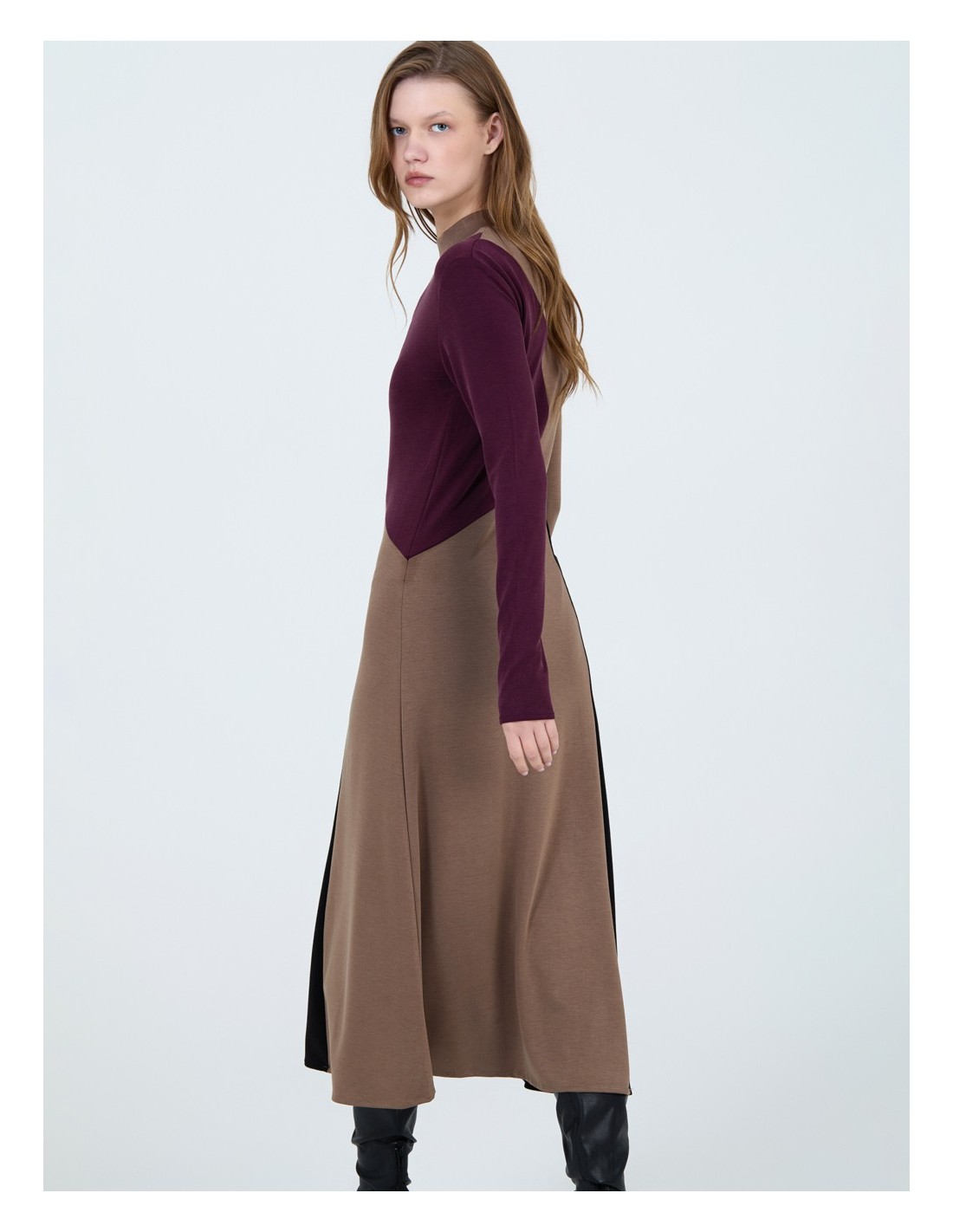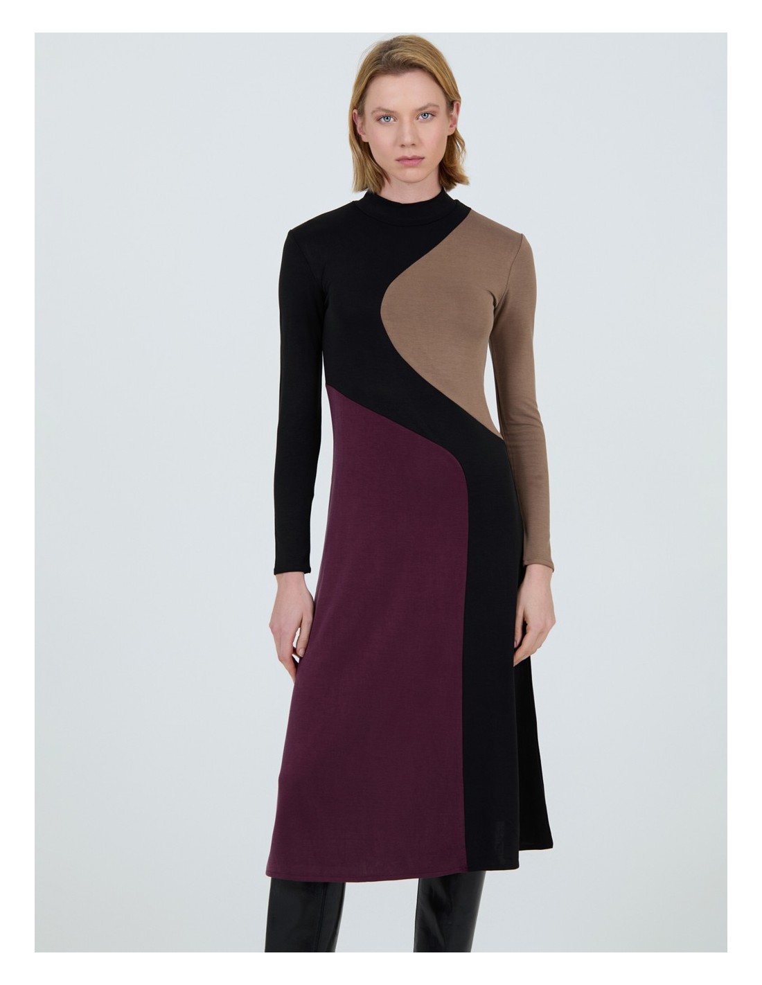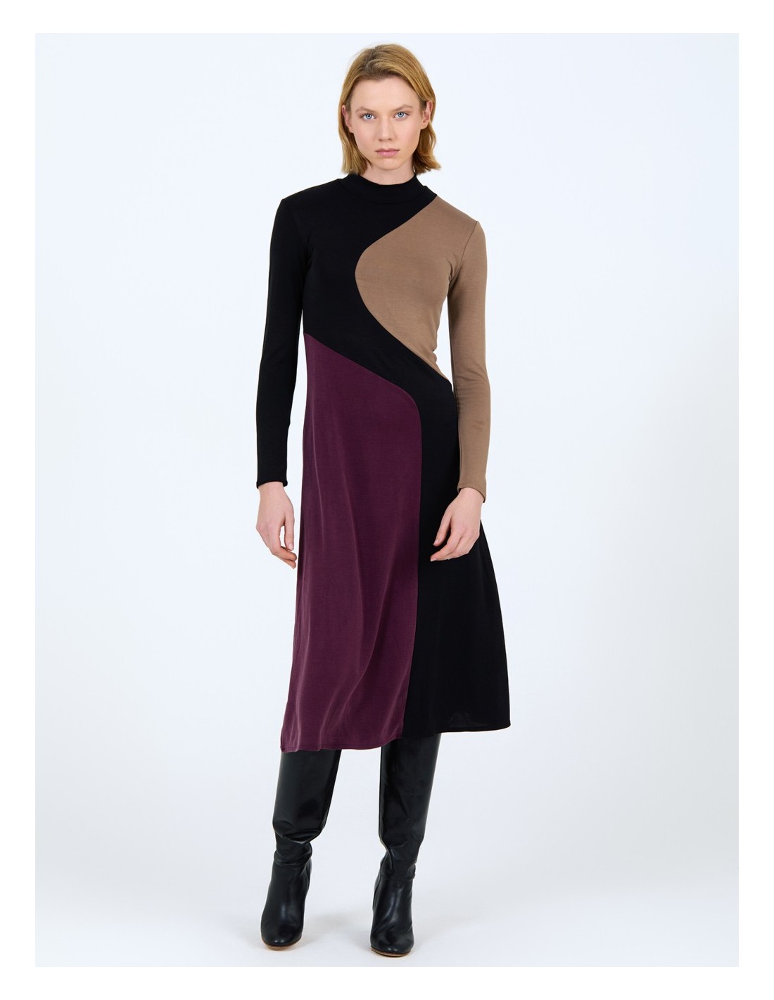 Vestido midi con tejido elástico mezcla de viscosa extrasuave. Cuello perkins y manga larga. Diseño tipo patchwork tricolor. 48% VISCOSA 43%POLIESTER 9% ELASTAN
