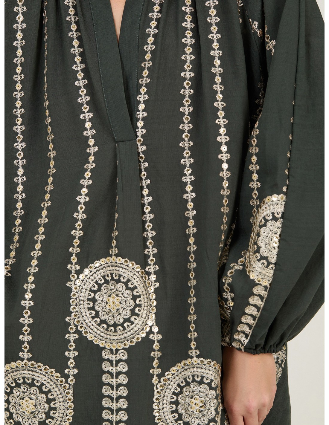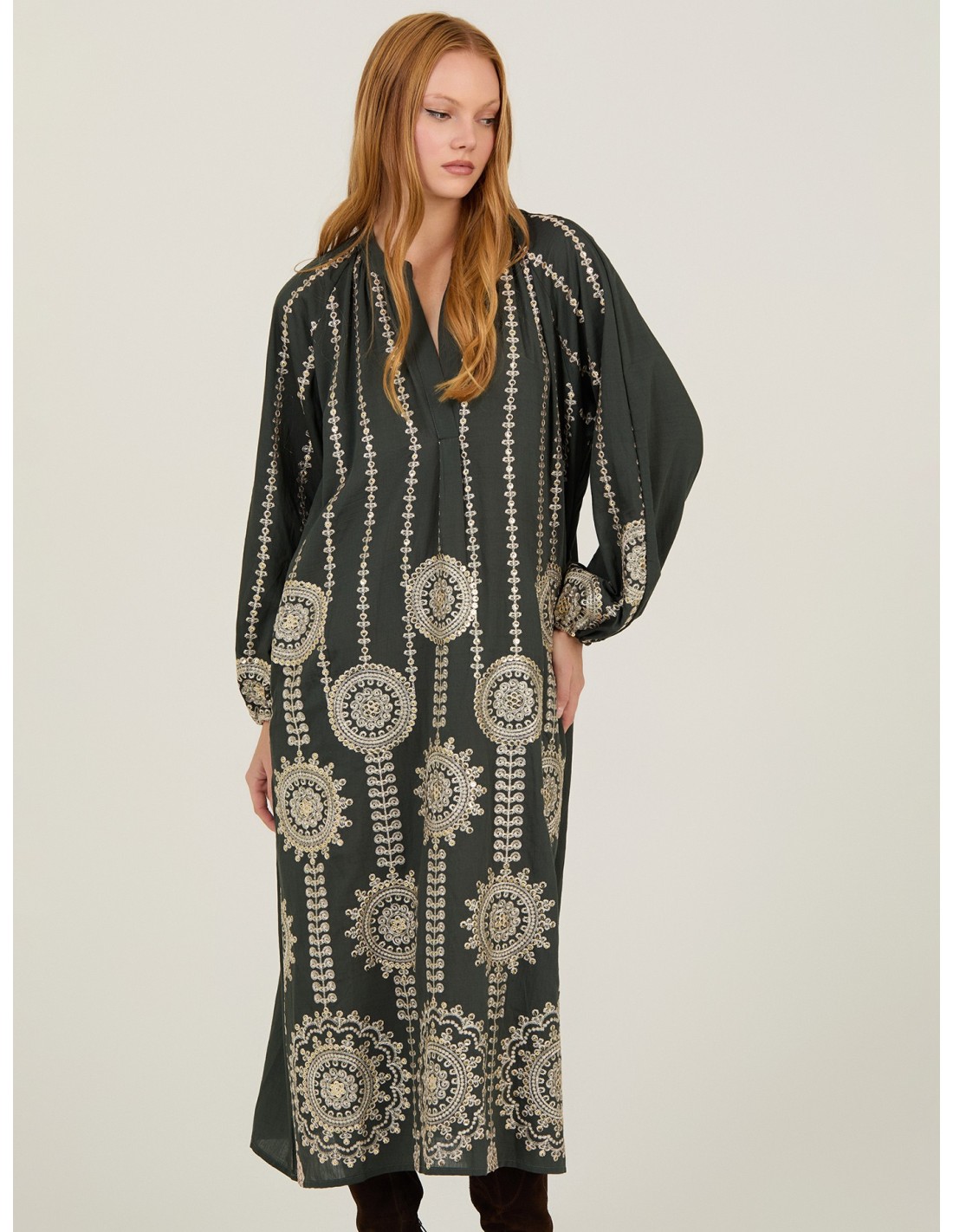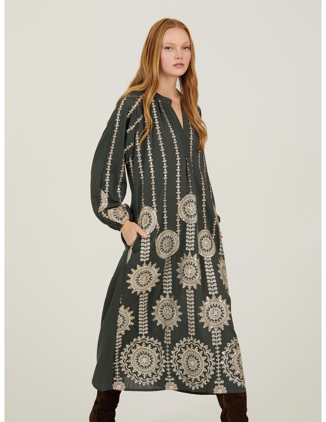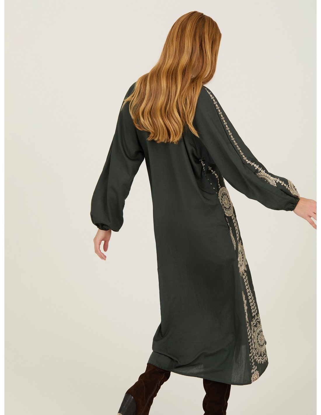Sumérgete en la elegancia bohemia con este exquisito vestido largo de Meisie, confeccionado en suave viscosa verde oscuro para una caída fluida y un tacto lujoso. El diseño se realza con intrincados bordados en plata que adornan la prenda, creando un patrón deslumbrante que captura la luz con cada movimiento. Con un estilo relajado pero sofisticado, este vestido es perfecto para cualquier ocasión, desde un evento especial hasta un día casual con un toque de distinción. Sus mangas largas y escote en V aportan un aire chic y versátil, mientras que los bolsillos laterales añaden funcionalidad. Una pieza única que combina comodidad y estilo, ideal para la mujer moderna que busca destacar con un encanto atemporal.