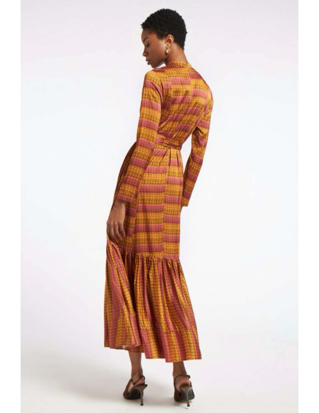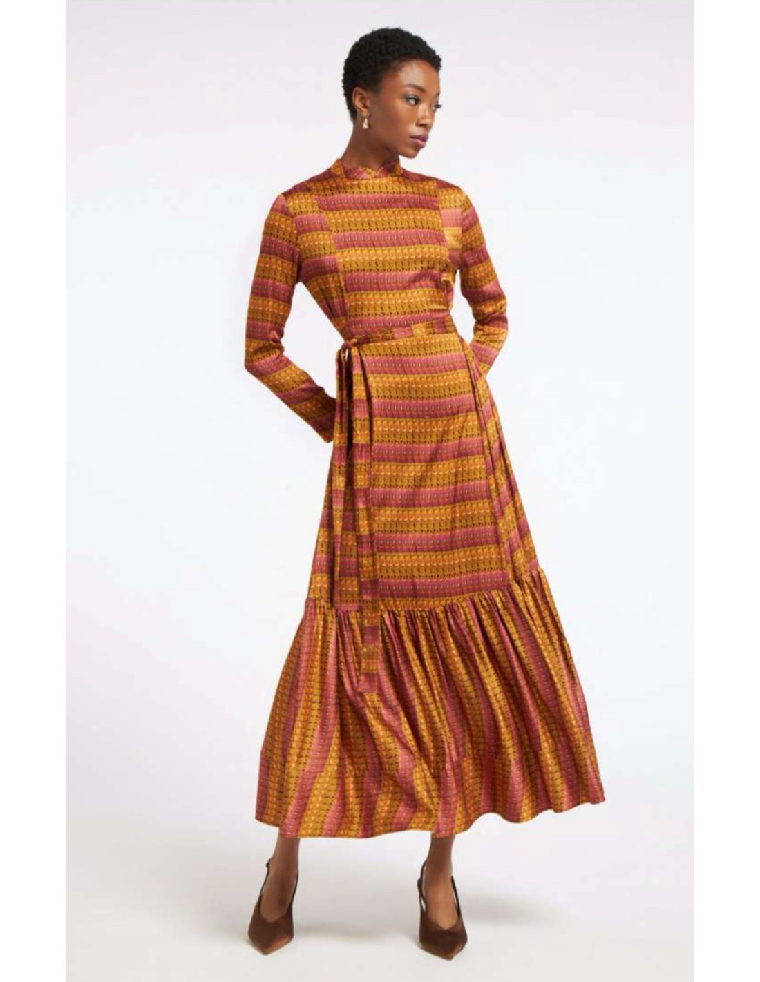 VESTIDO DE MANGA LARGA CON CUELLO ORIENTAL Y VOLANTE FRUNCIDO EN ELEGANTE ESTAMPADO EN TONOS TIERRA SOBRE FONDO COLOR CIRUELA DE LA PREMIADA ANNIE P, DISEÑADORA DE TEJIDOS Y A LA VEZ DE ESTA PRECIOSA COLECCIÓN. EL TEJIDO ESTÁ COMPUESTO DE UNA MEZCLA DE VISCOSA Y OFRECE UNA CAÍDA MUY FAVORECEDORA. MOTIVO DEL ESTAMPADO "WEAVE MULTI" 52 % VISCOSA, 45 % RAYON, 3% SPANDEX