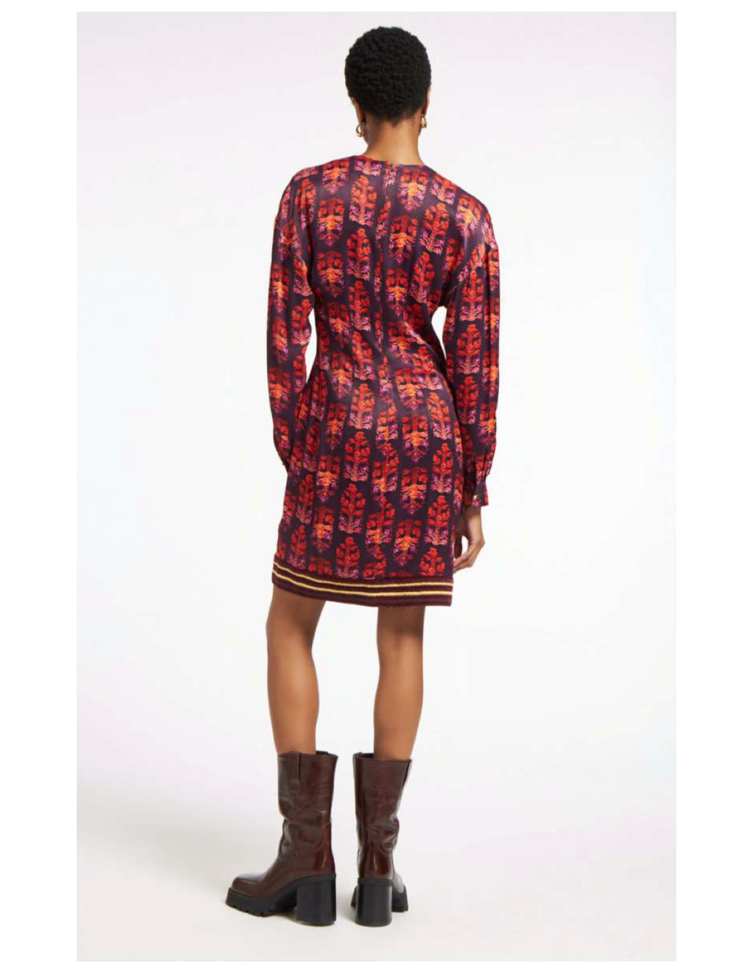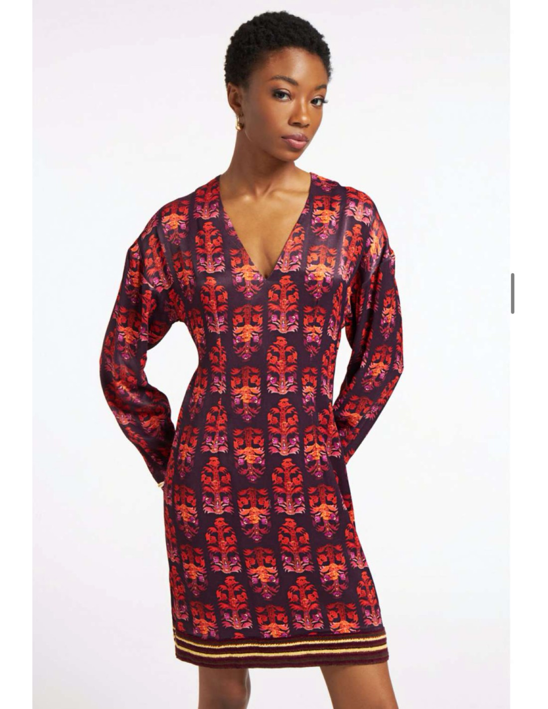 Vestido corto de silueta recta, con un aire retro y sofisticado, diseñado por Annie P, reconocida por su maestría en el diseño textil. Esta pieza destaca por su intenso tono rojo carmín y su delicado estampado "Stitches Plum", que aporta un toque poético y atemporal.