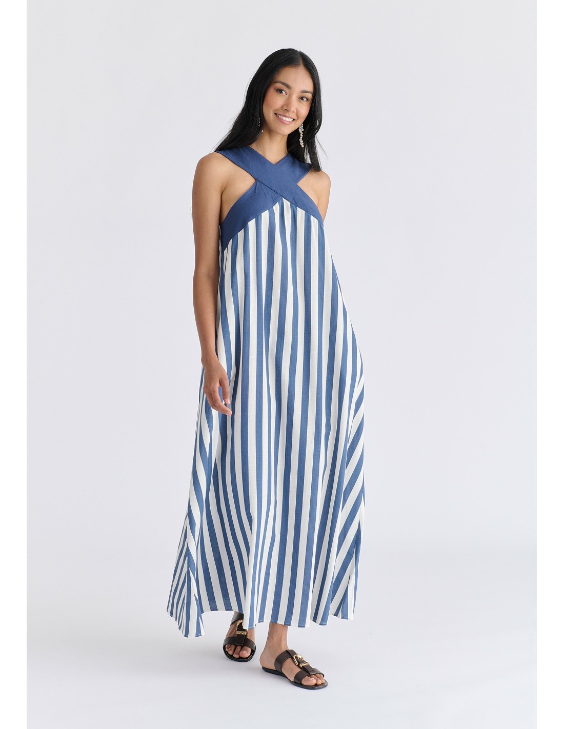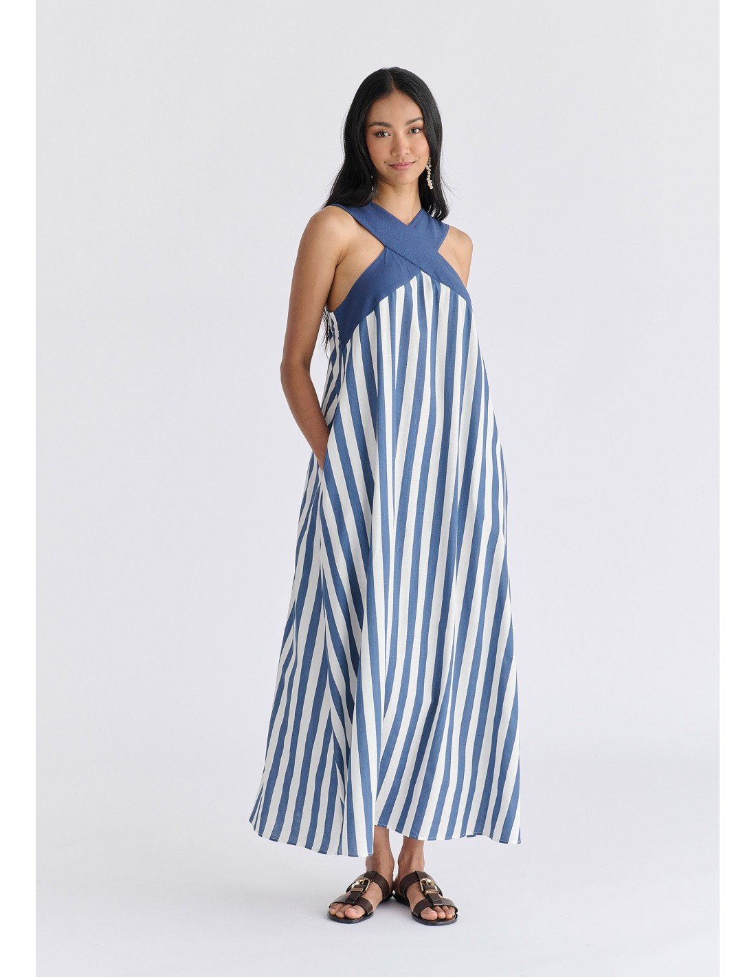 VESTIDO LARGO CON CUELLO HALTER Y TIRANTES CRUZADOS COMPOSICIÓN: 70% ALGODÓN 30%VISCOSA - 80% VISCOSA 20% LINO