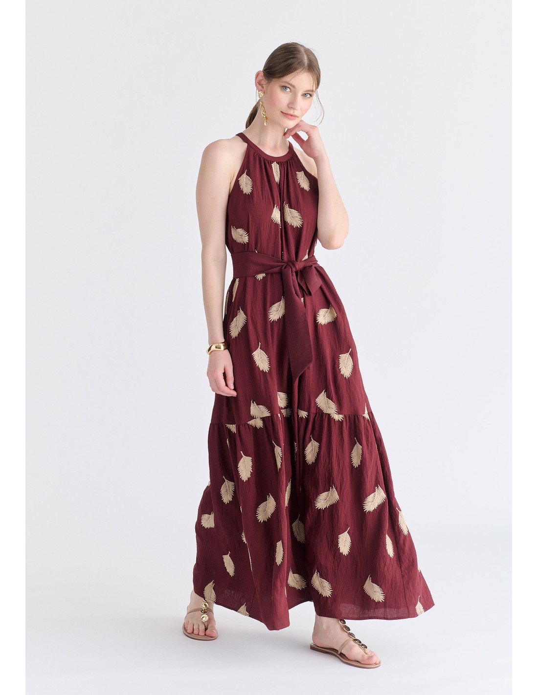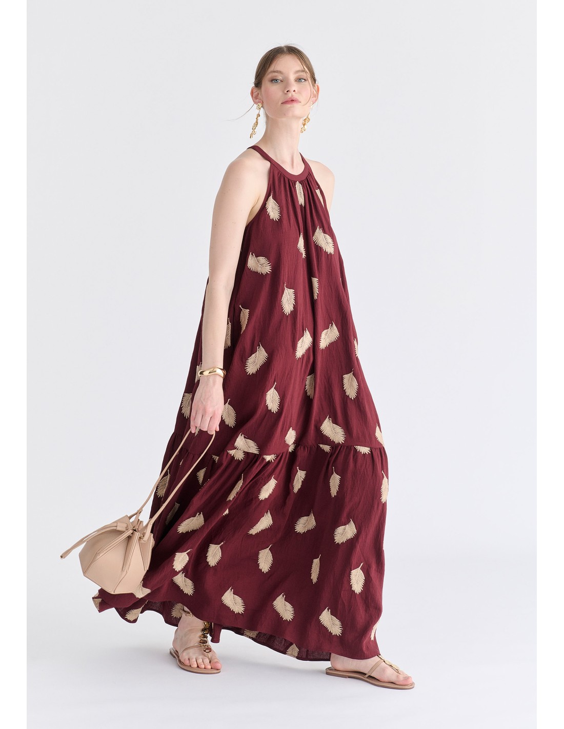 El cuello halter estiliza los hombros y el escote, mientras que el corte amplio garantiza comodidad y una silueta ligera y femenina.
