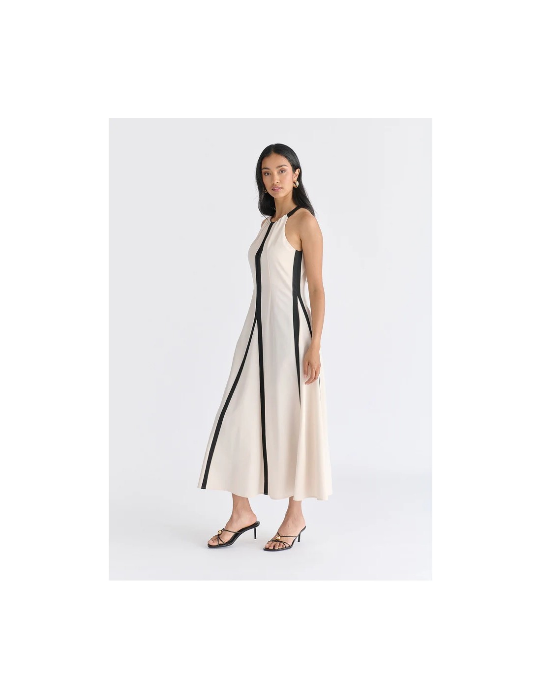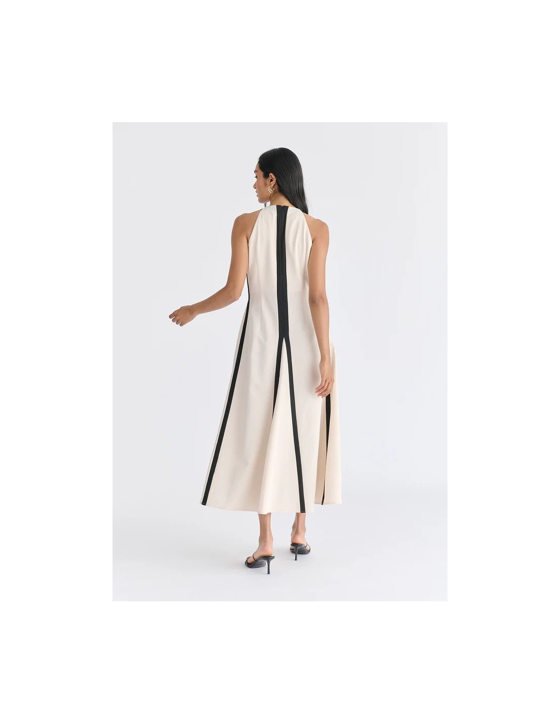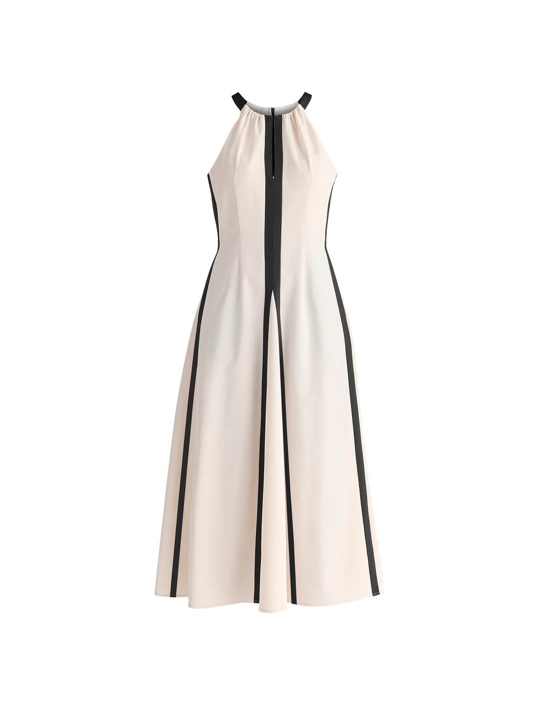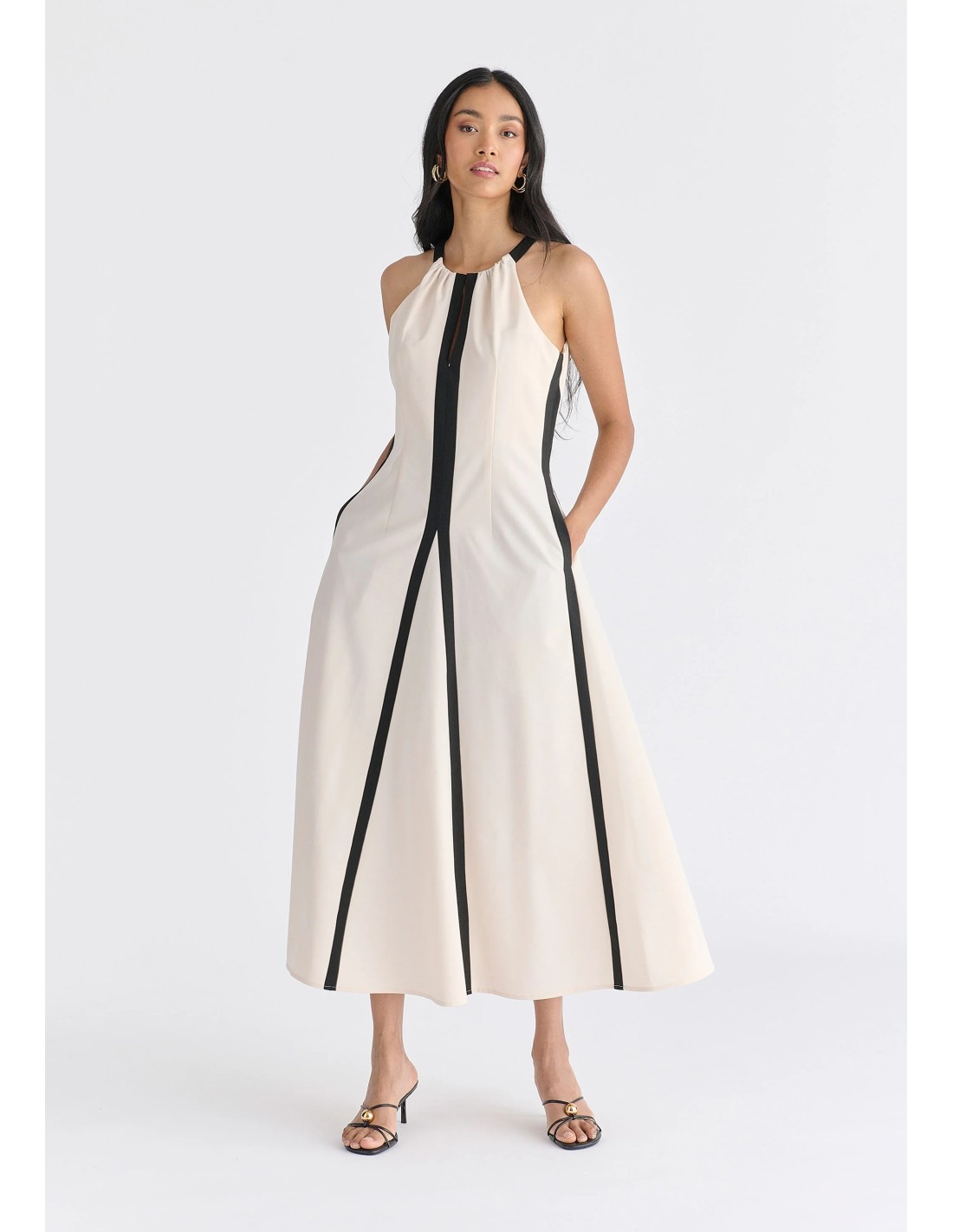 Vestido midi con cuello halter y detalles en contraste
