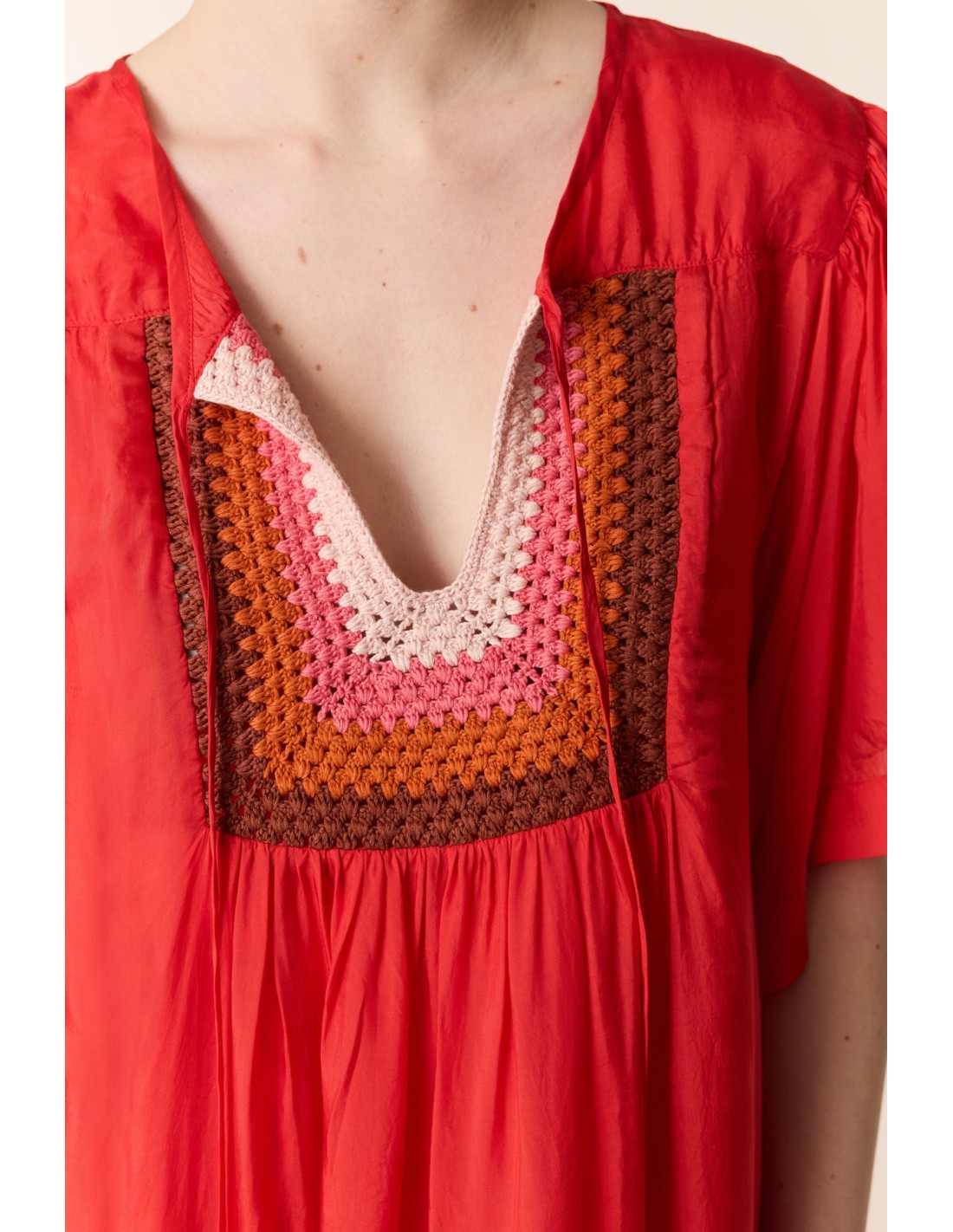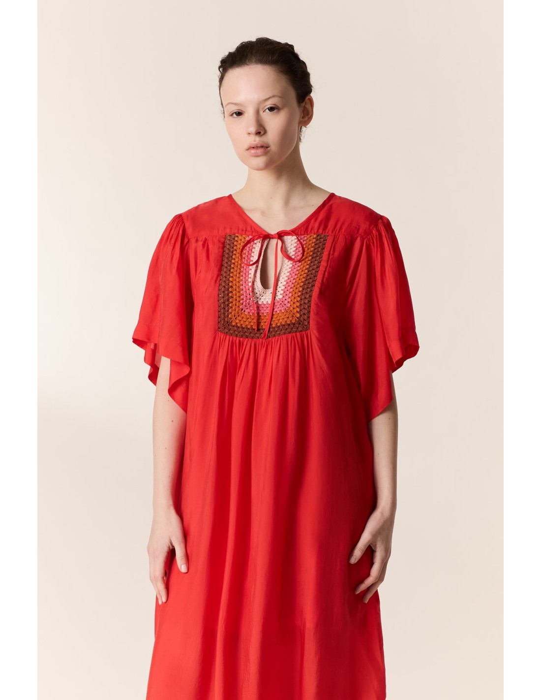 El Vestido Rival de Leon & Harper seduce con su espíritu bohemio y su caída fluida que viste la silueta con ligereza. Realizado en delicado tejid de viscosa con aspecto de seda, este vestido tiene un escote iluminado por un canesú de crochet multicolor tejido artesanalmente. Una pieza icónica, ideal para acompañarte durante todo el verano, de la mañana a la noche, con un par de sandalias.