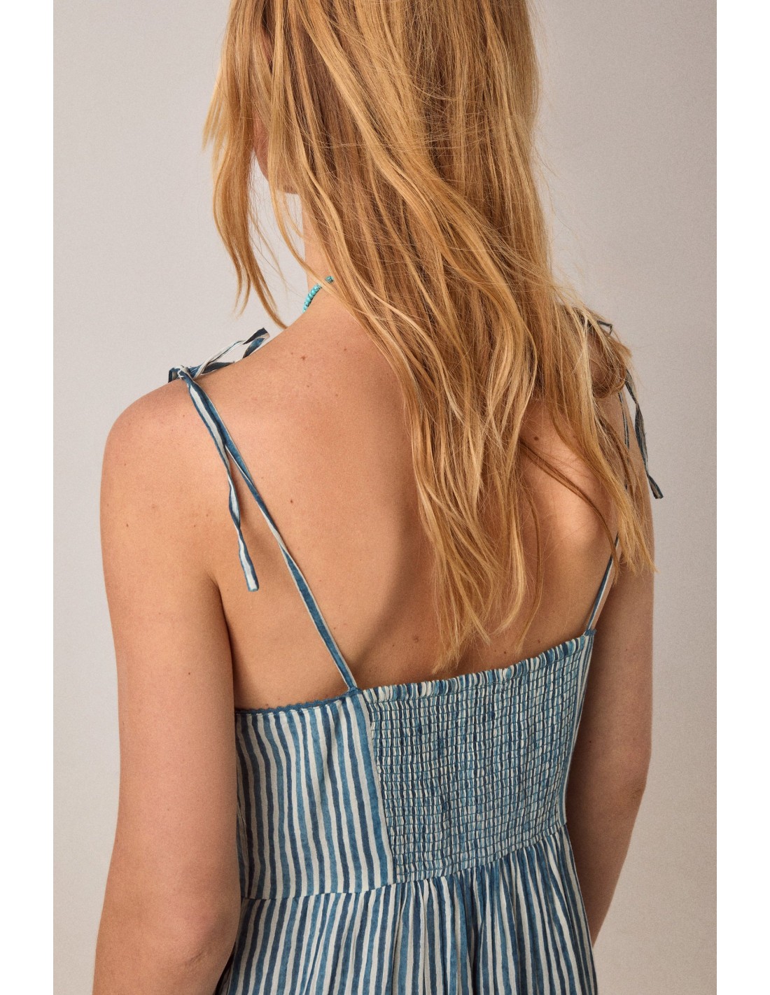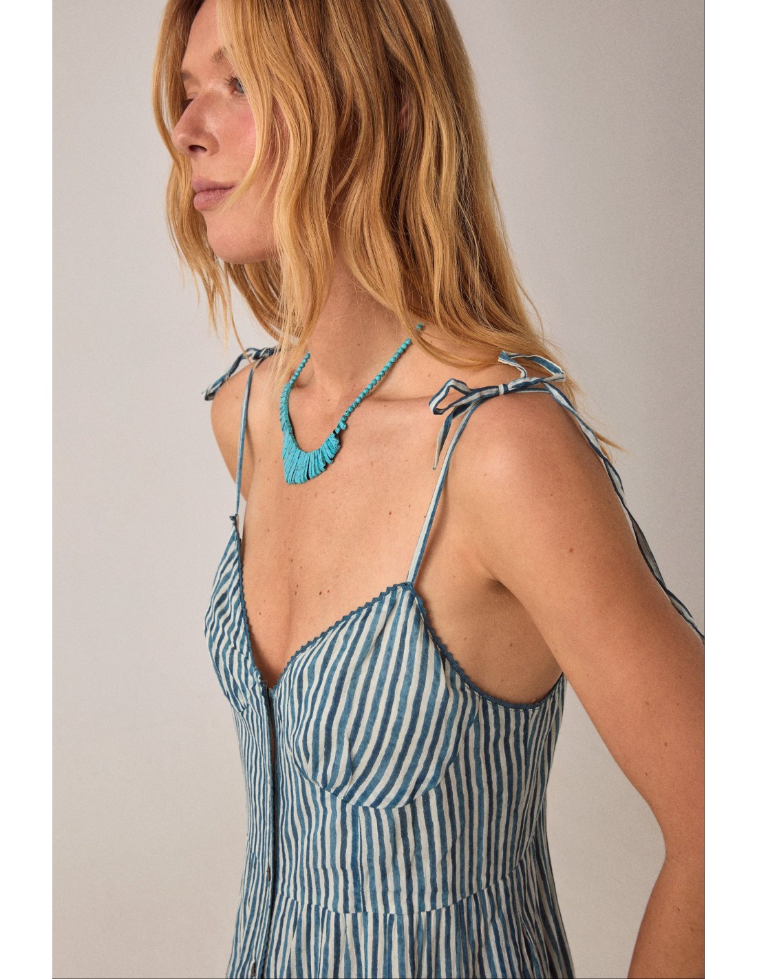 Rayas verticales turquesa y marfil con ribetes estampados en la cintura y el bajo.